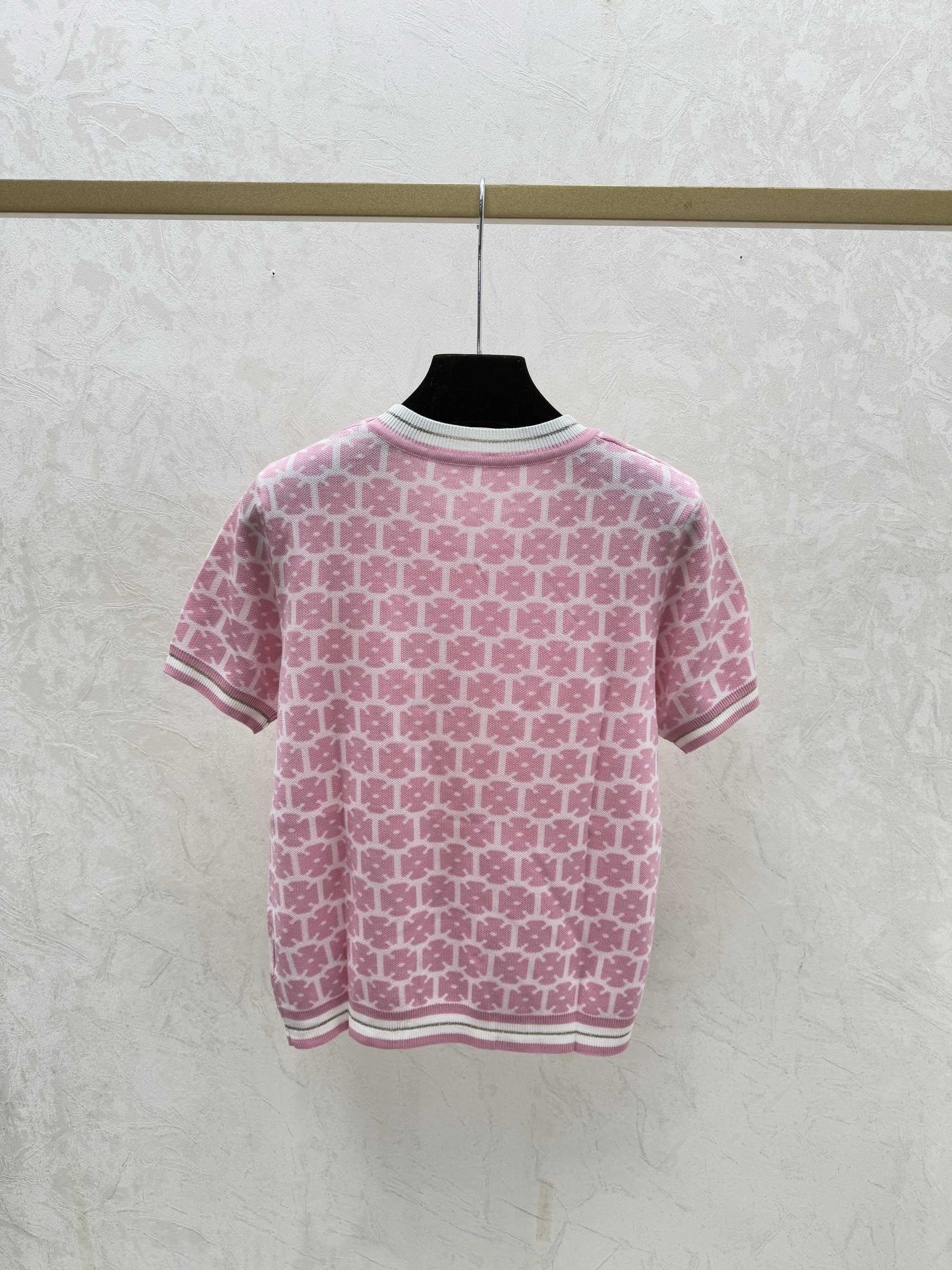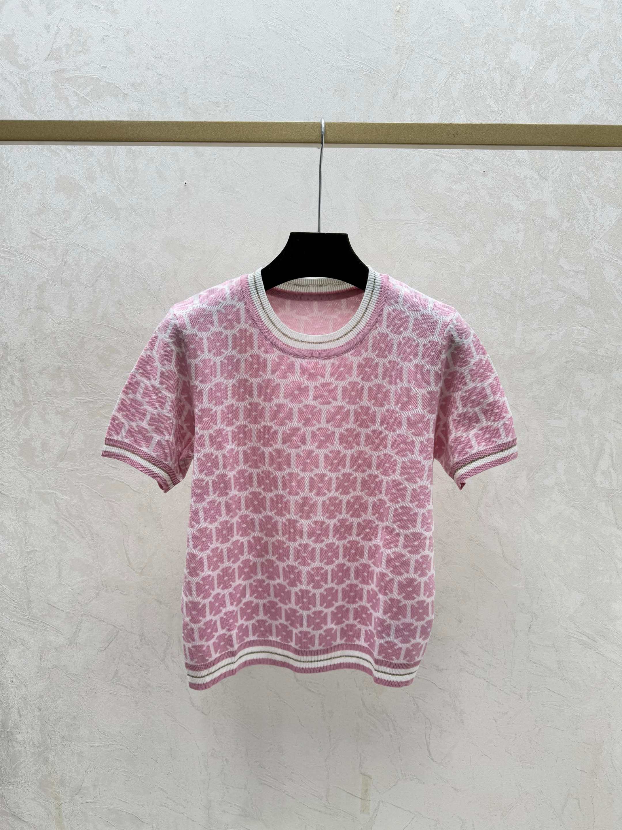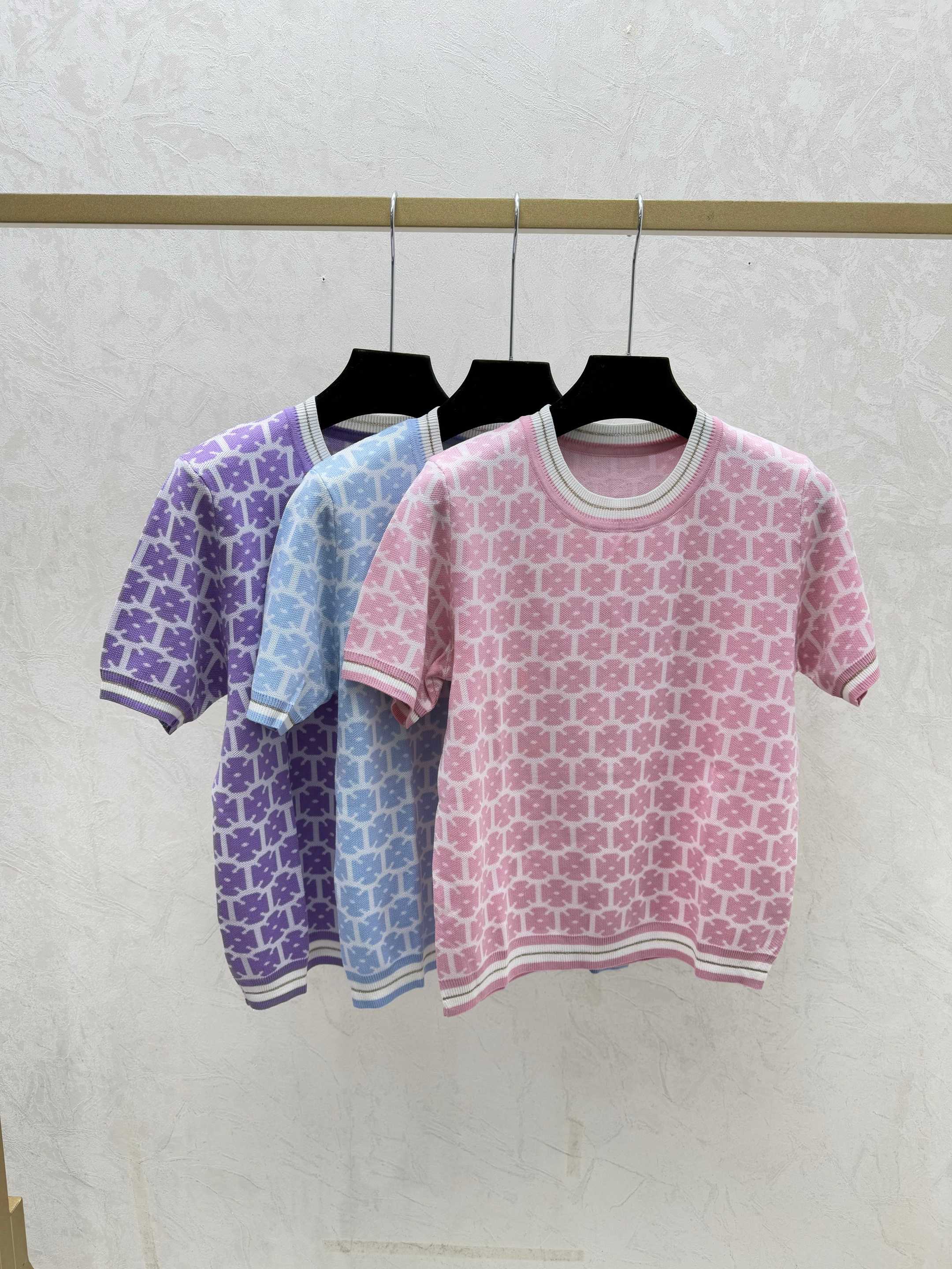 Details: Early spring color-blocked simple round-neck knitted short-sleeved top in pink, blue or purple. Available in sizes 36, 38, 40. fine craftsmanship.