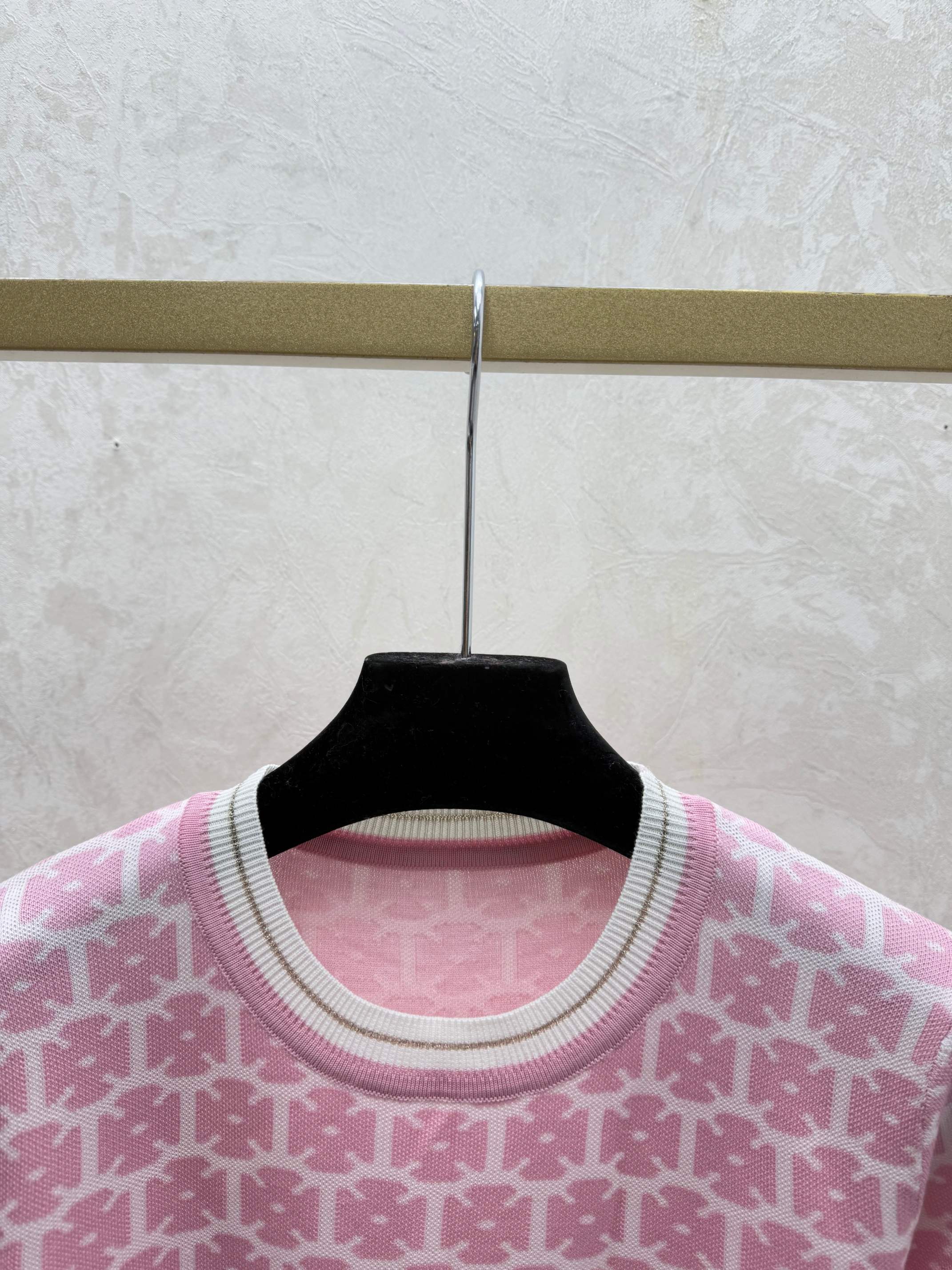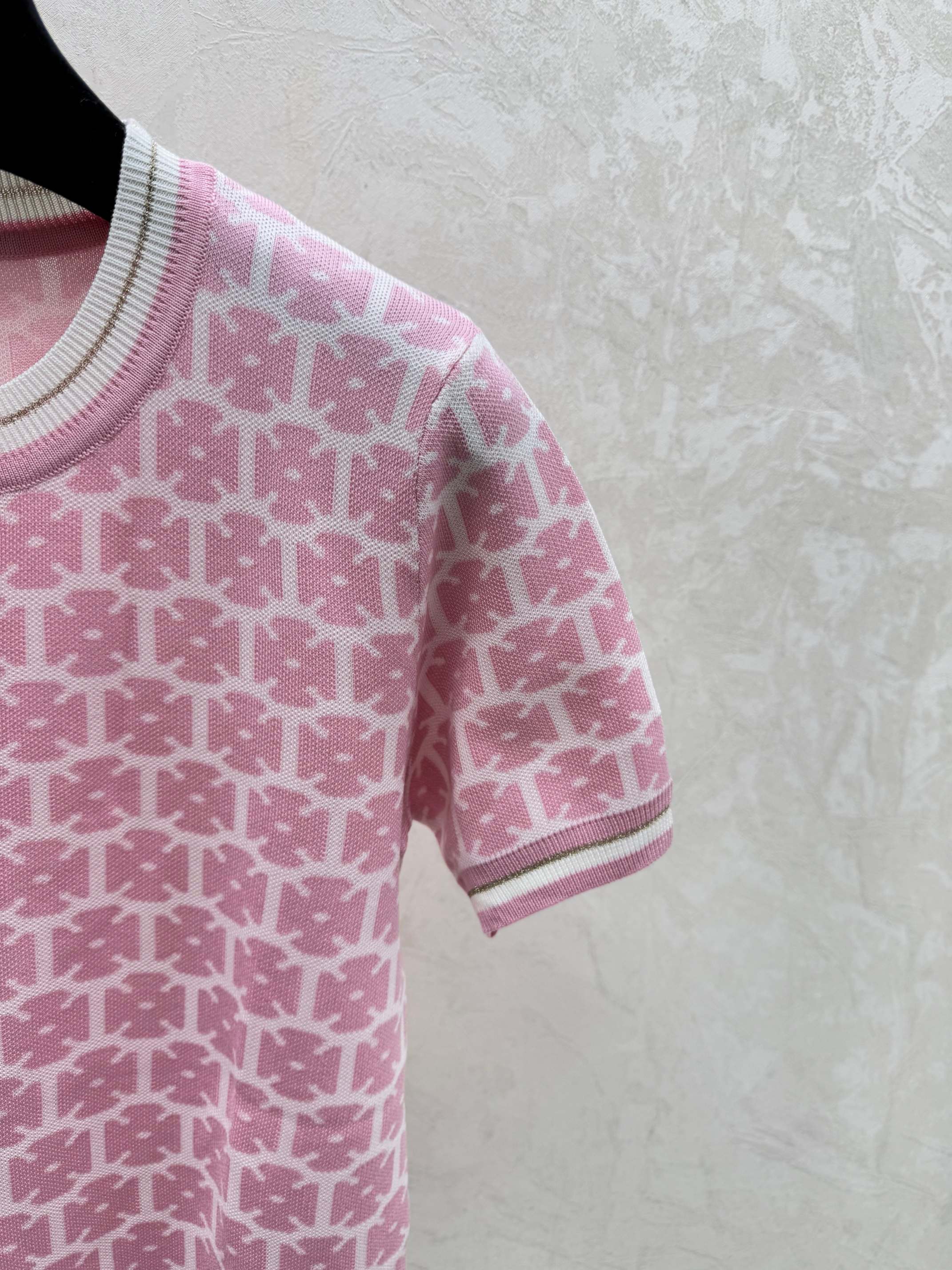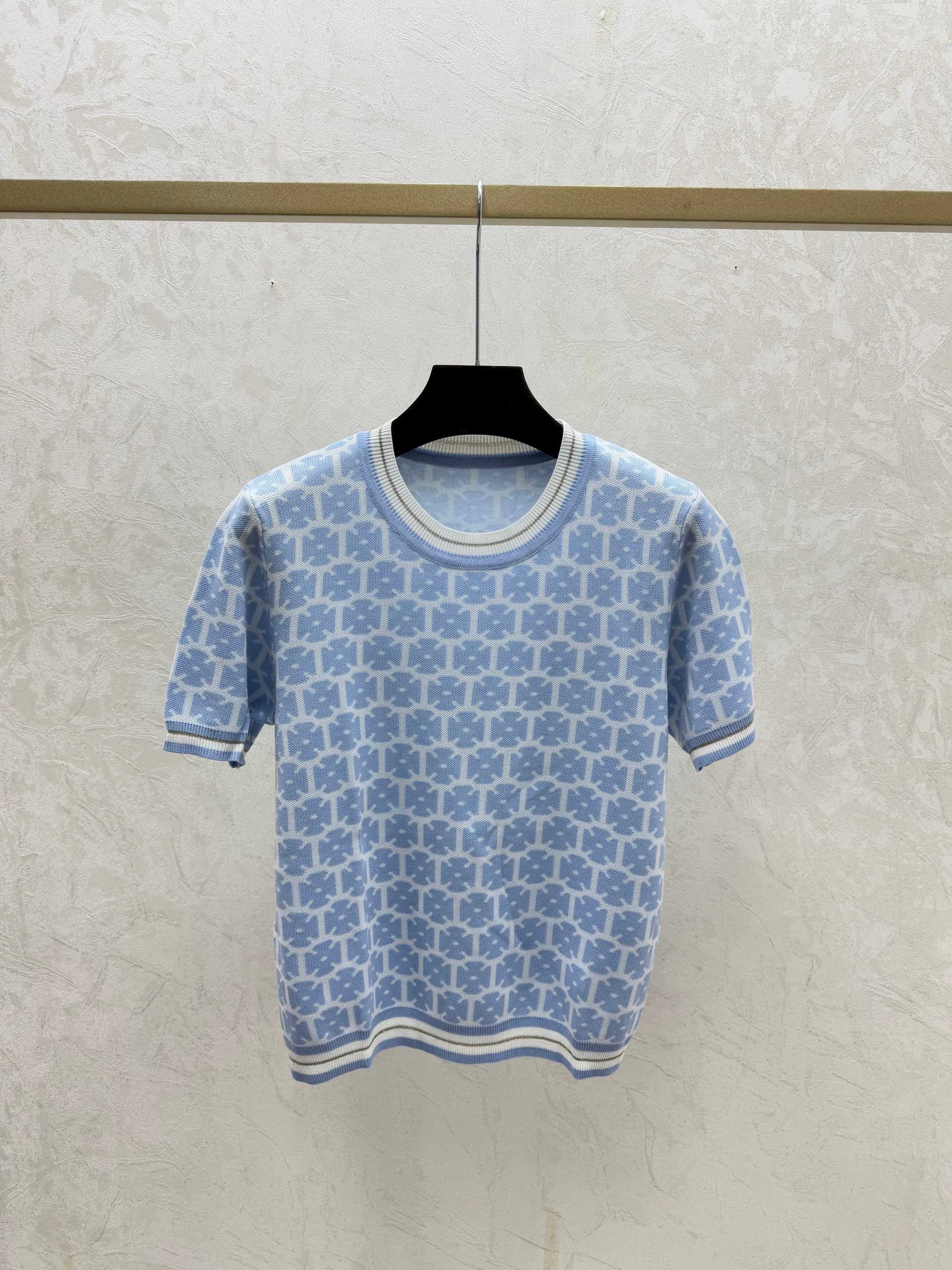 Details: Early spring color-blocked simple round-neck knitted short-sleeved top in pink, blue or purple. Available in sizes 36, 38, 40. fine craftsmanship.