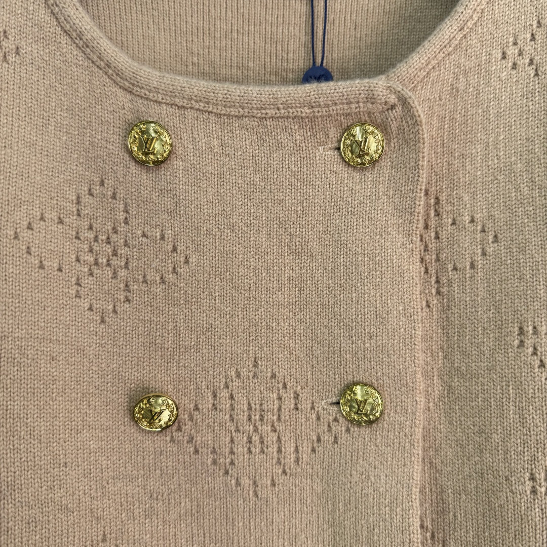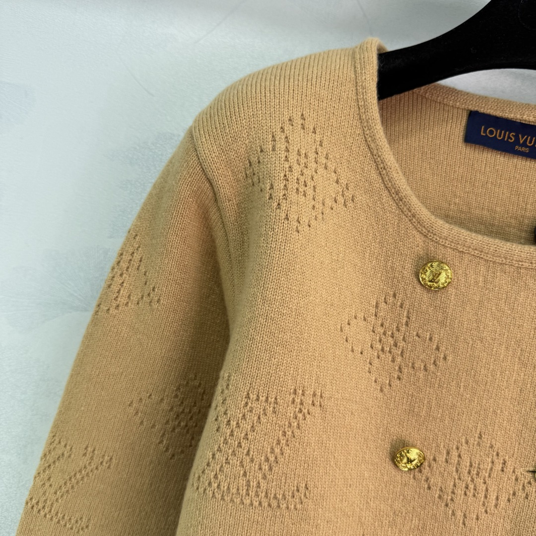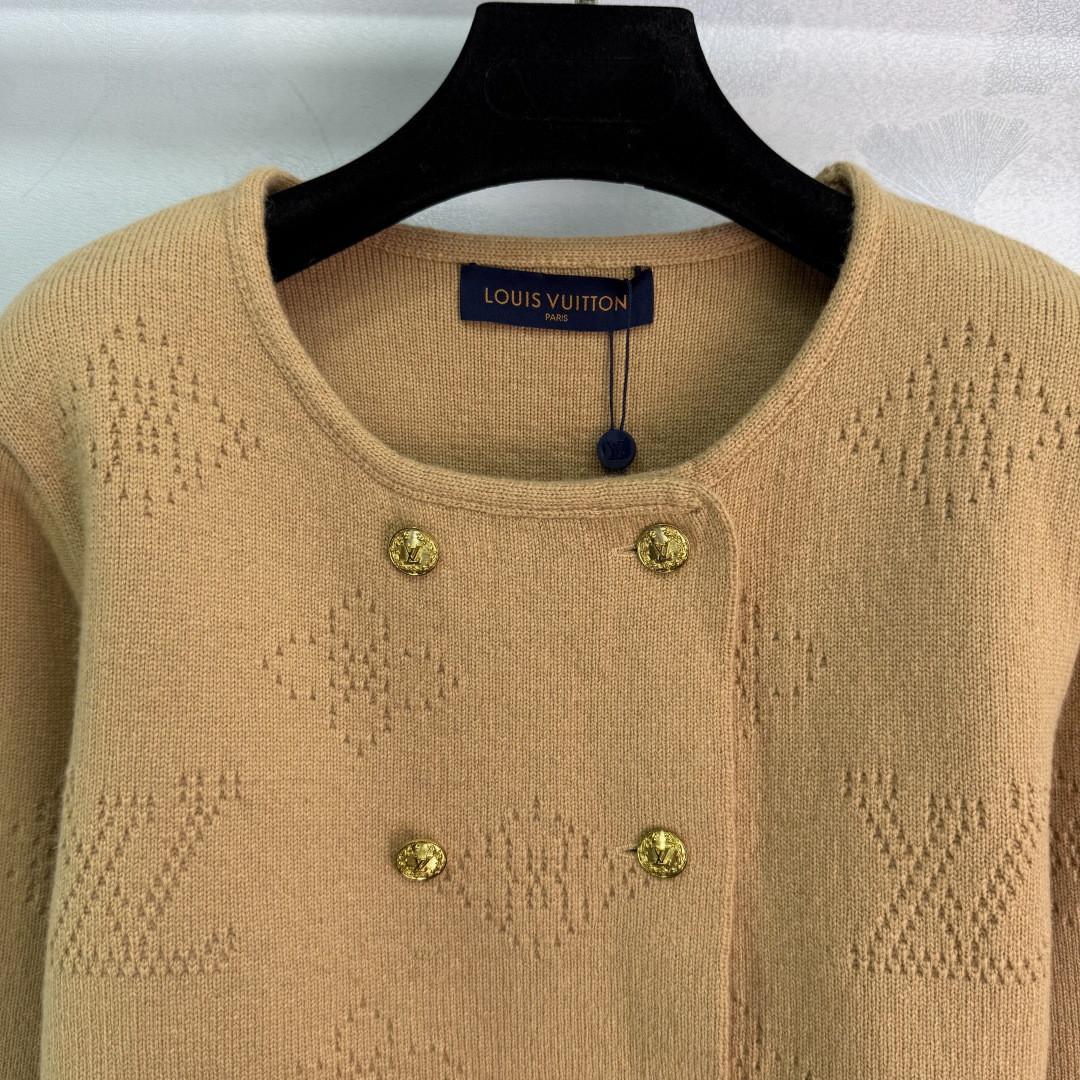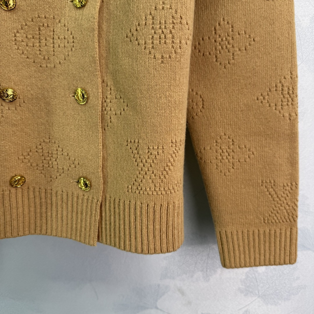 Details: Autumn and winter double-breasted knitted cardigan with gold buttons and logo design, showing unique taste.