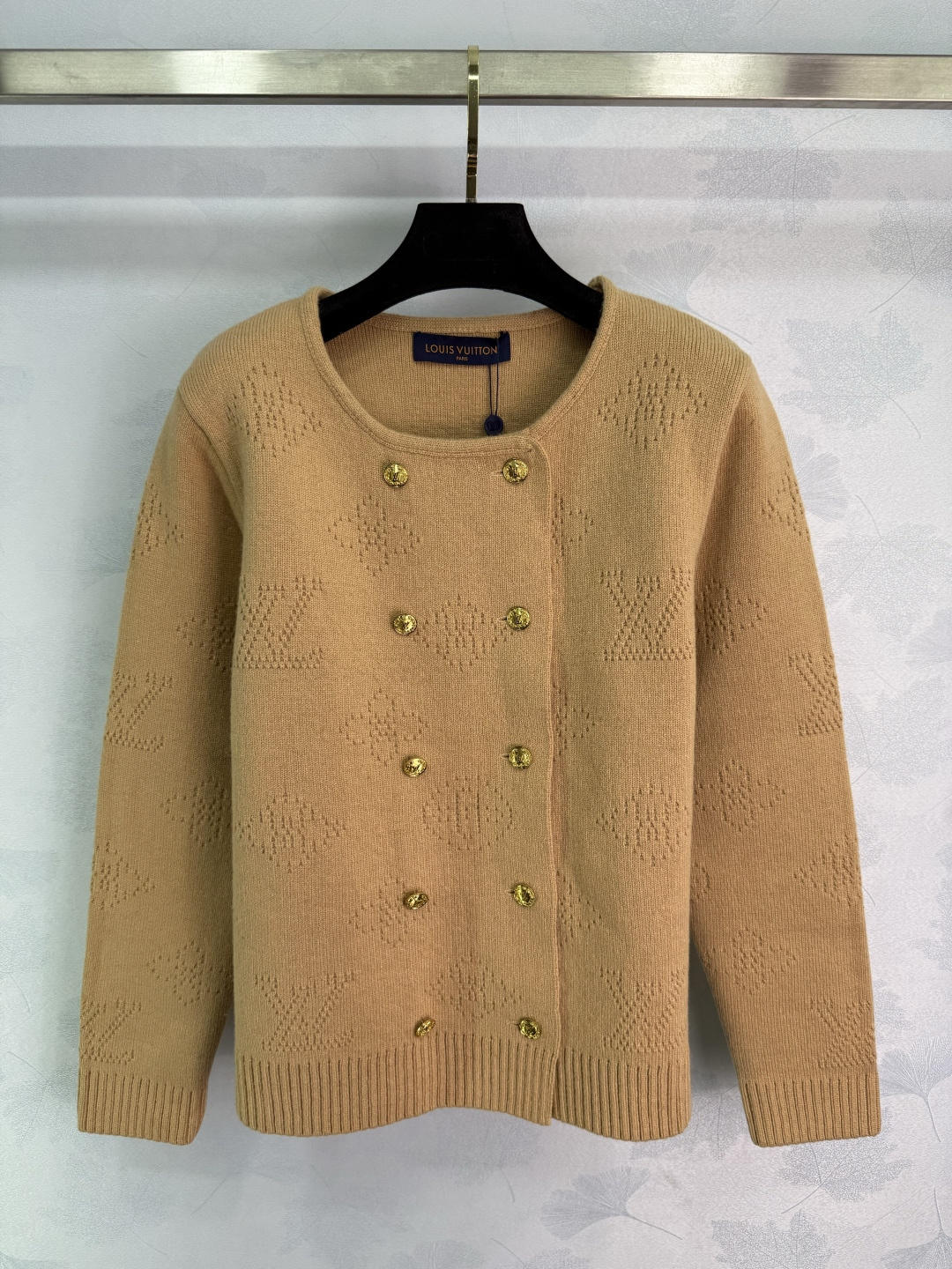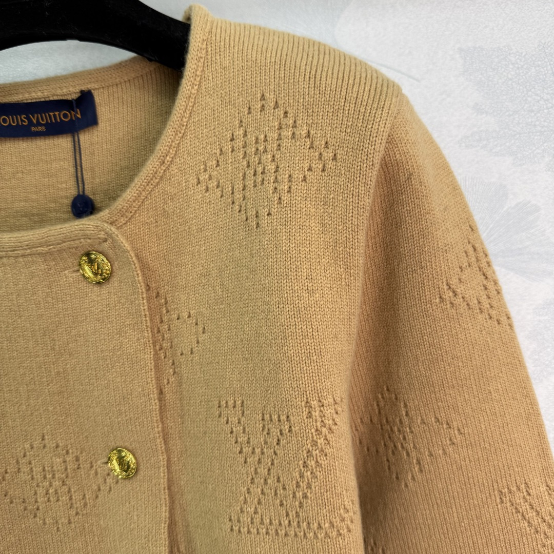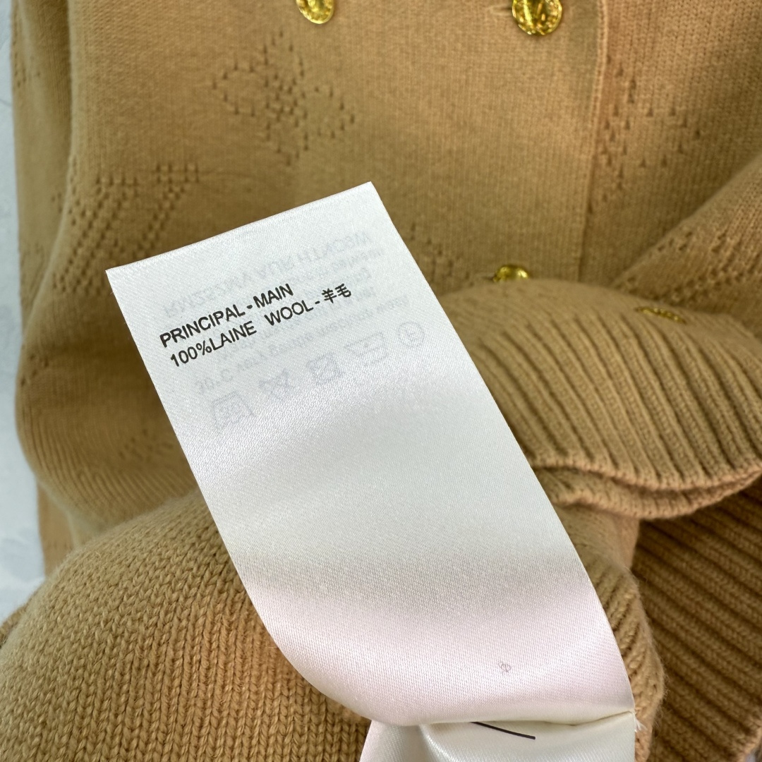 Details: Autumn and winter double-breasted knitted cardigan with gold buttons and logo design, showing unique taste.