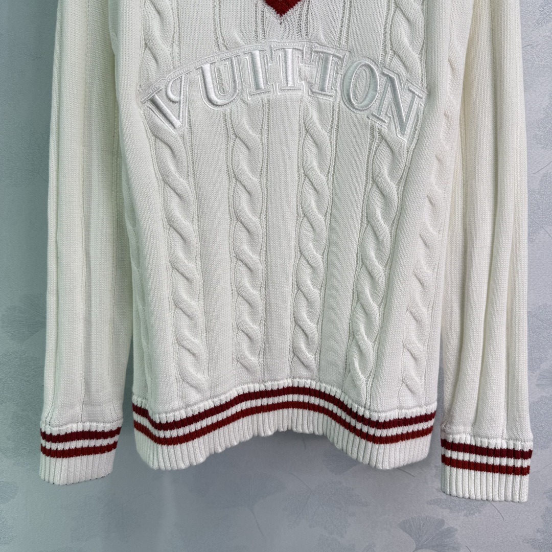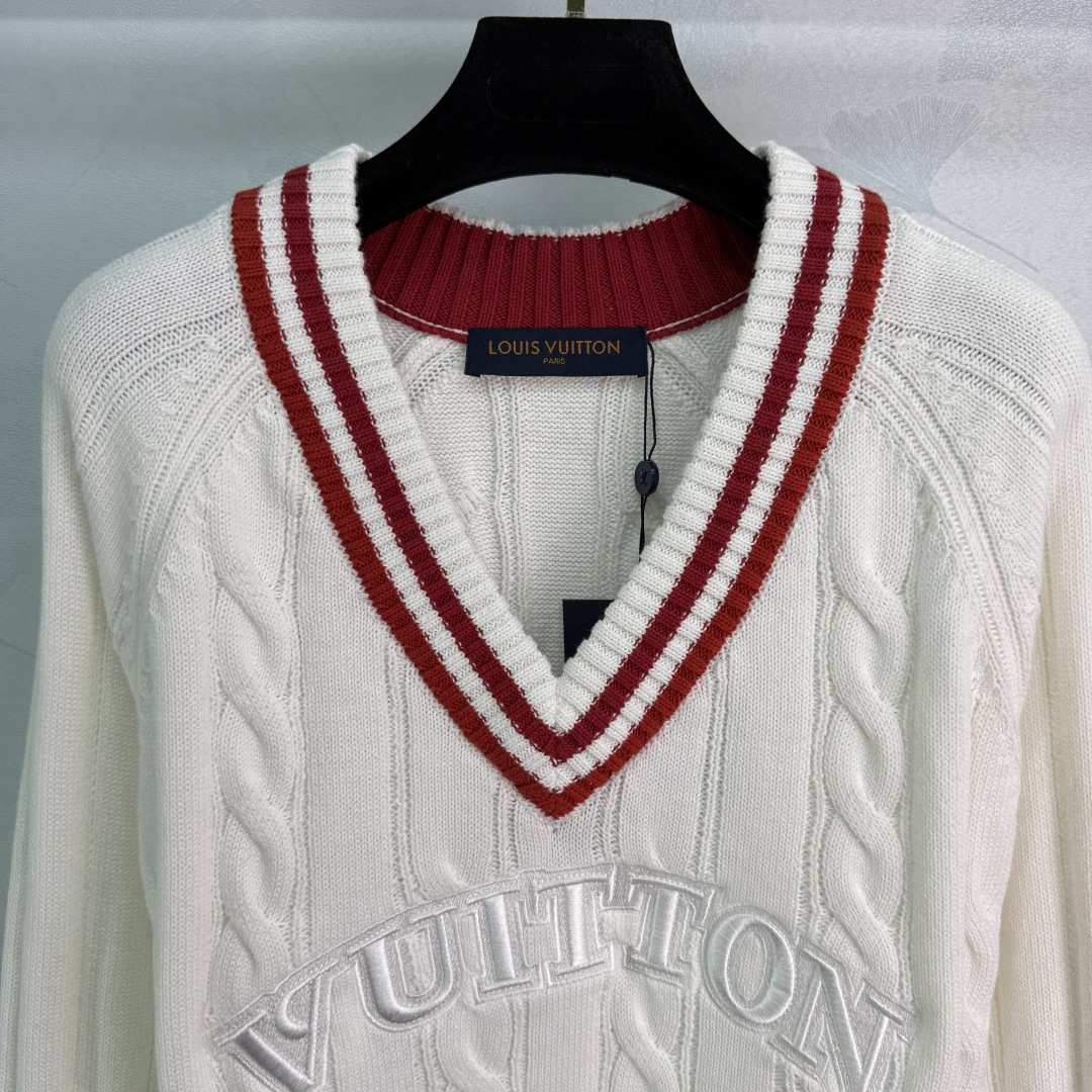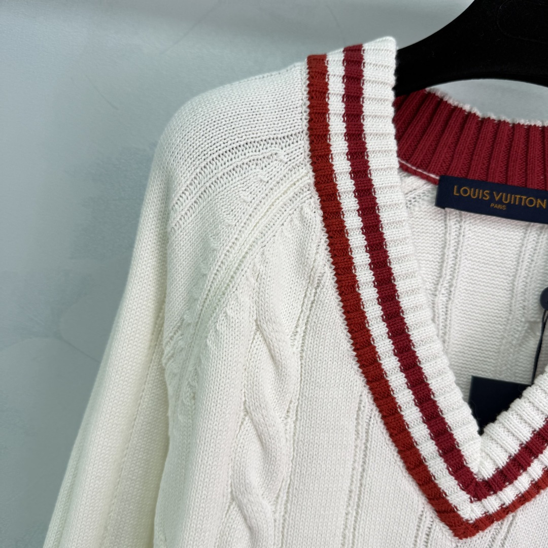 Details: College-style V-neck sweater with red and white stripes and embroidered letters, made of comfortable cotton fabric.