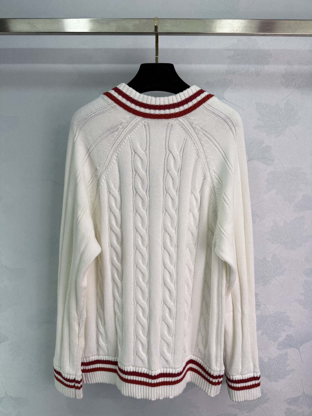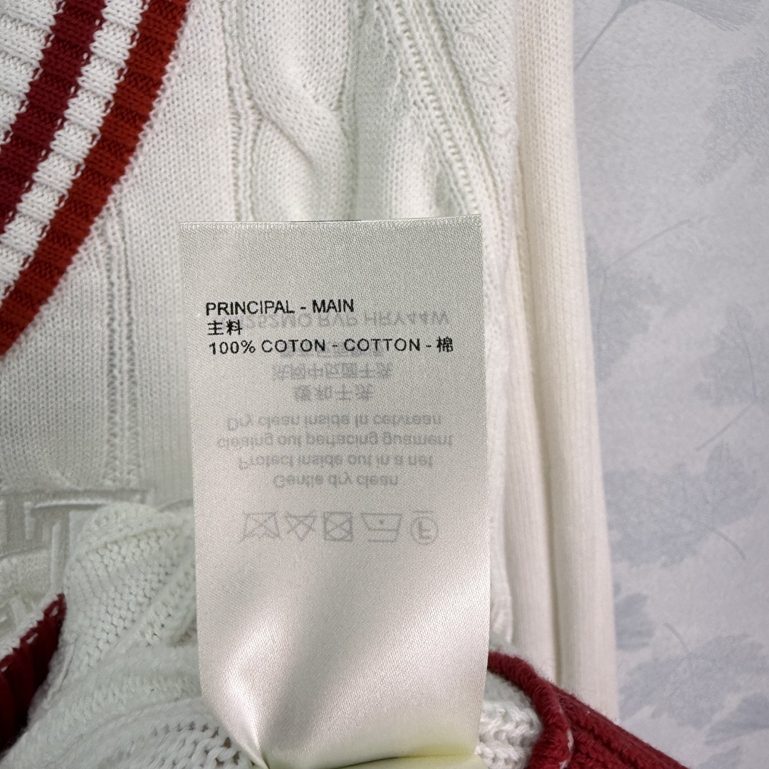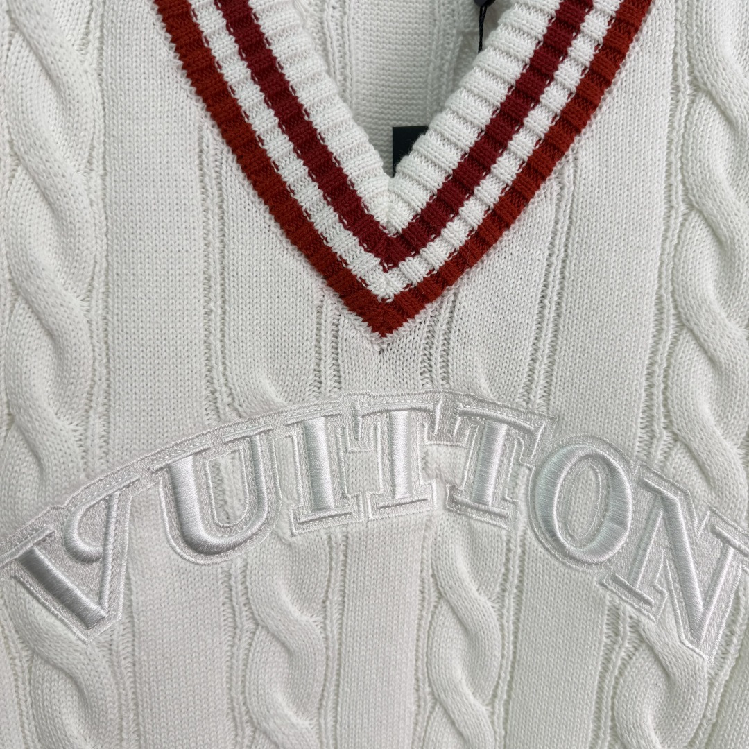 Details: College-style V-neck sweater with red and white stripes and embroidered letters, made of comfortable cotton fabric.