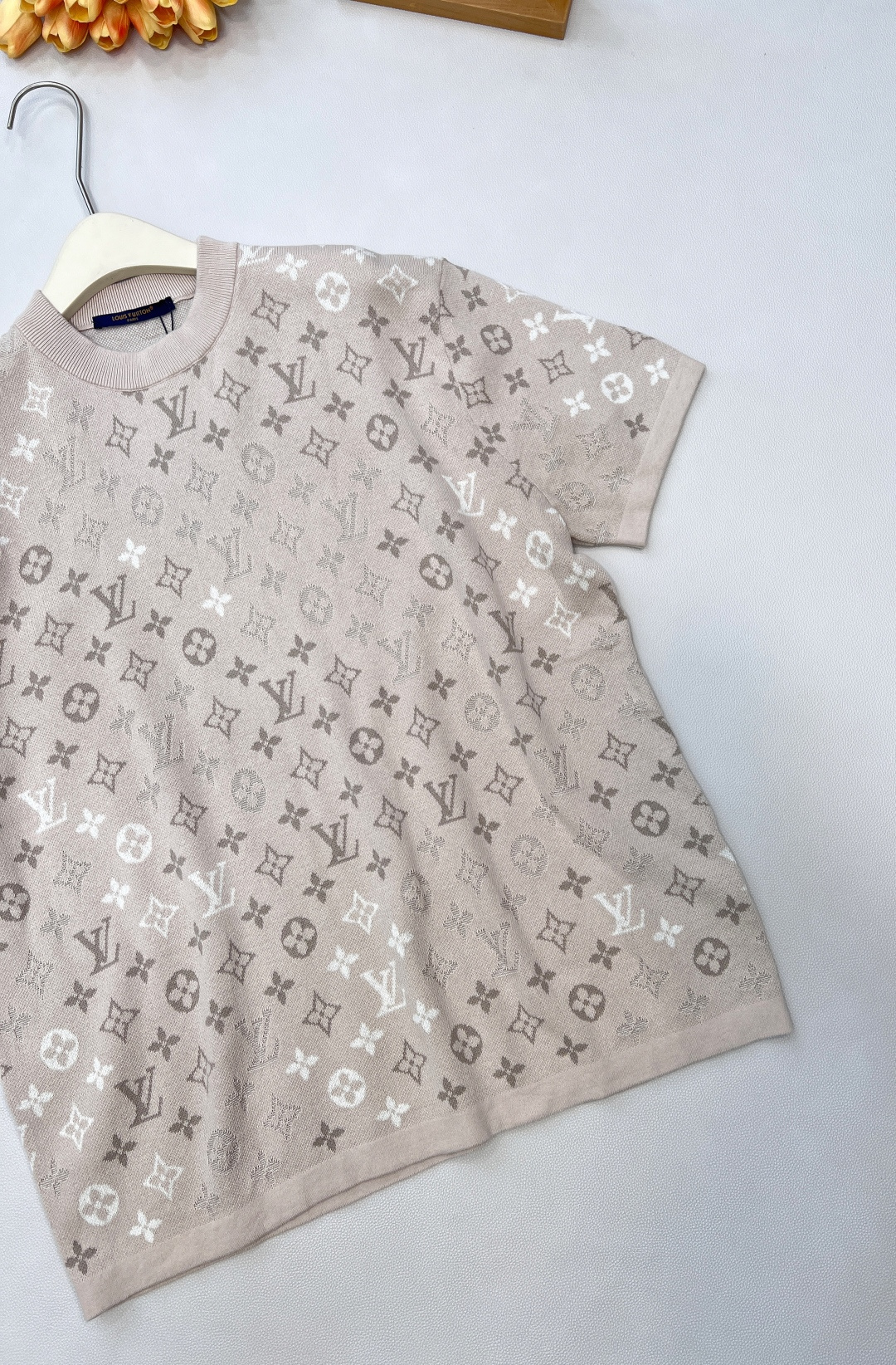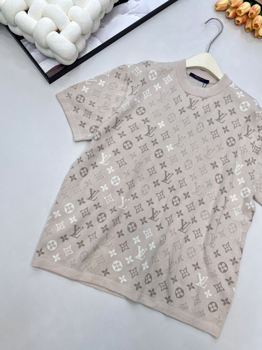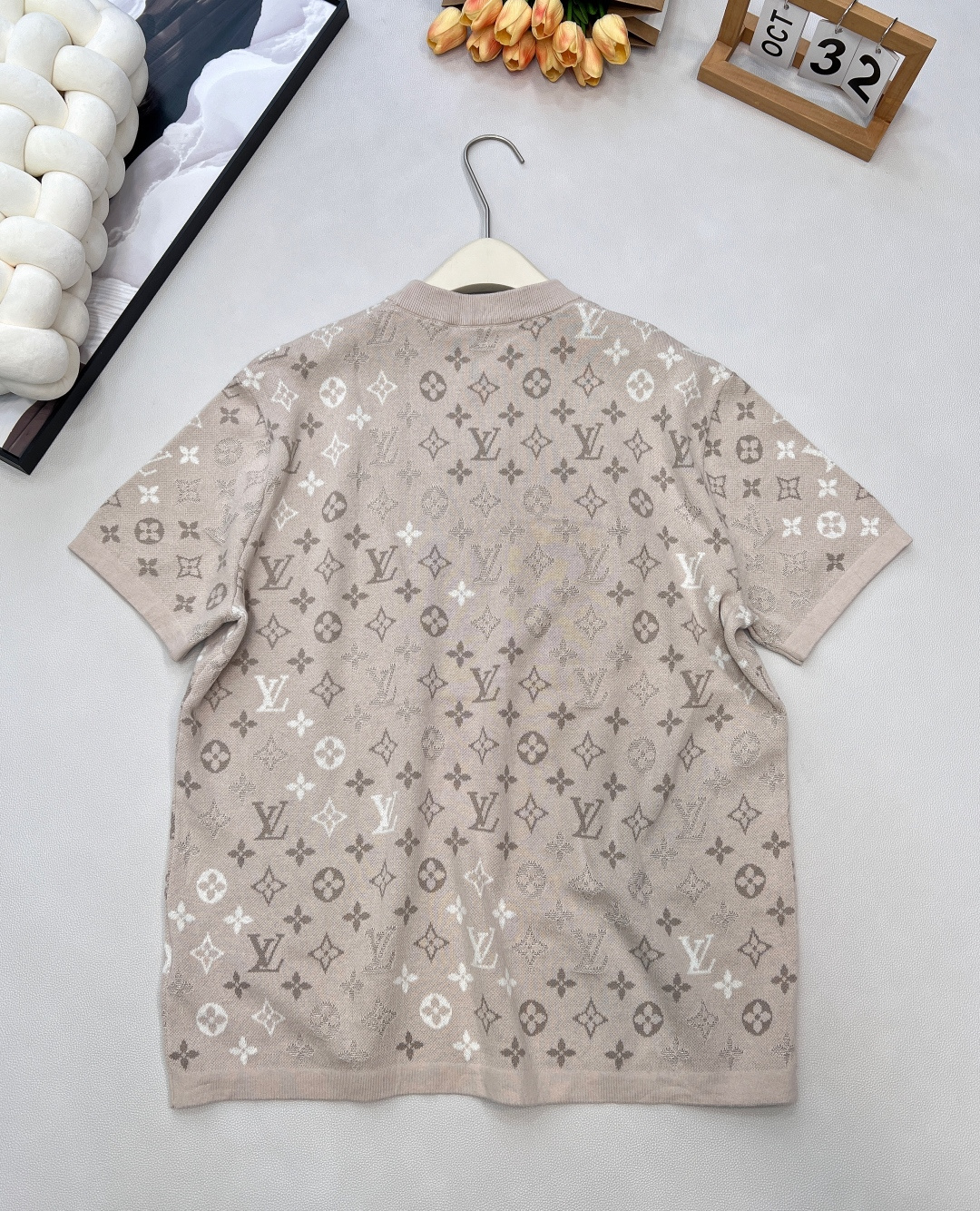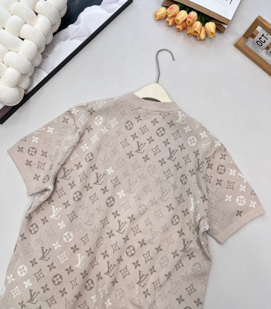 Details: Knitted short-sleeved top with letter jacquard, two-color collision, comfortable and fashionable.