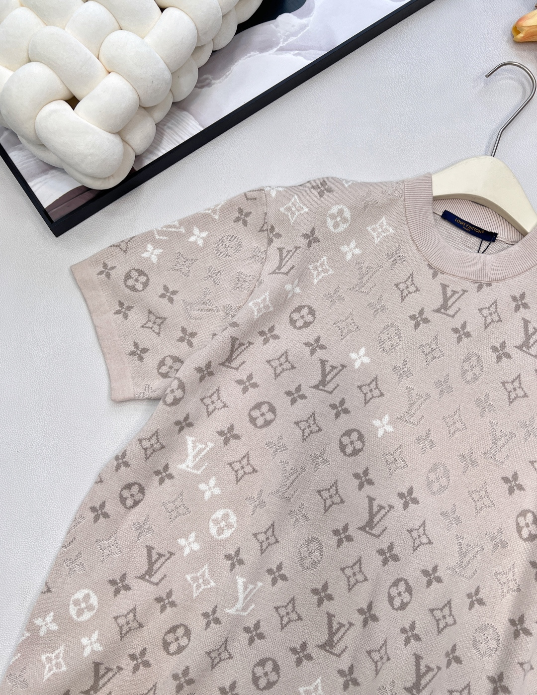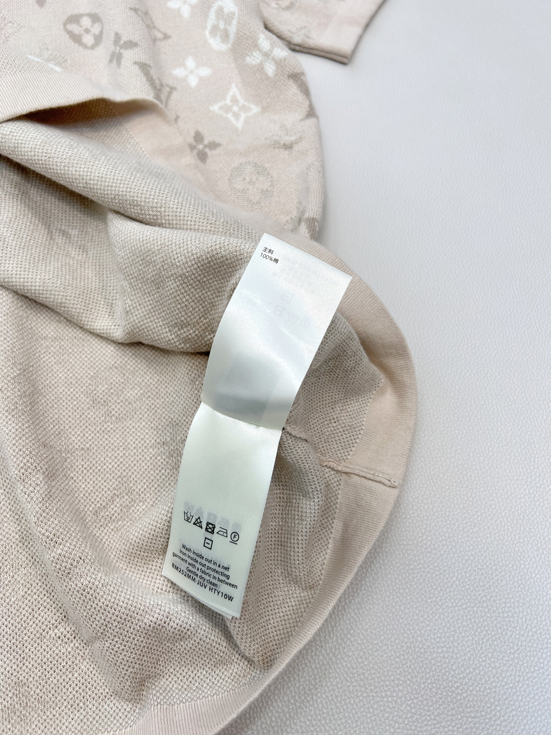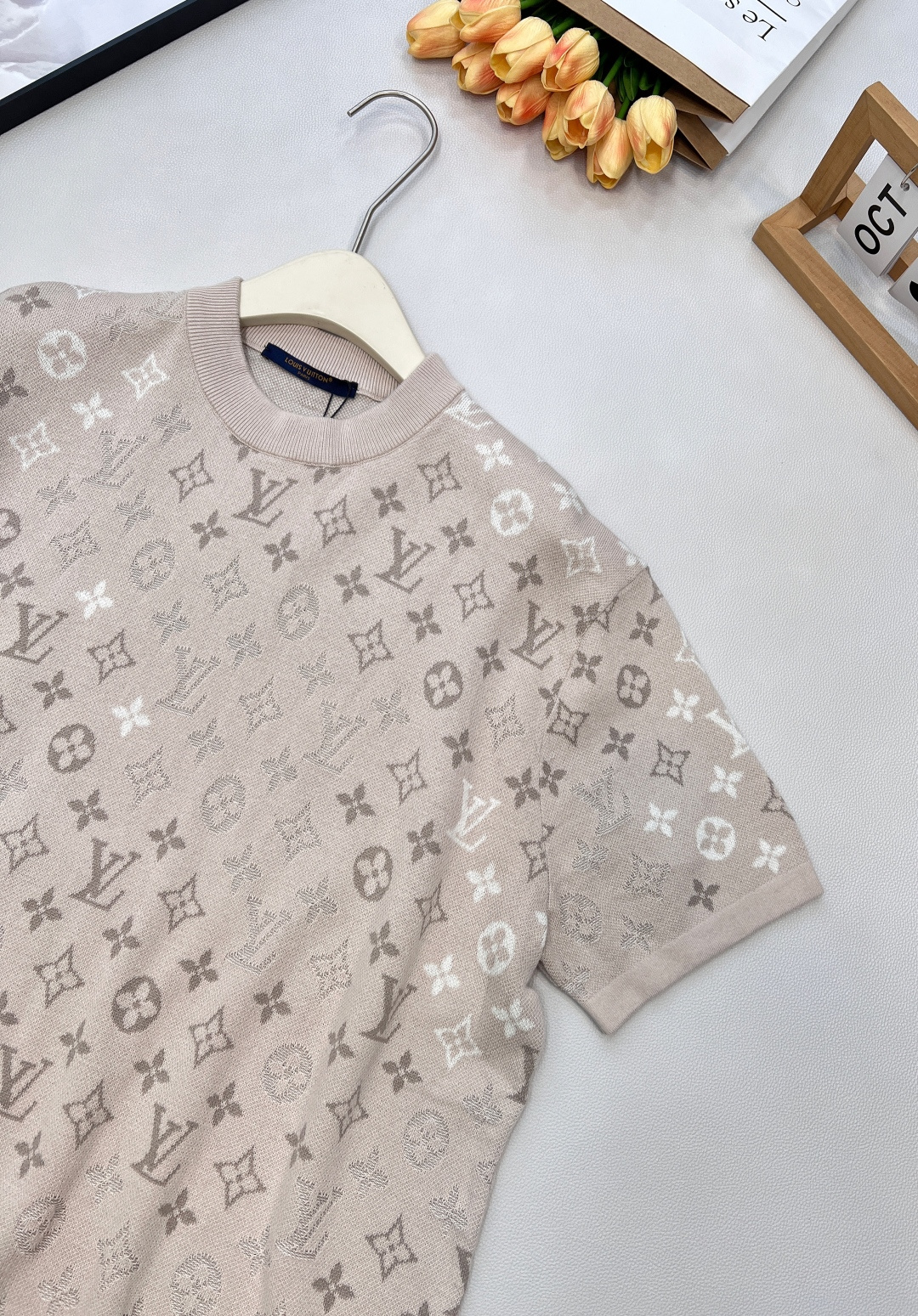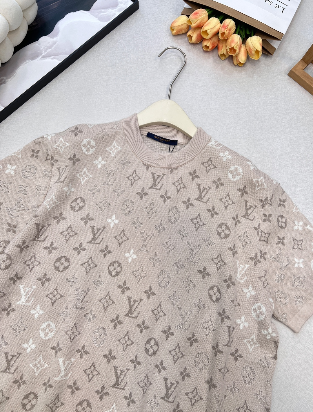 Details: Knitted short-sleeved top with letter jacquard, two-color collision, comfortable and fashionable.