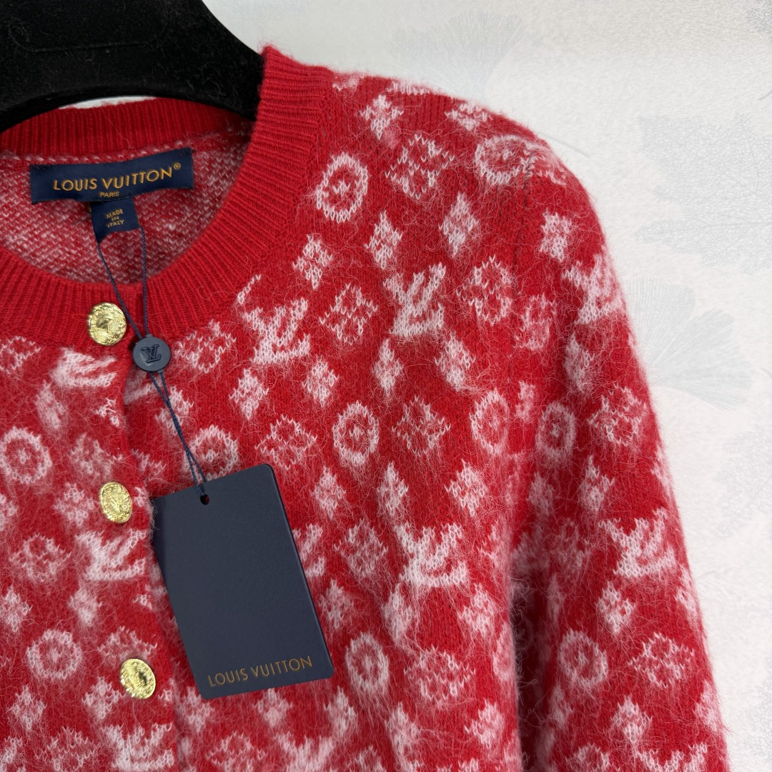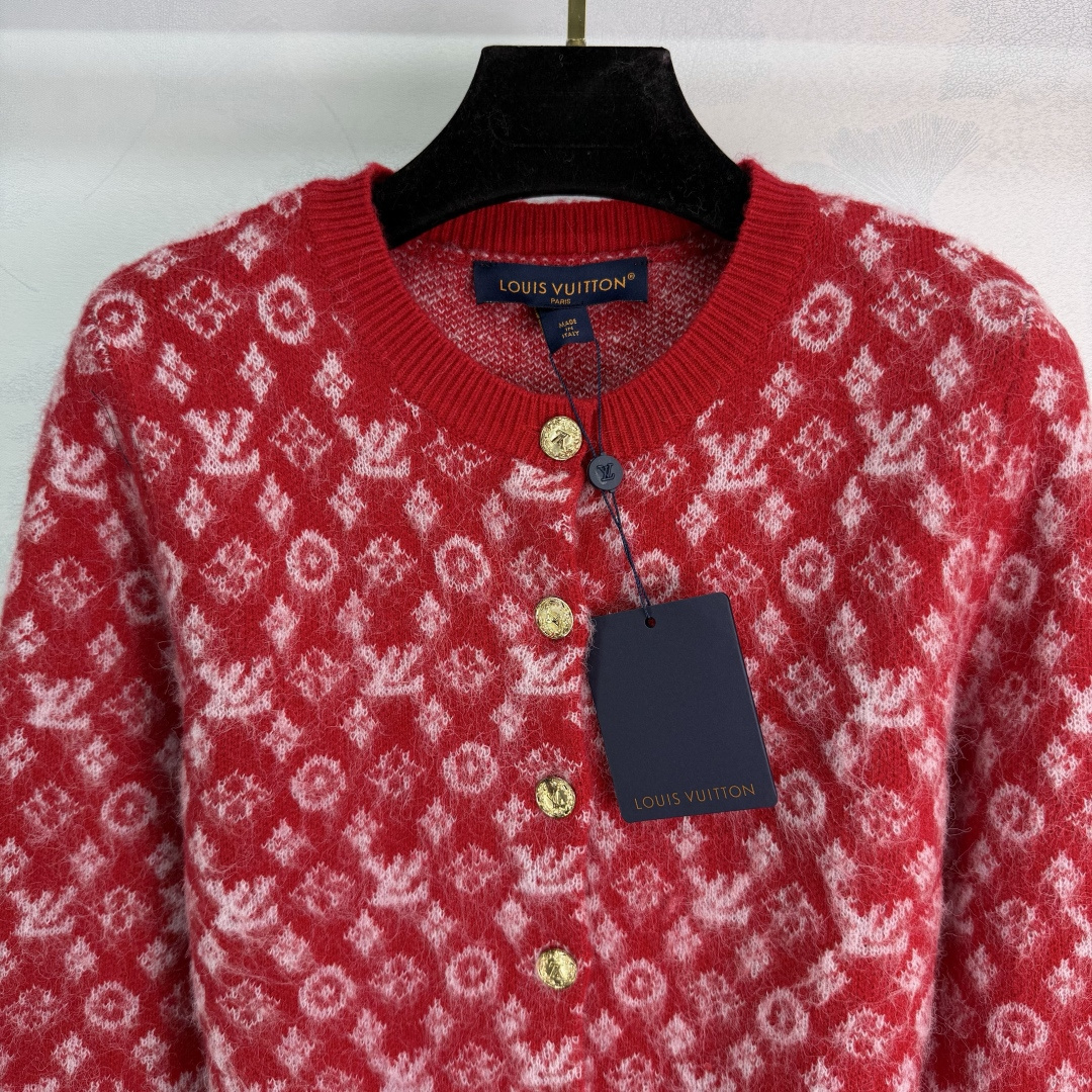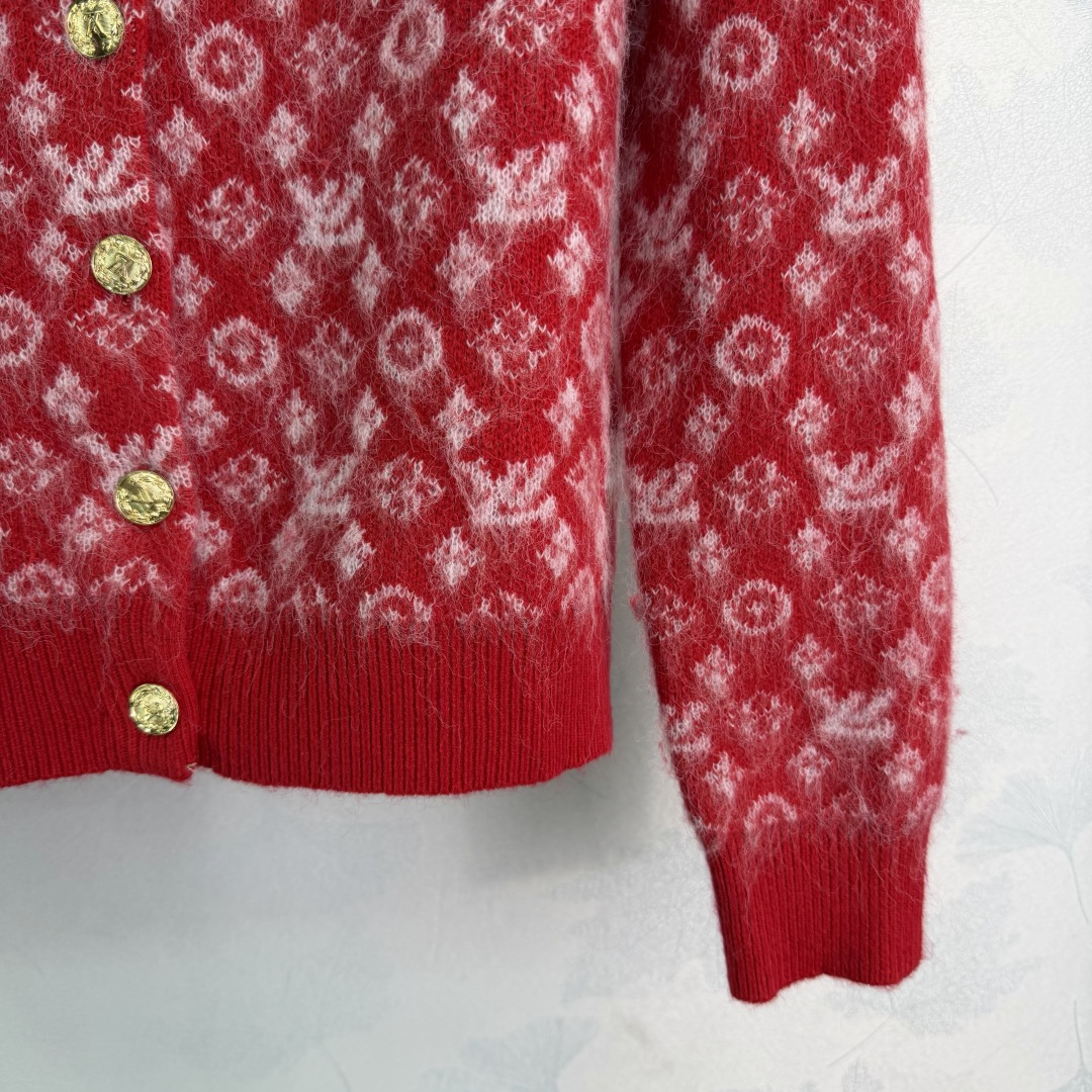 Details: New knitted Christmas-themed open-front sweater with logo jacquard and metal buttons.