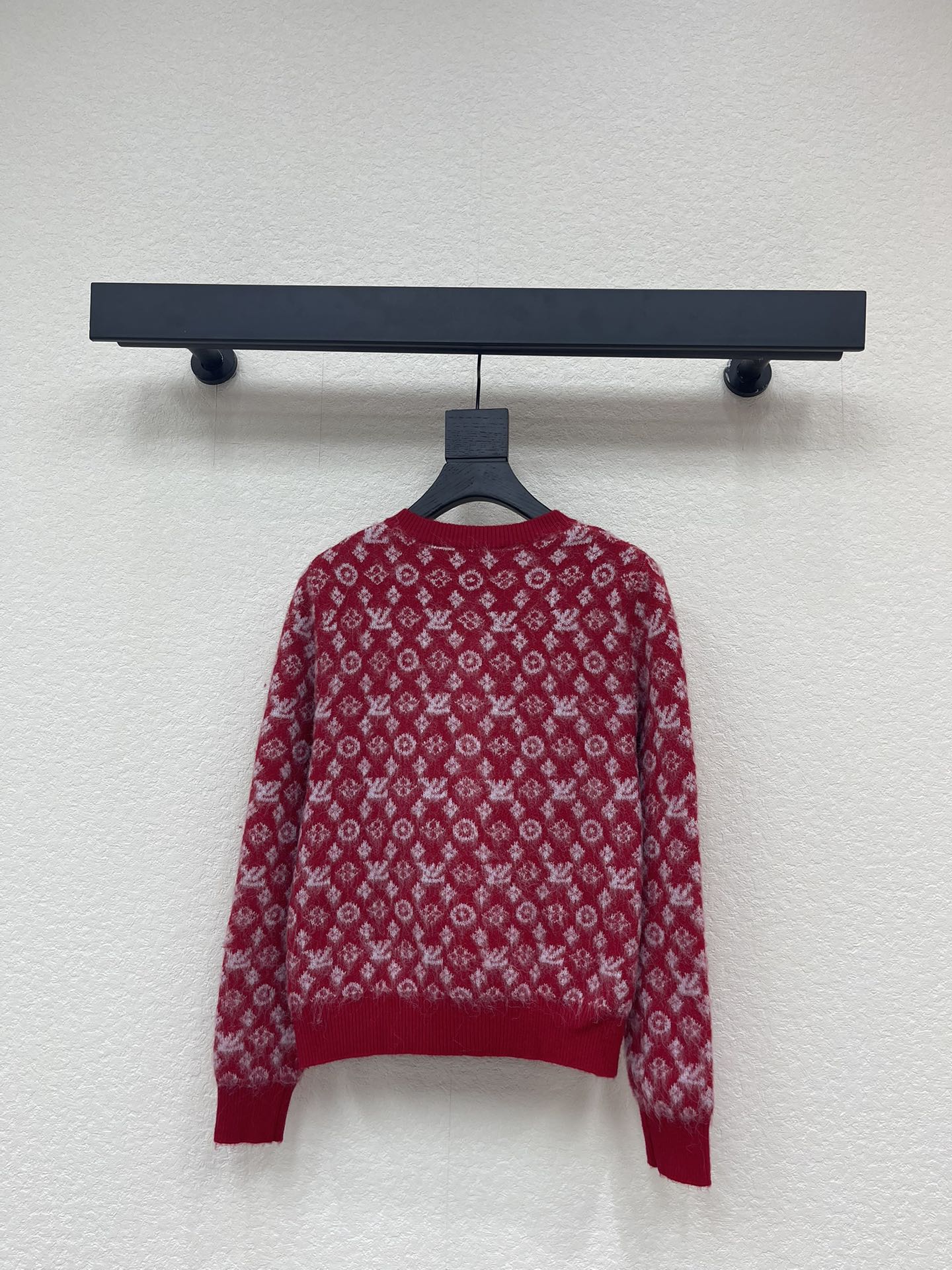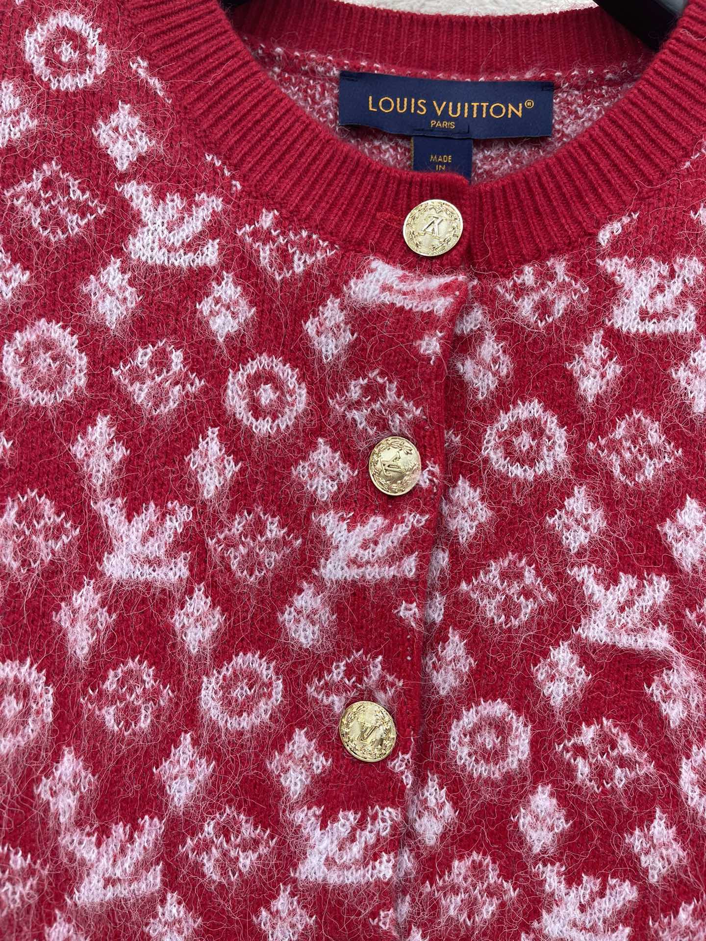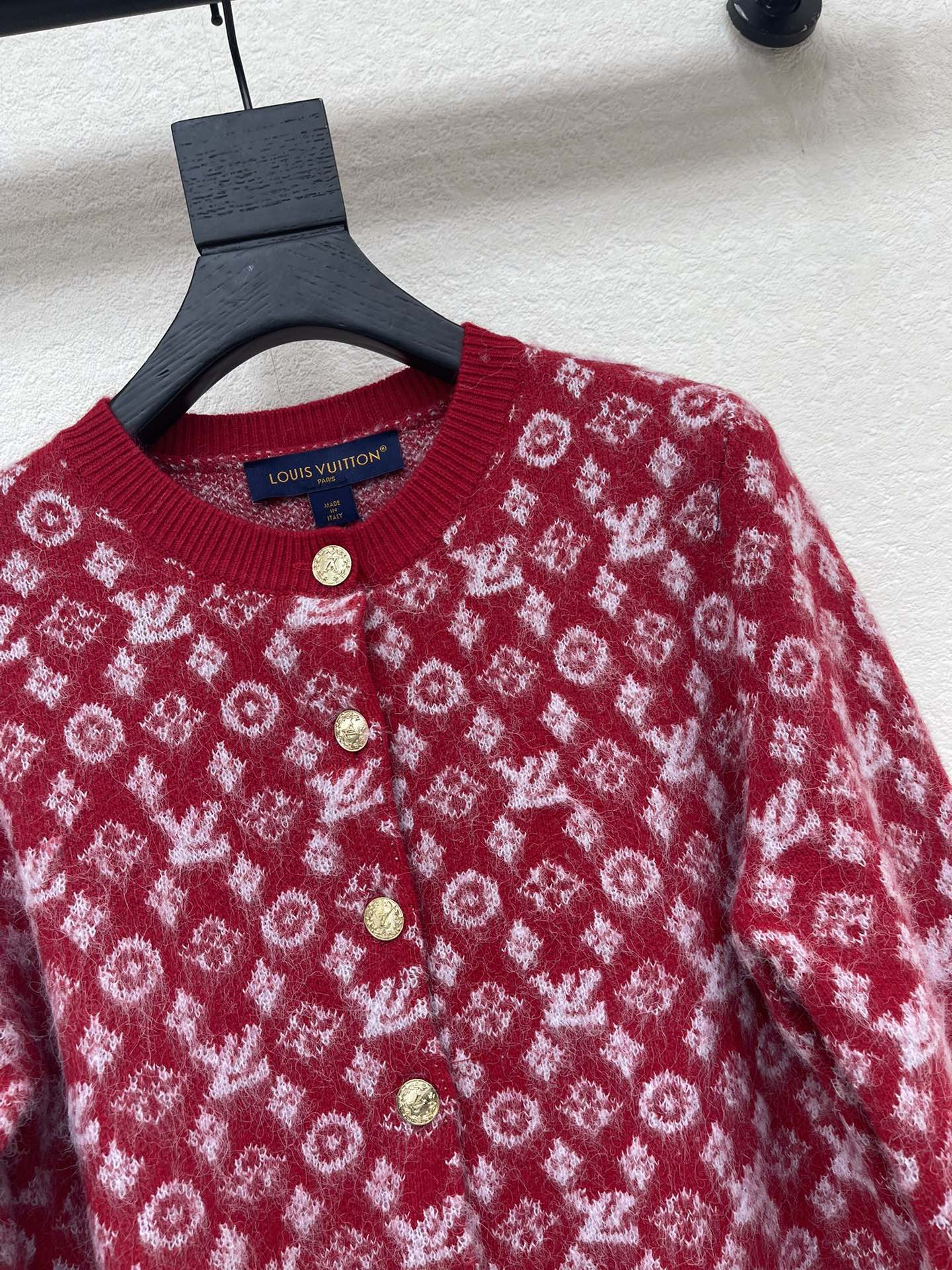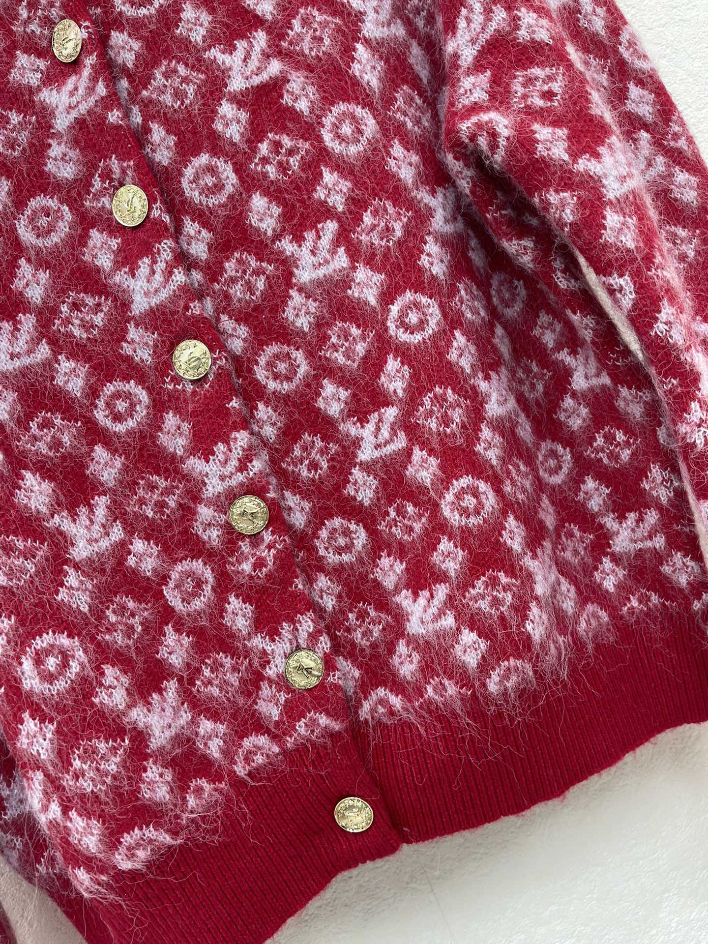 Details: Elegant knitted round-neck cardigan with contrast brand logo lace and custom metal buttons, a must-have for Christmas. High-end customization, exquisite craftsmanship