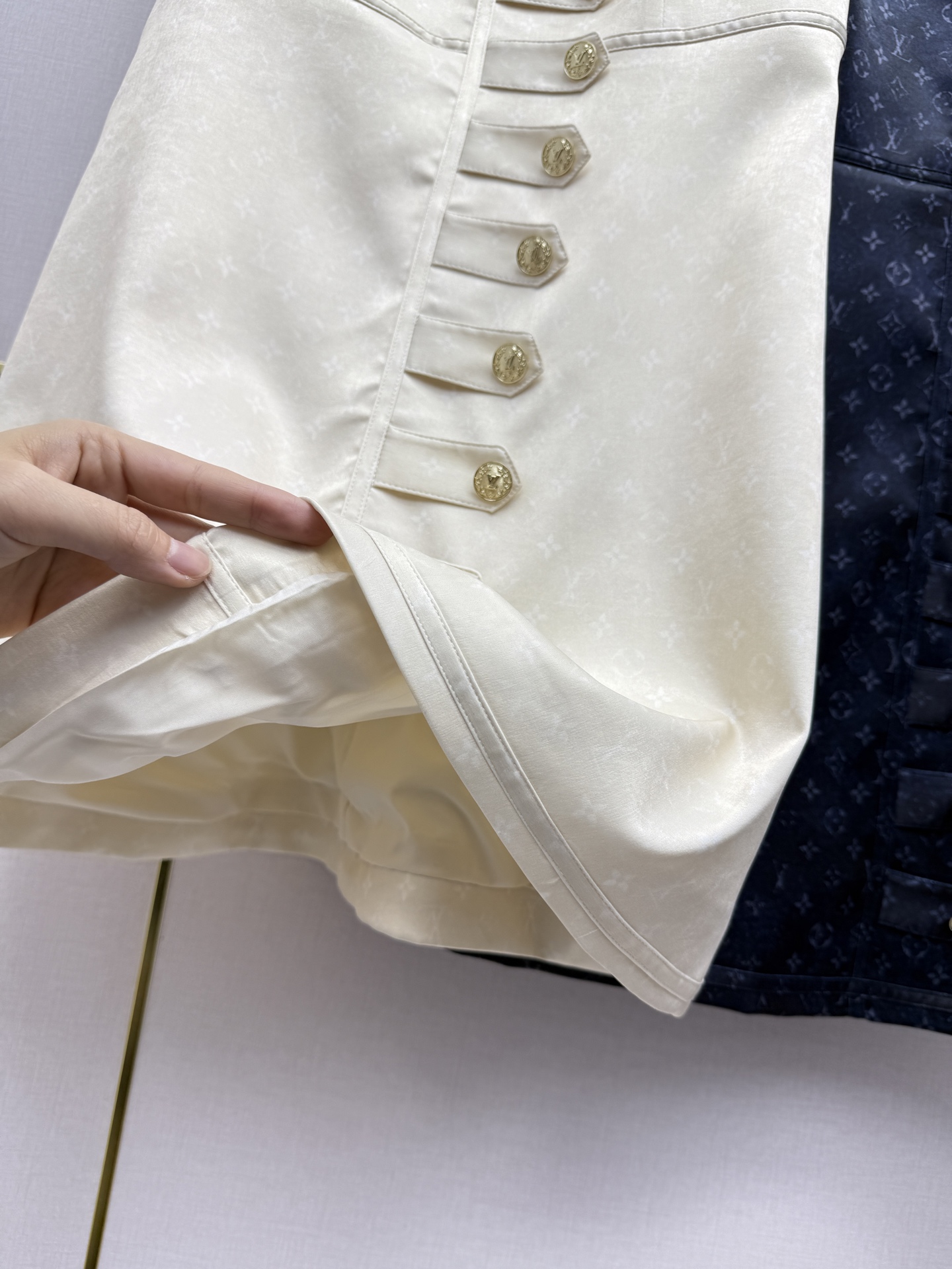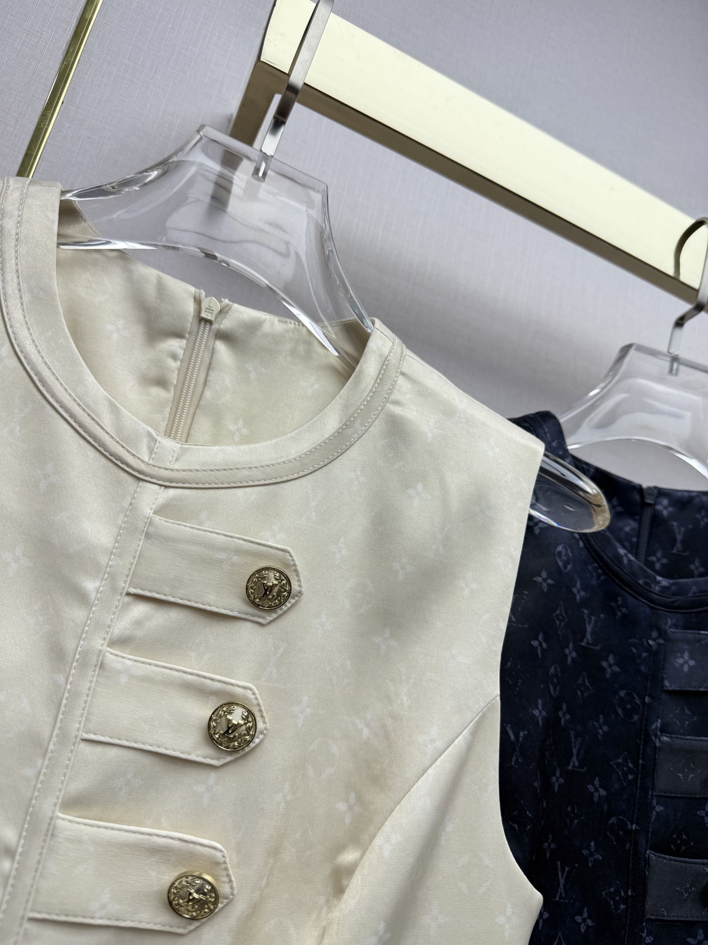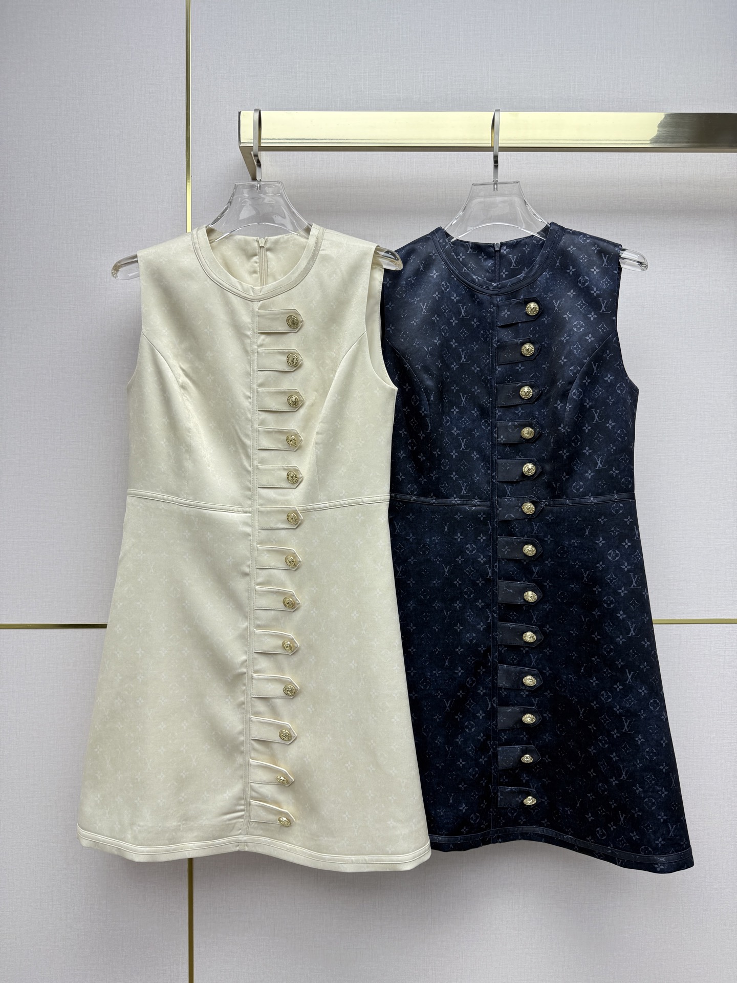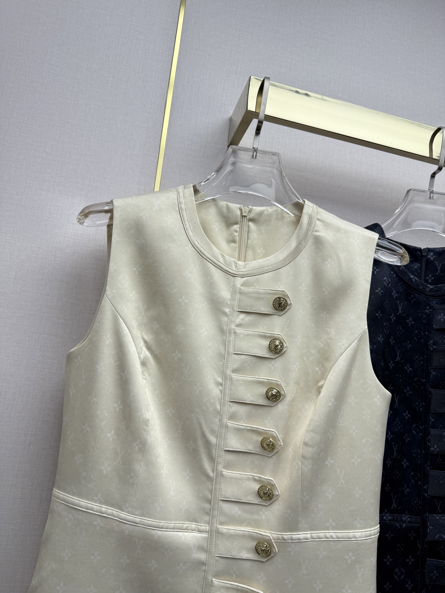 Details: Early Spring sleeveless dress with vintage monogram fabric and metal button decorations, high-quality, available in two colors and three sizes.