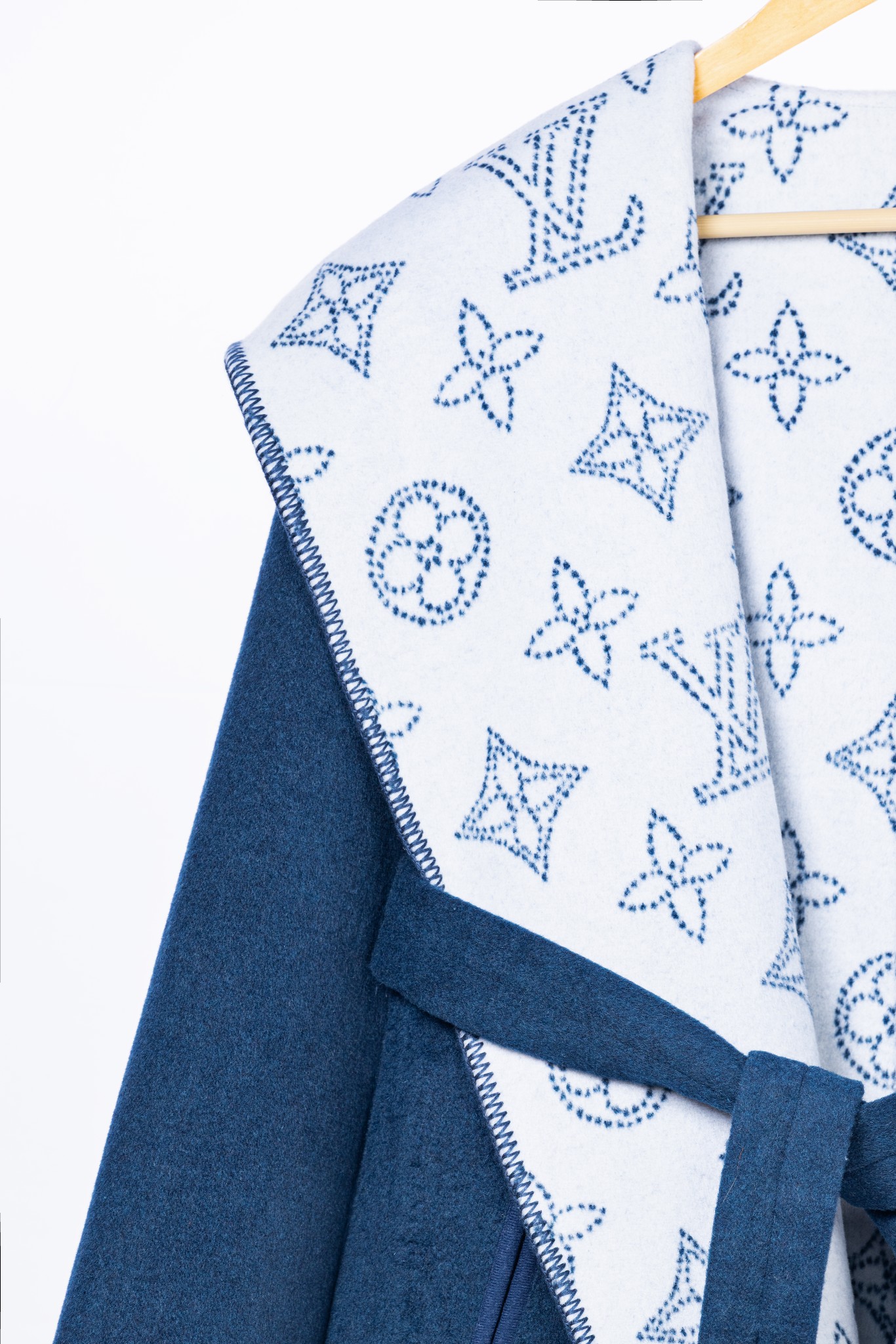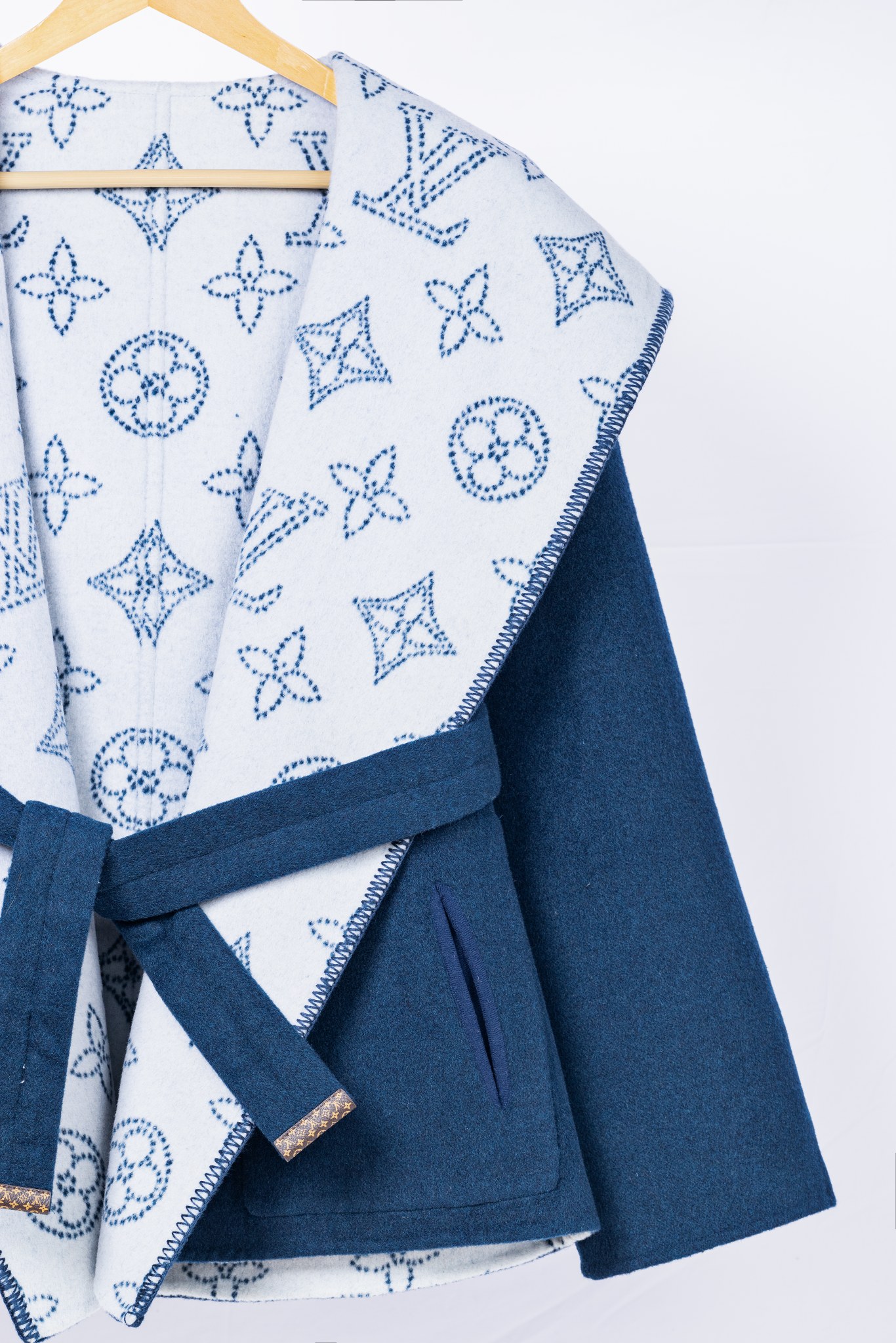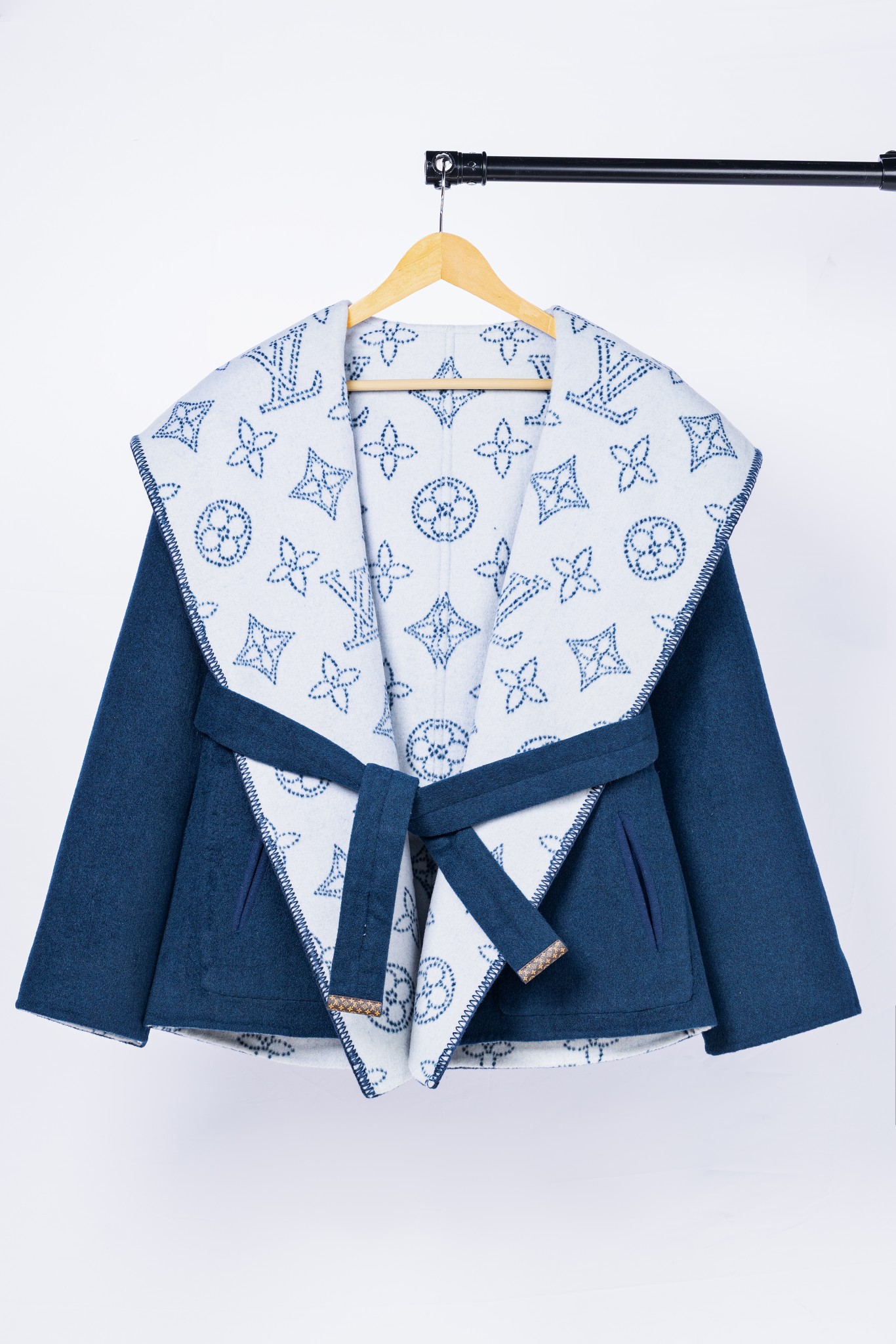 Details: Blue double-sided short coat with medium flowers, sizes 34-40, 99% wool 1% silk. High-end custom, fine workmanship