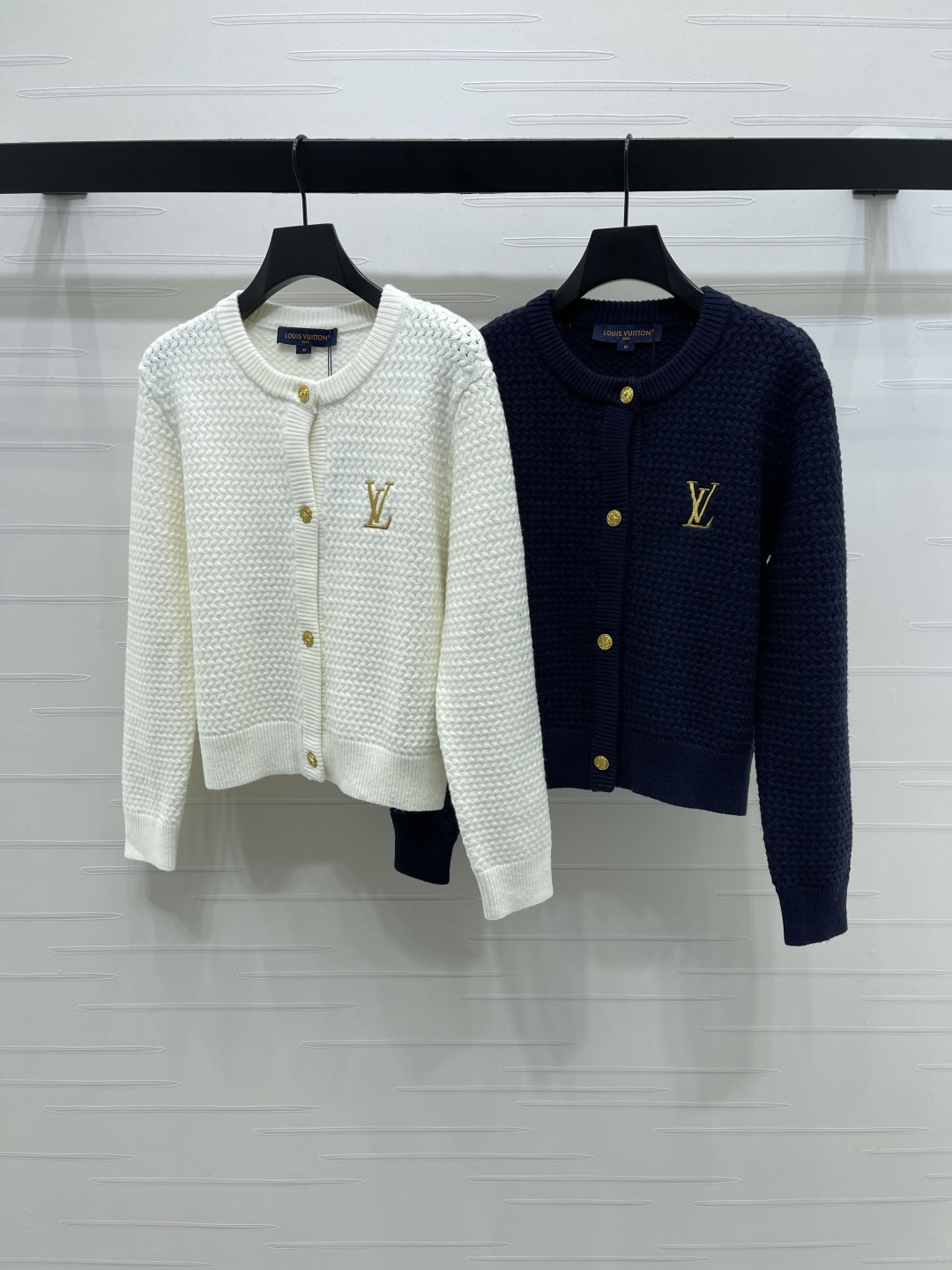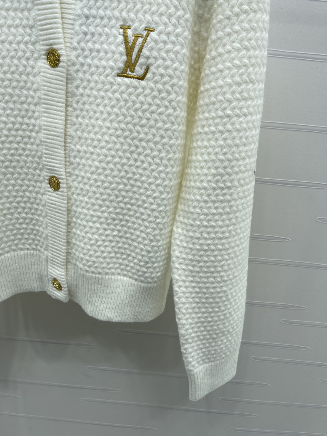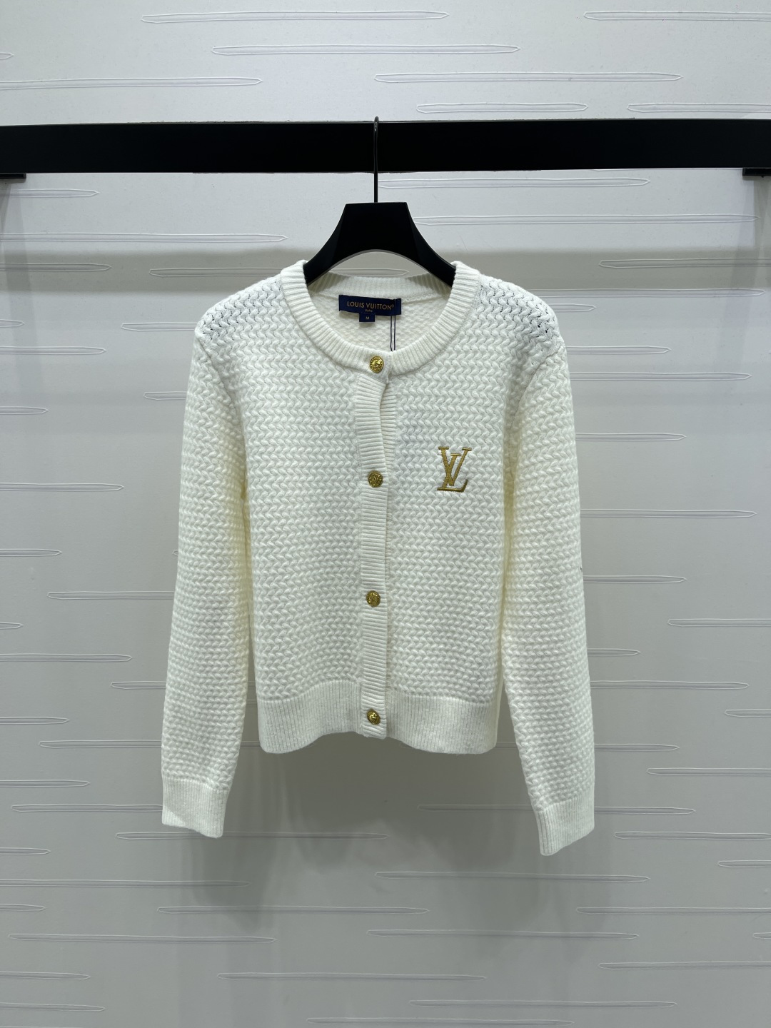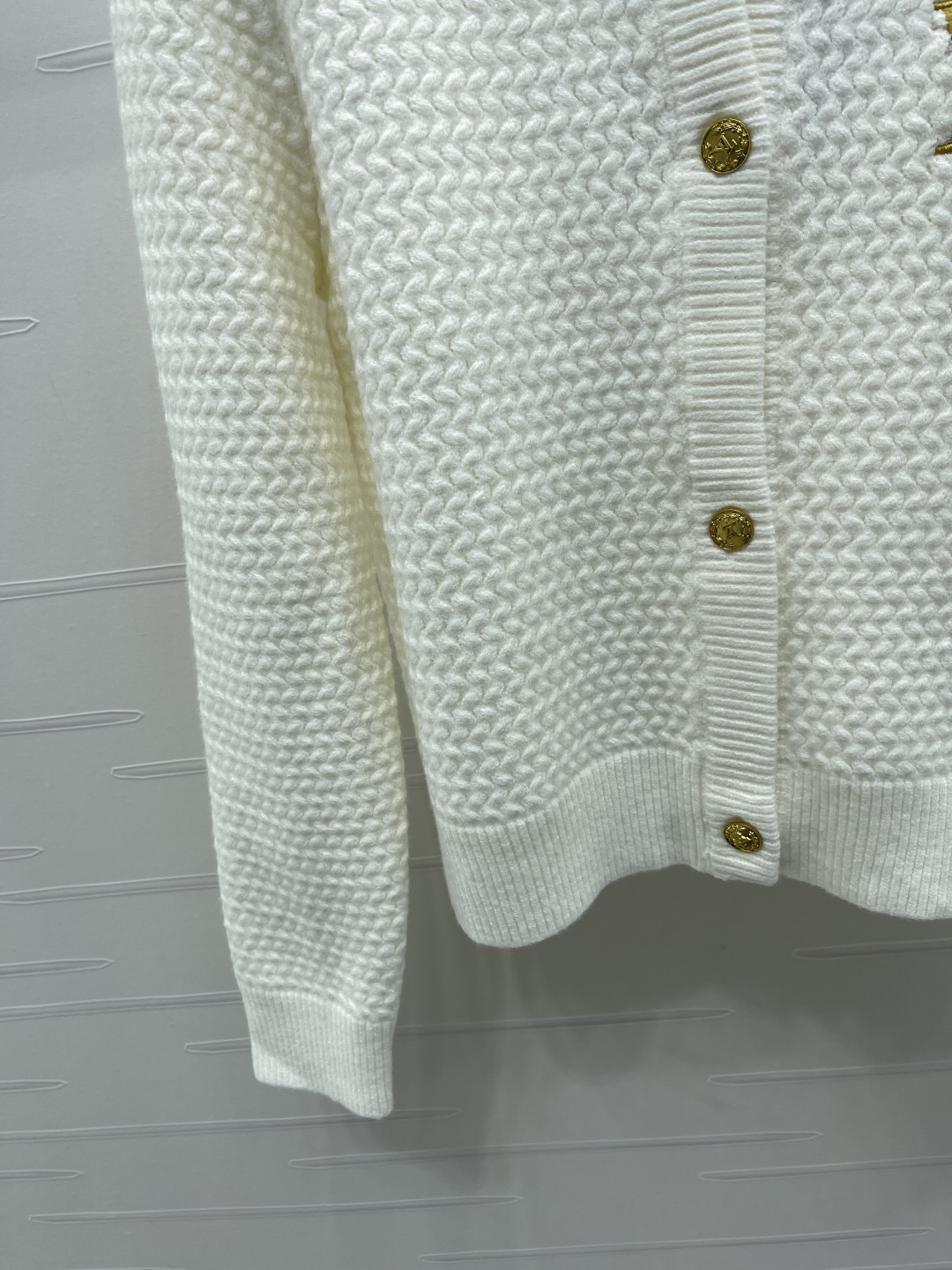 here:home > WOMENS > Louis Vuitton > Outerwear LV (W) > Louis Vuitton Embroidered Round-Neck Knitted Cardigan, Soft Wool with Gold Logo