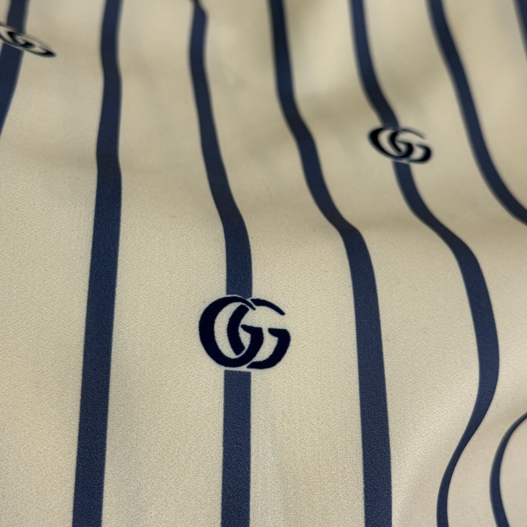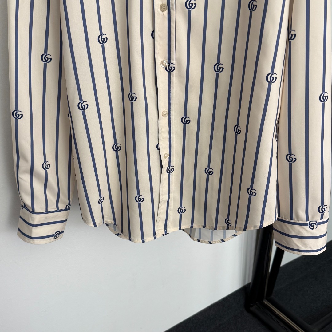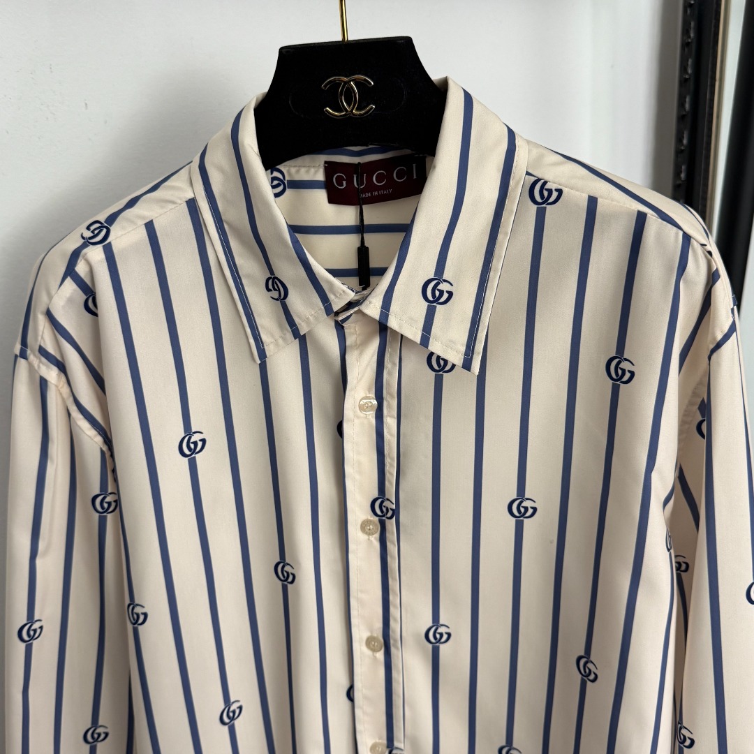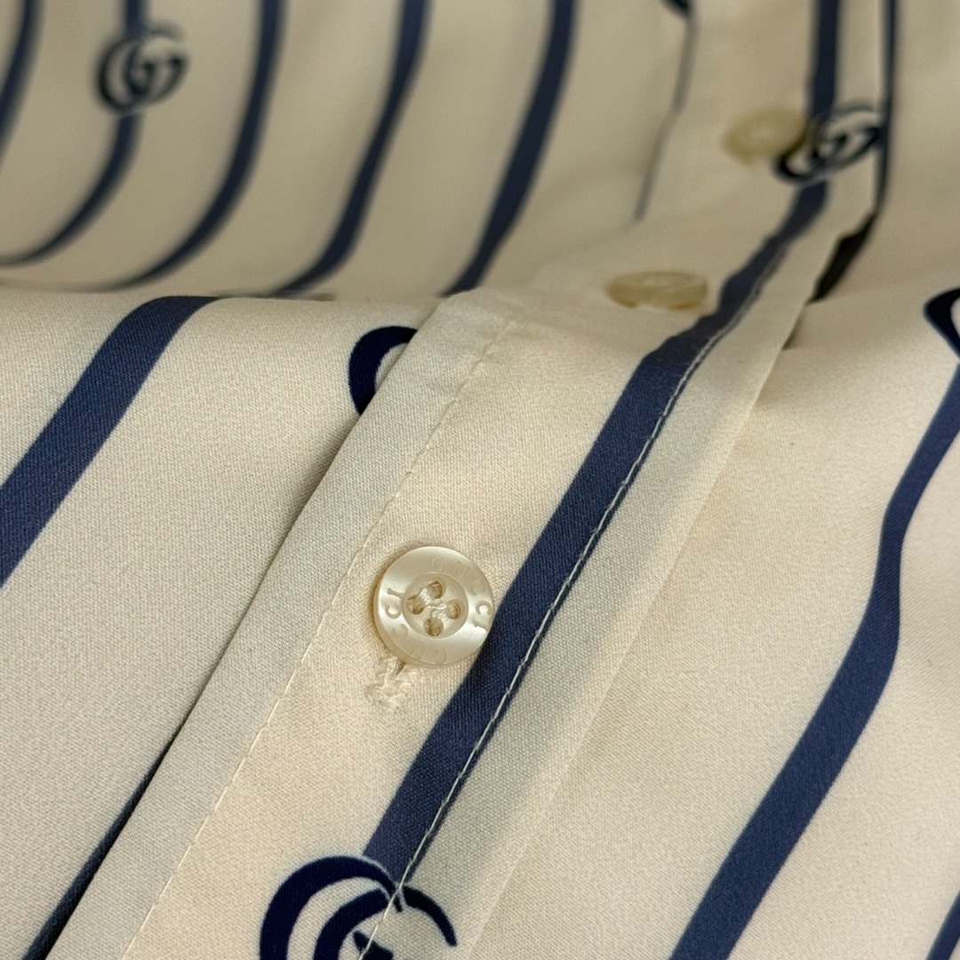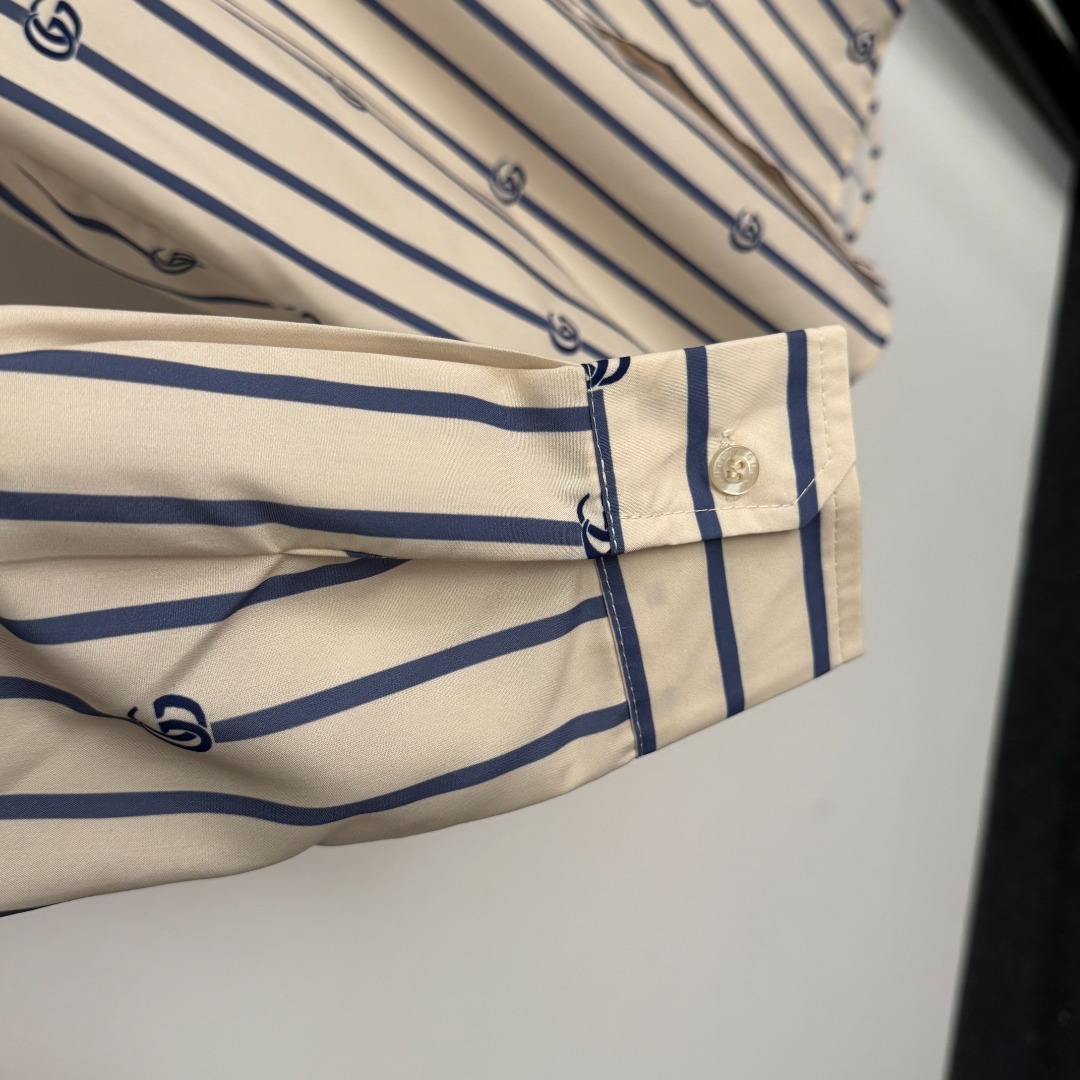 Details: New beige shirt with GG letter stripe print and stand-up collar, available in S, M, L sizes, high-end customization, exquisite craftsmanship
