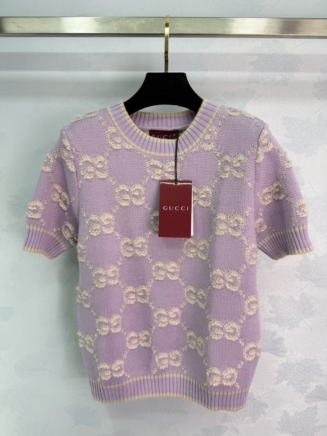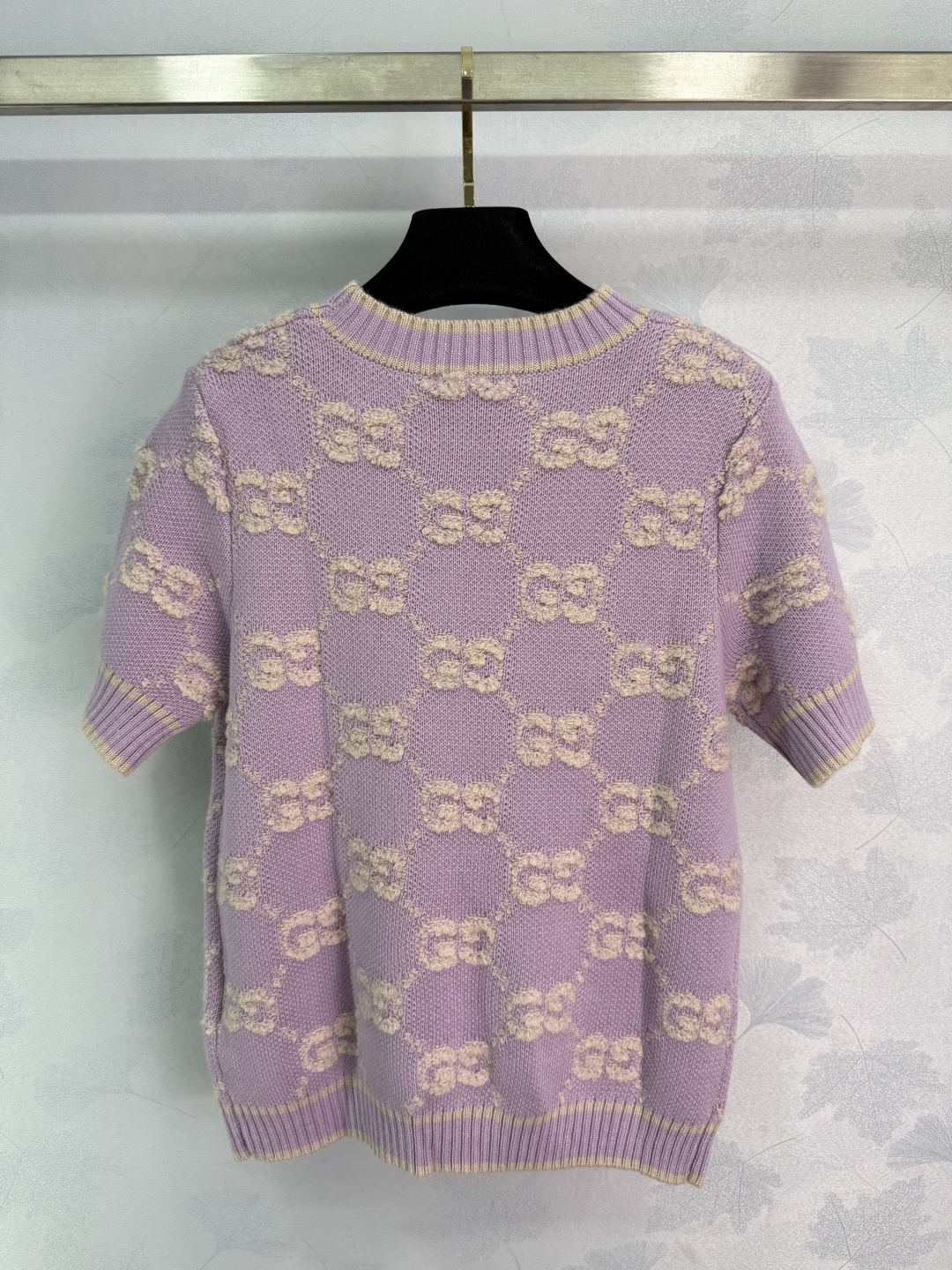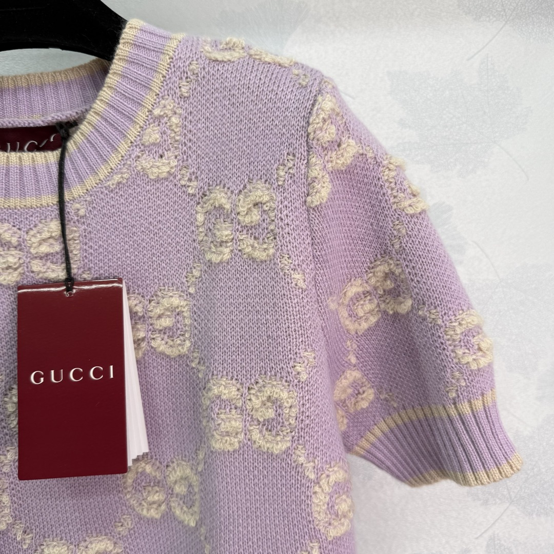 Details: early autumn round-necked jacquard short-sleeved woolen sweater with a tailored fit and double G patterns. High-end customization, delicate craftsmanship