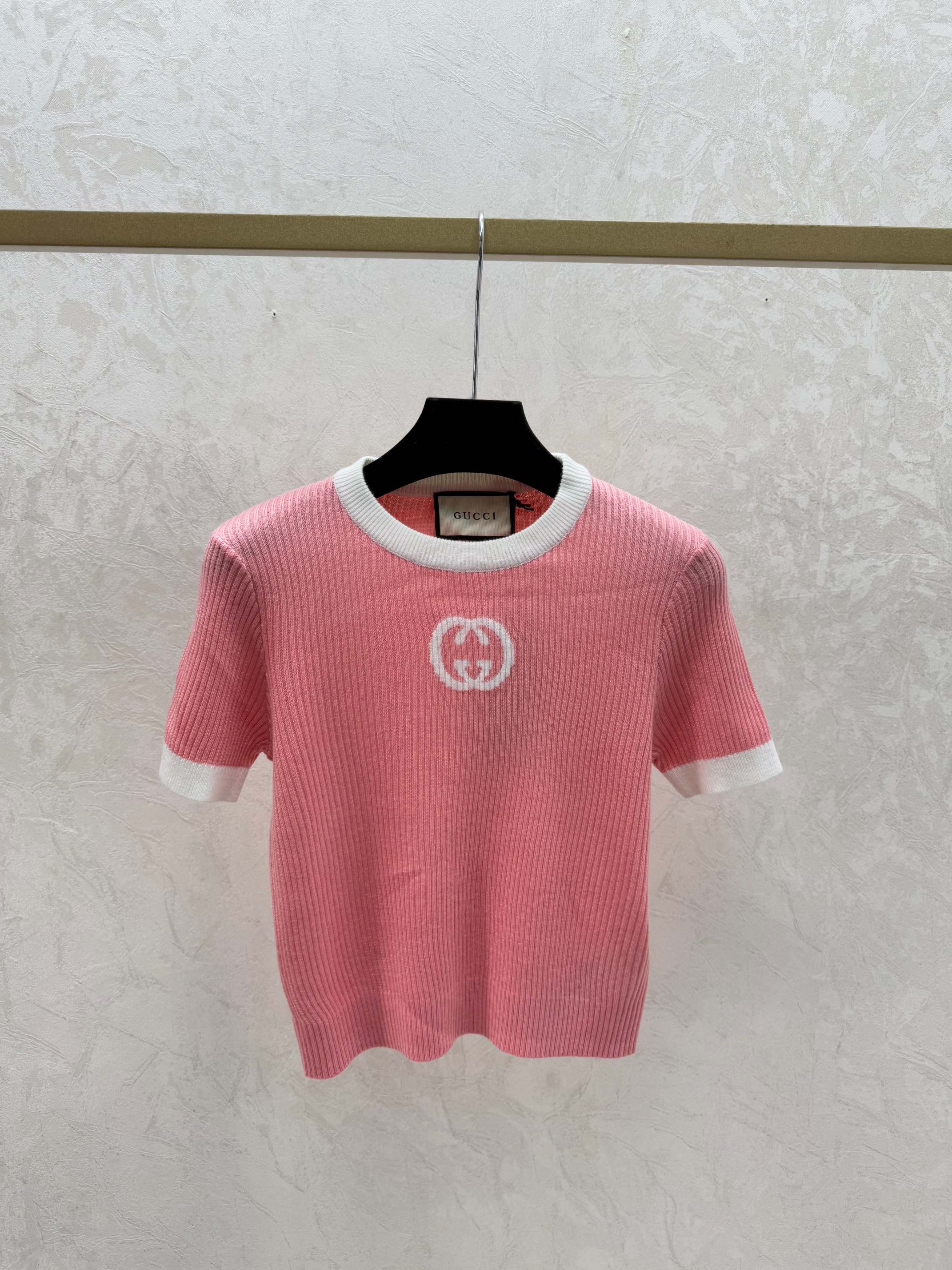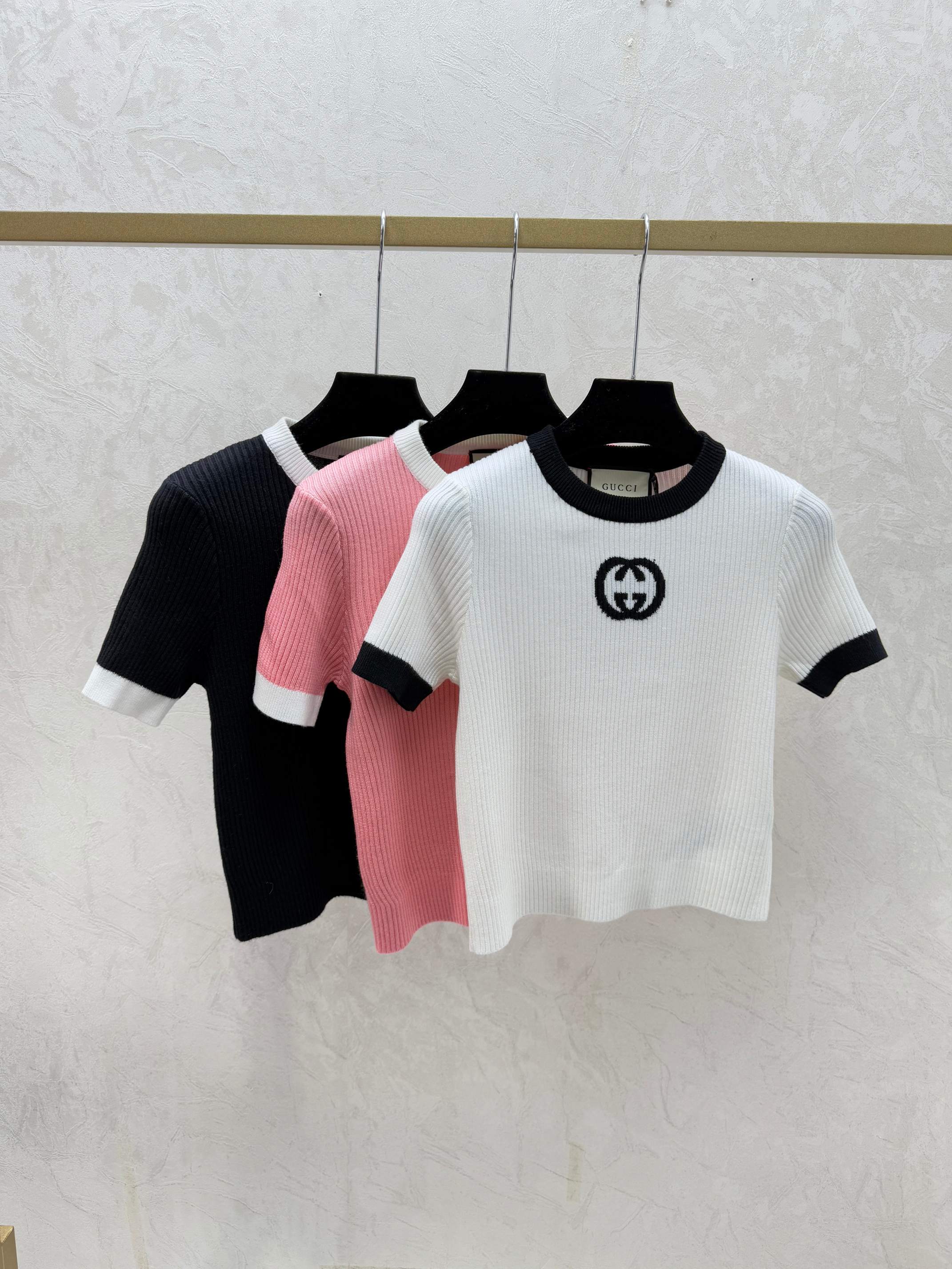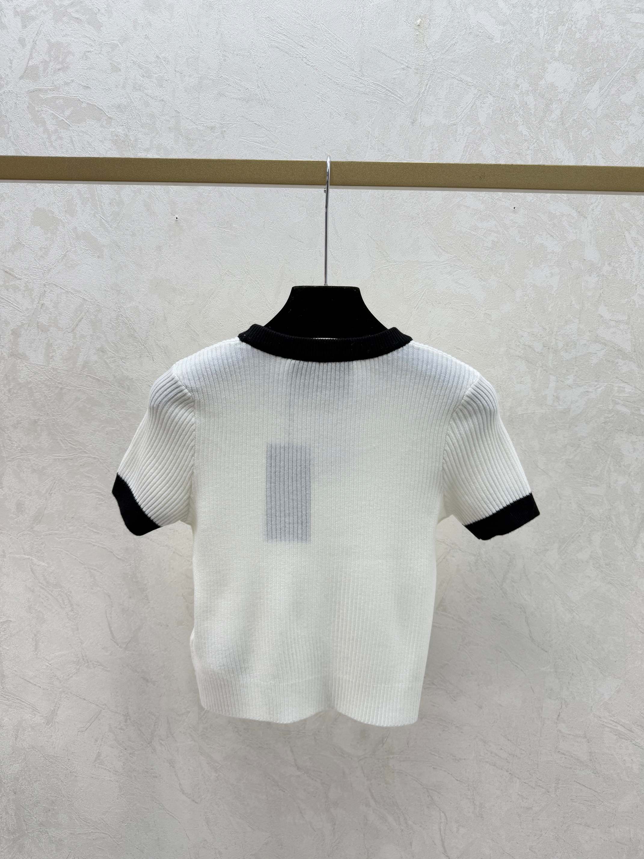 Details: Early spring new arrival, color-blocked letter jacquard round-neck knitted short-sleeved top in white, pink and black, available in sizes 36 - 40.