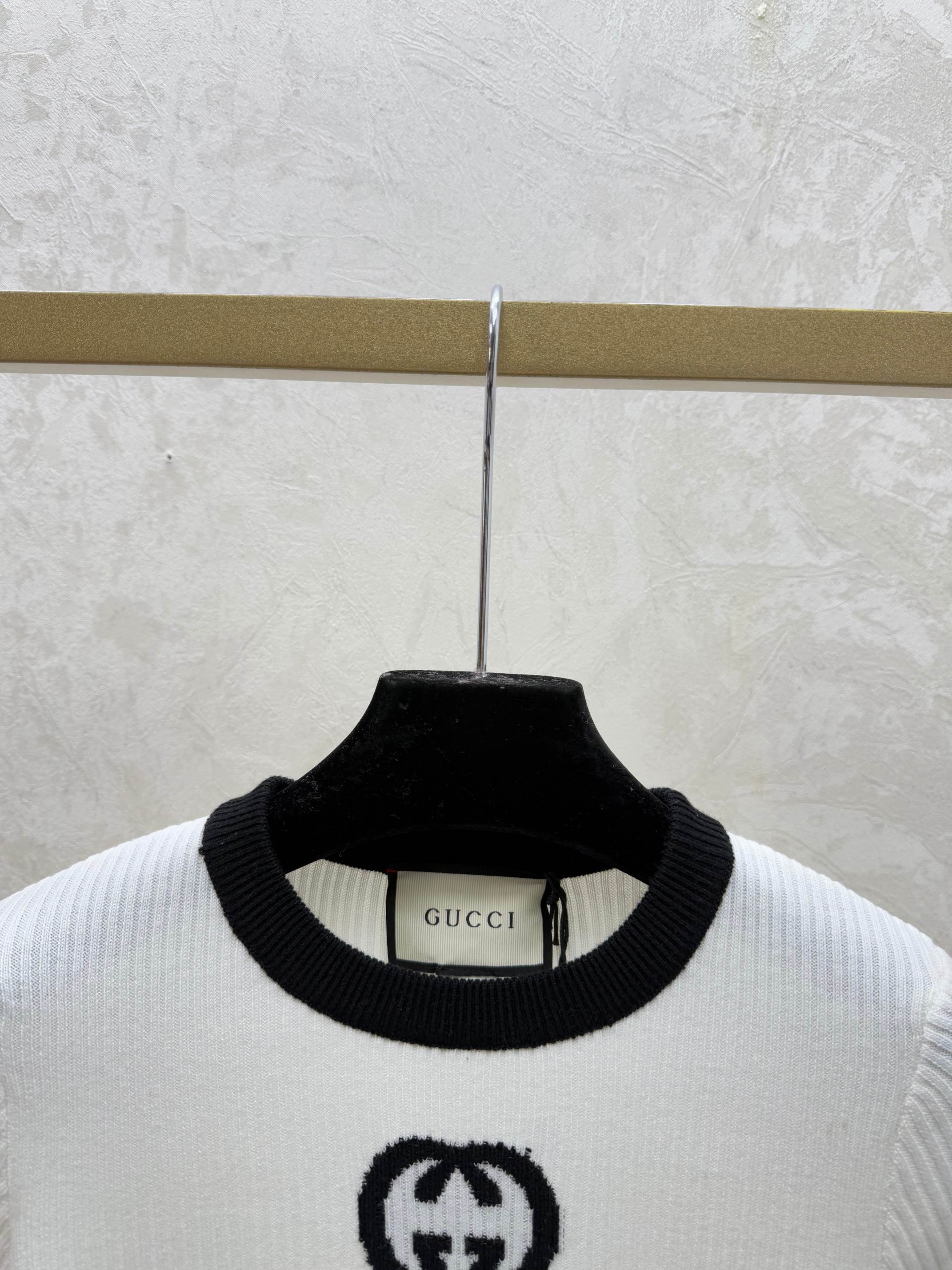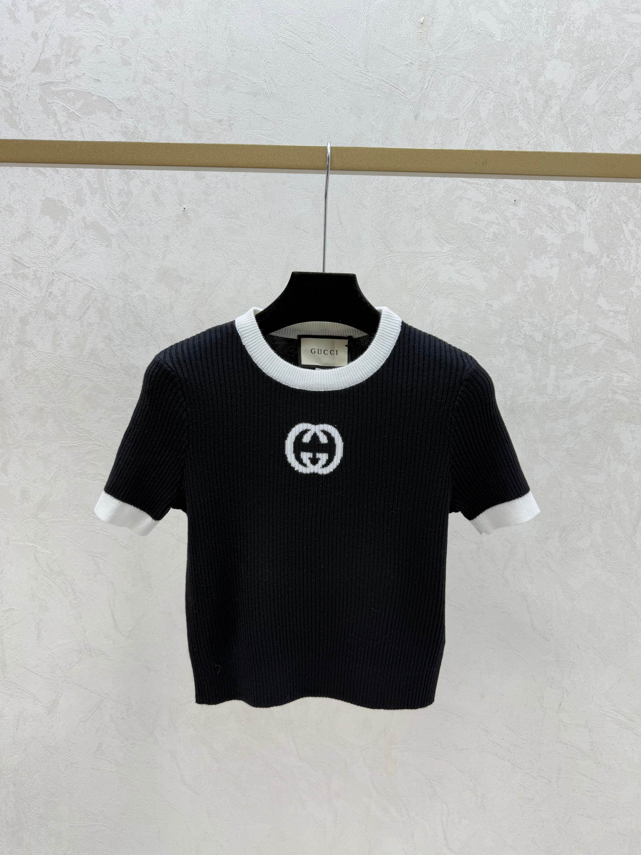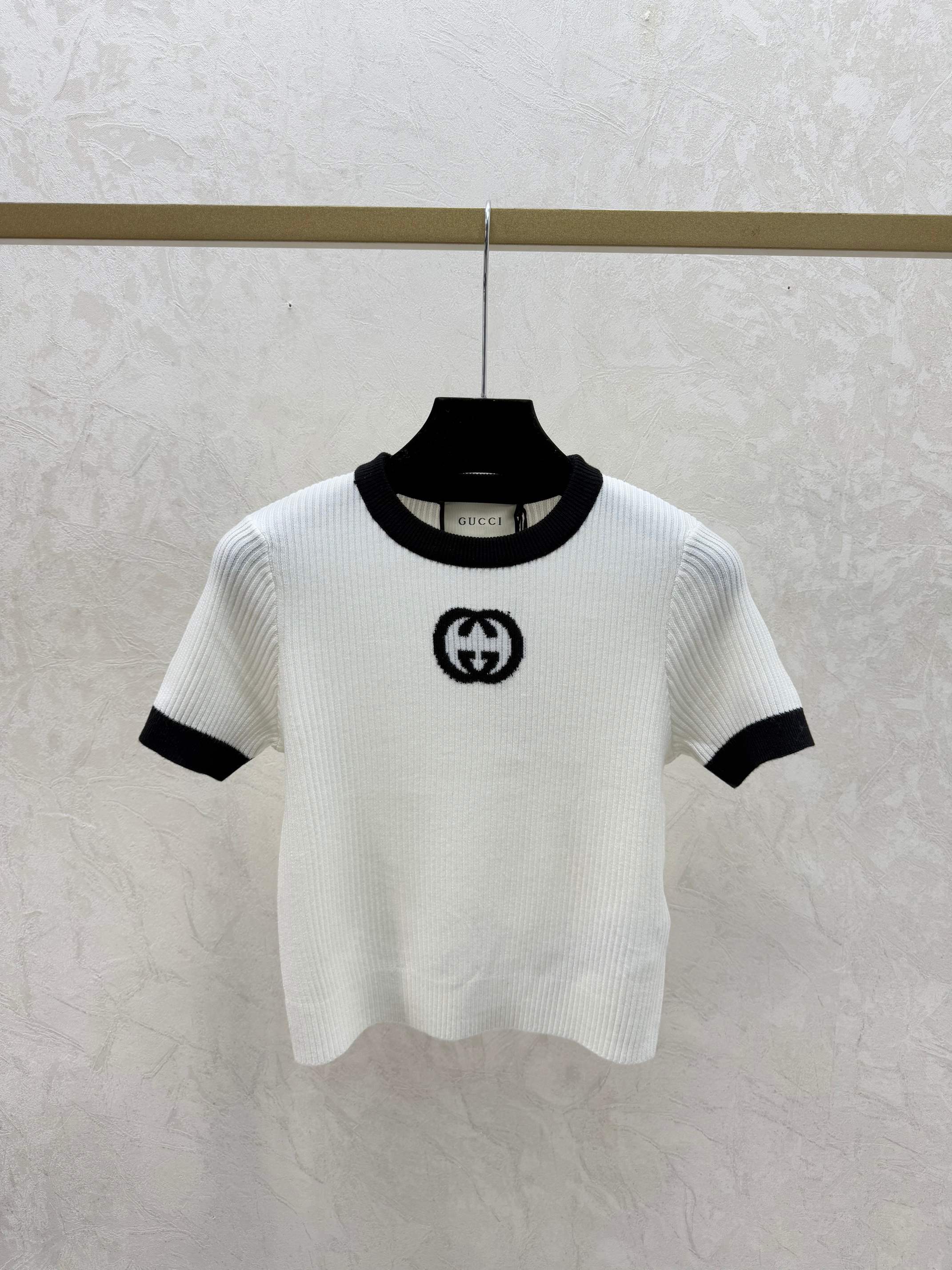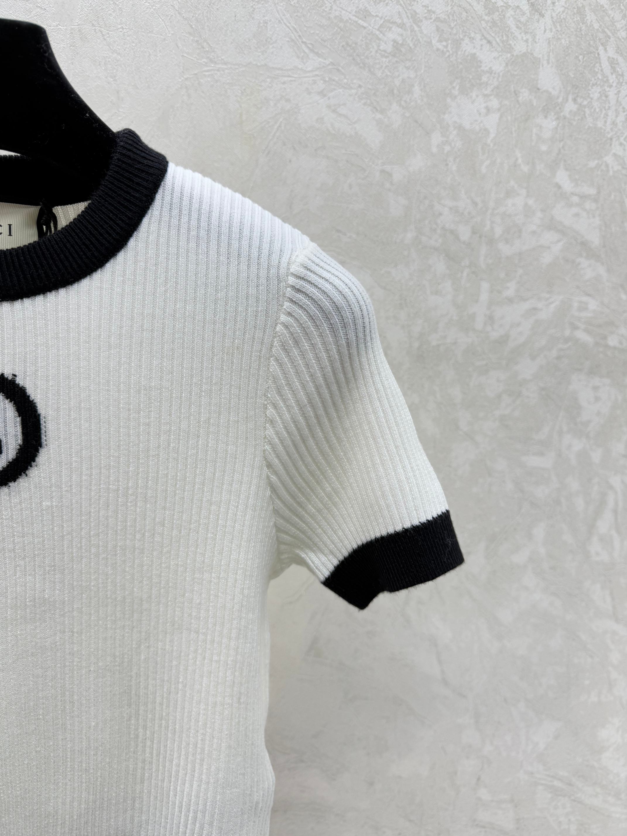 Details: Early spring new arrival, color-blocked letter jacquard round-neck knitted short-sleeved top in white, pink and black, available in sizes 36 - 40.
