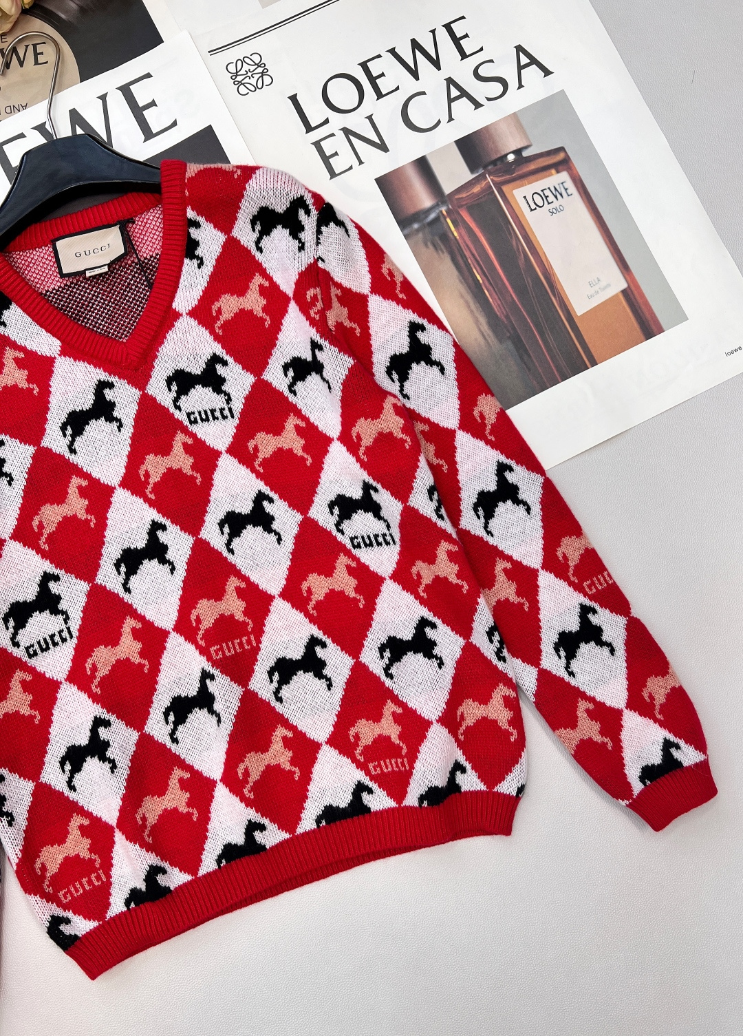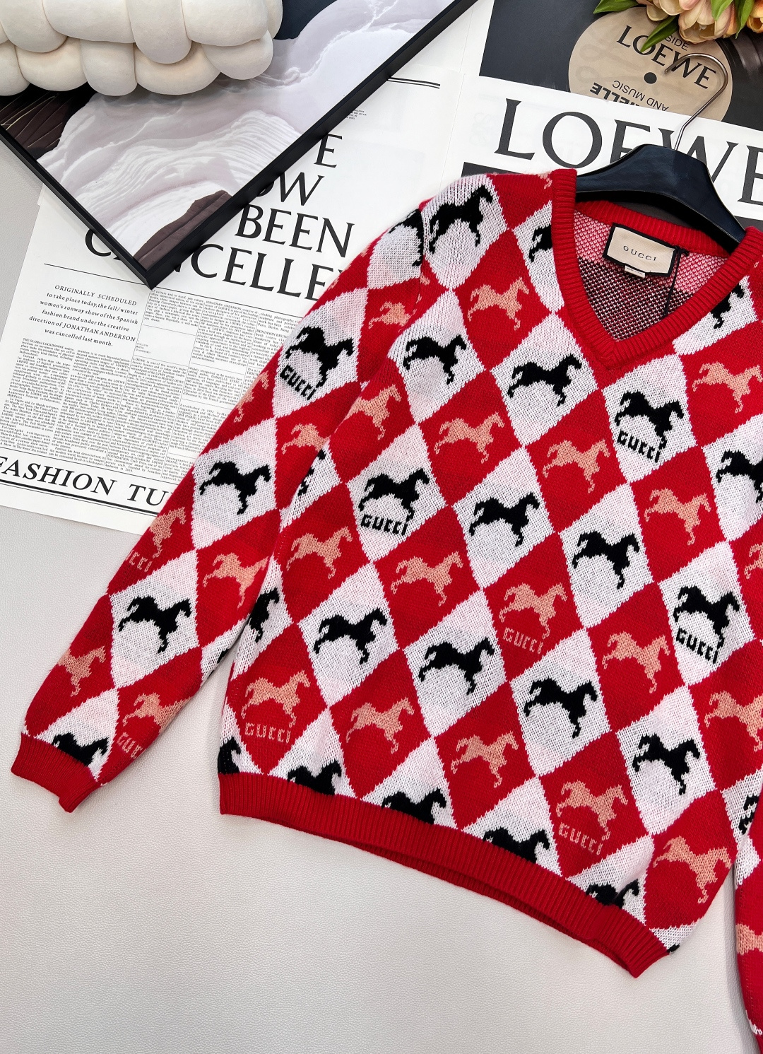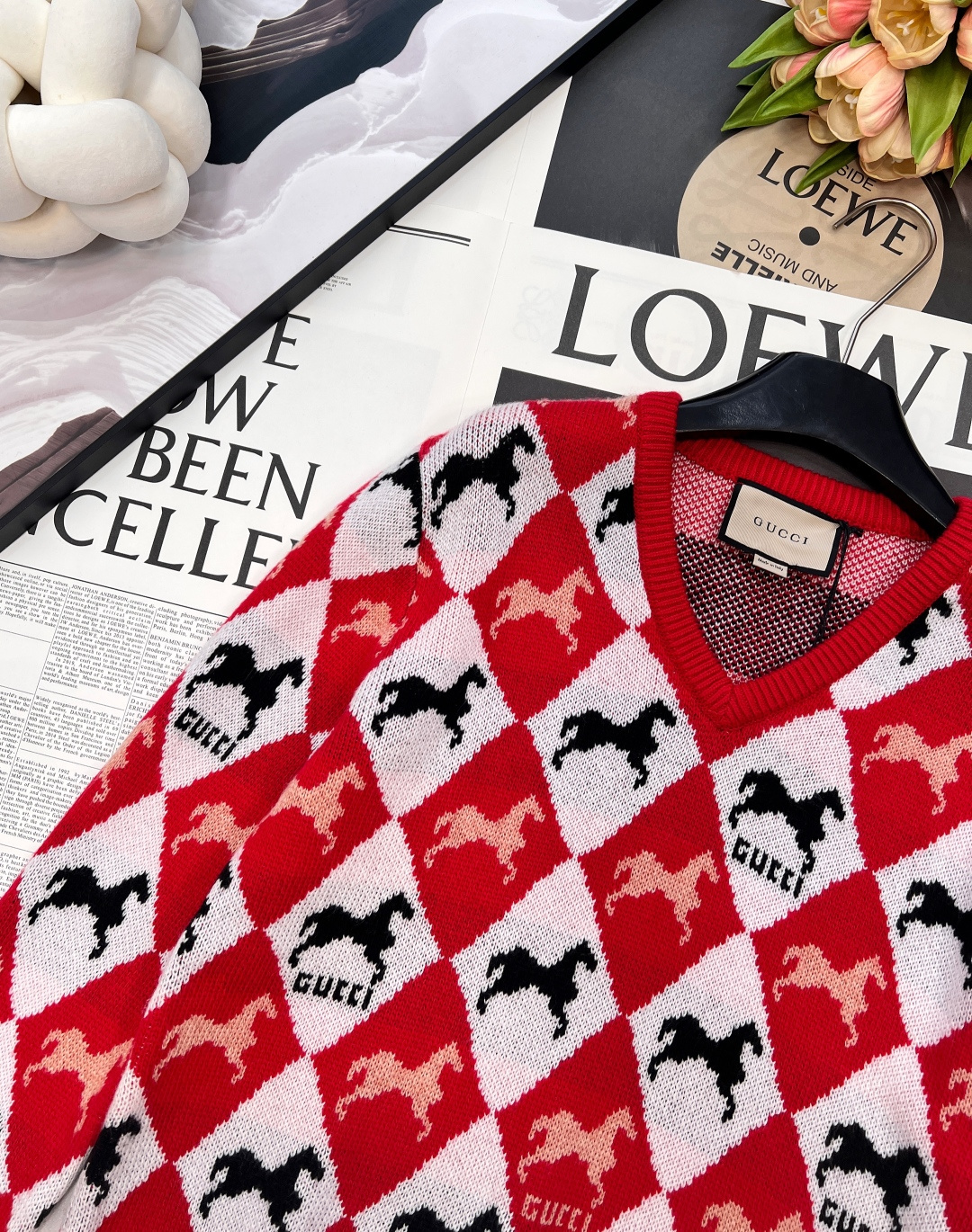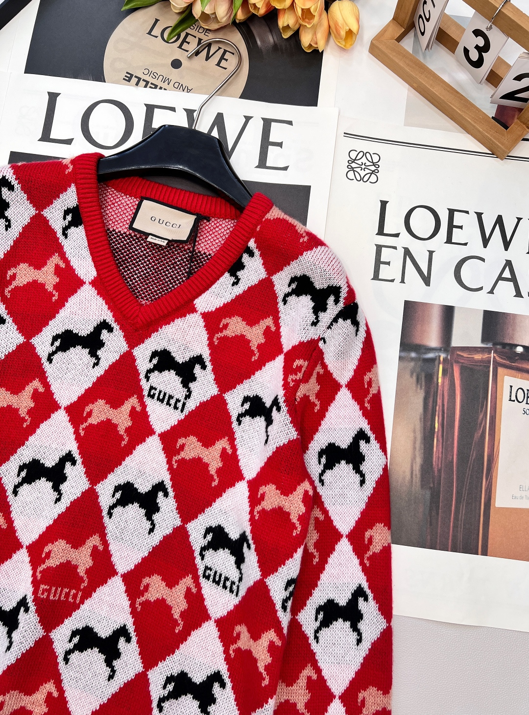 Details: V-neck knitted top with red & white checks, pony jacquard, loose fit, suitable for autumn and winter.