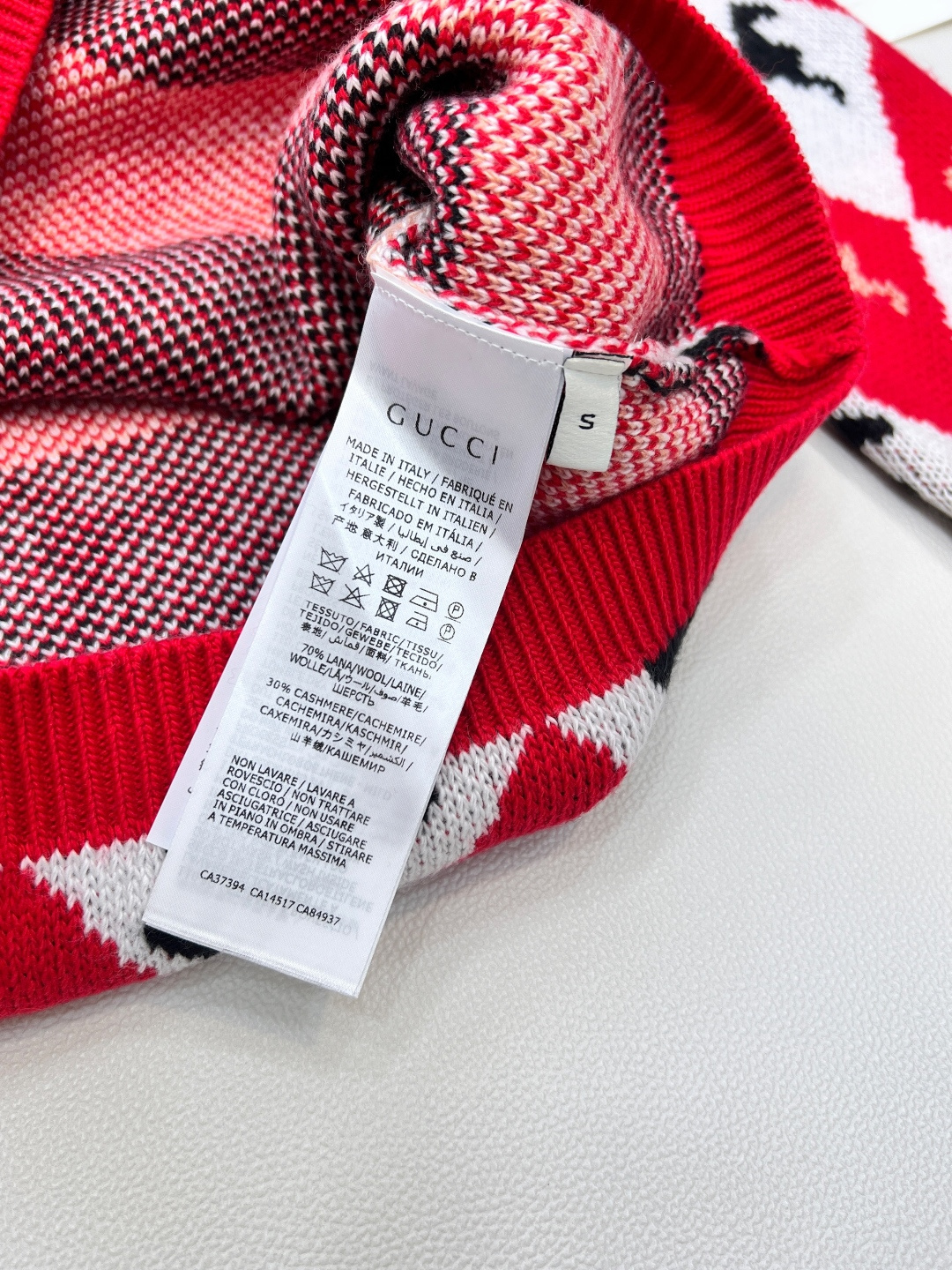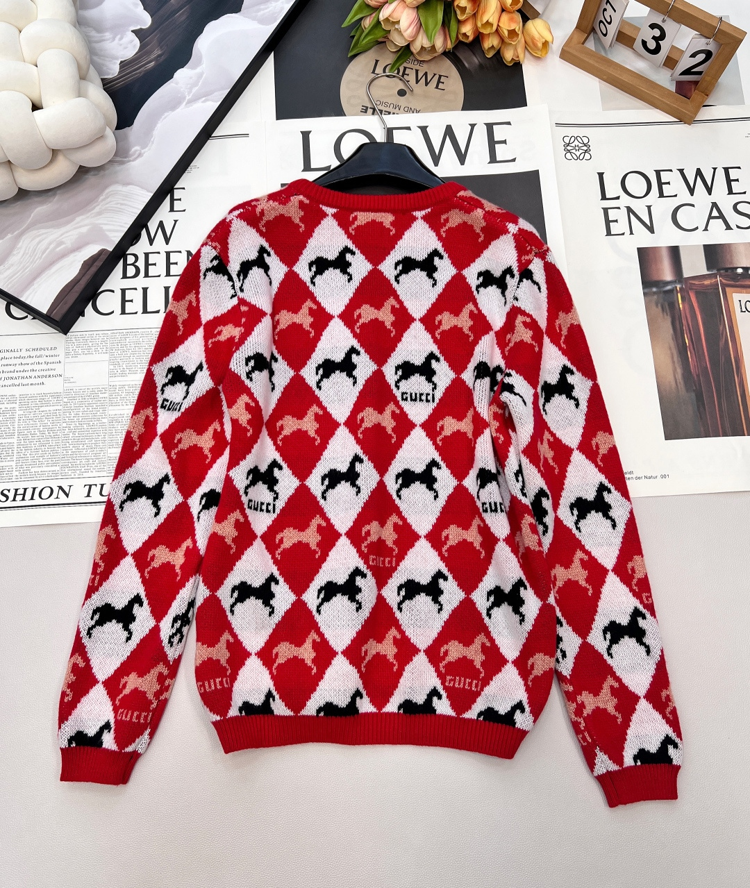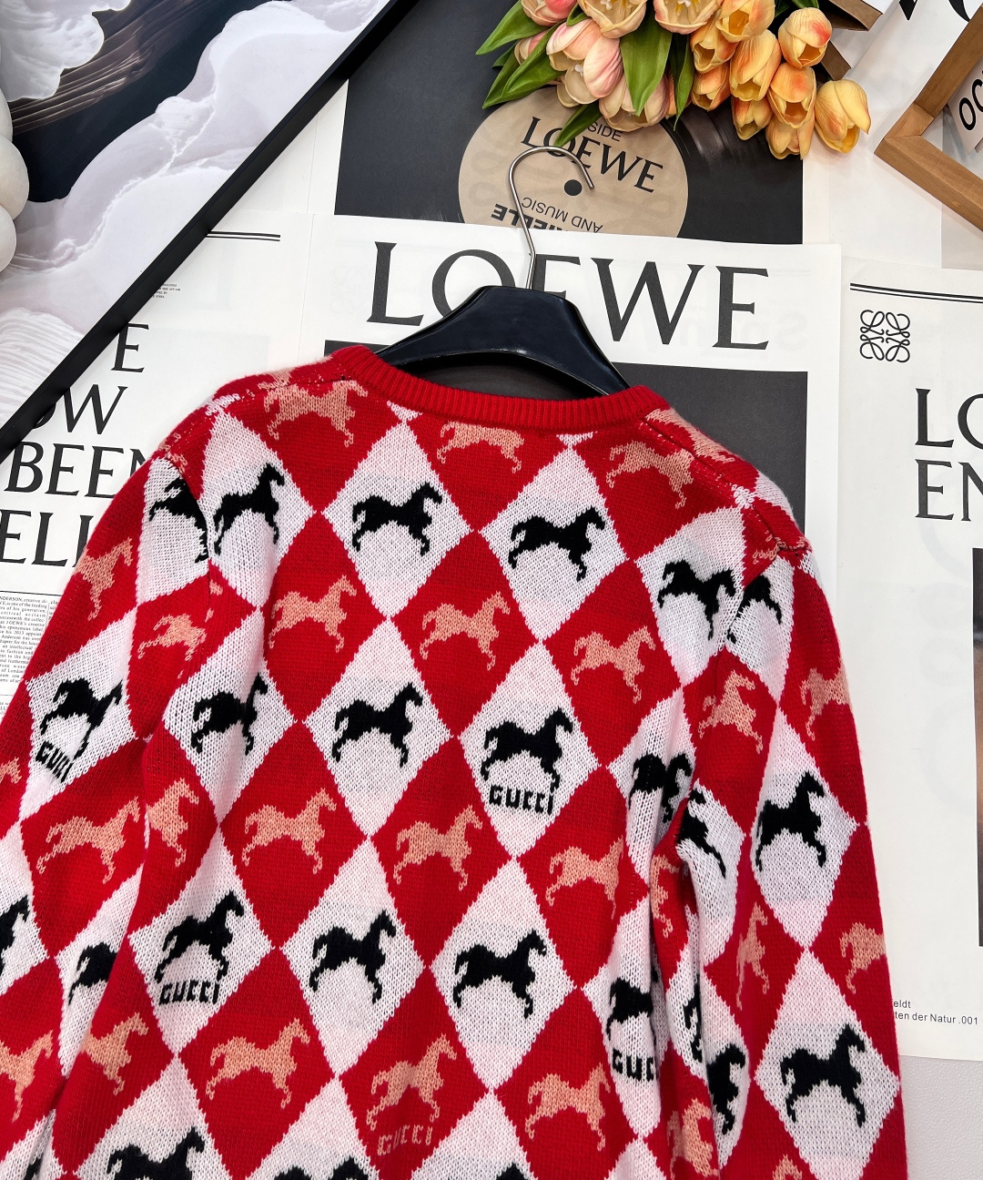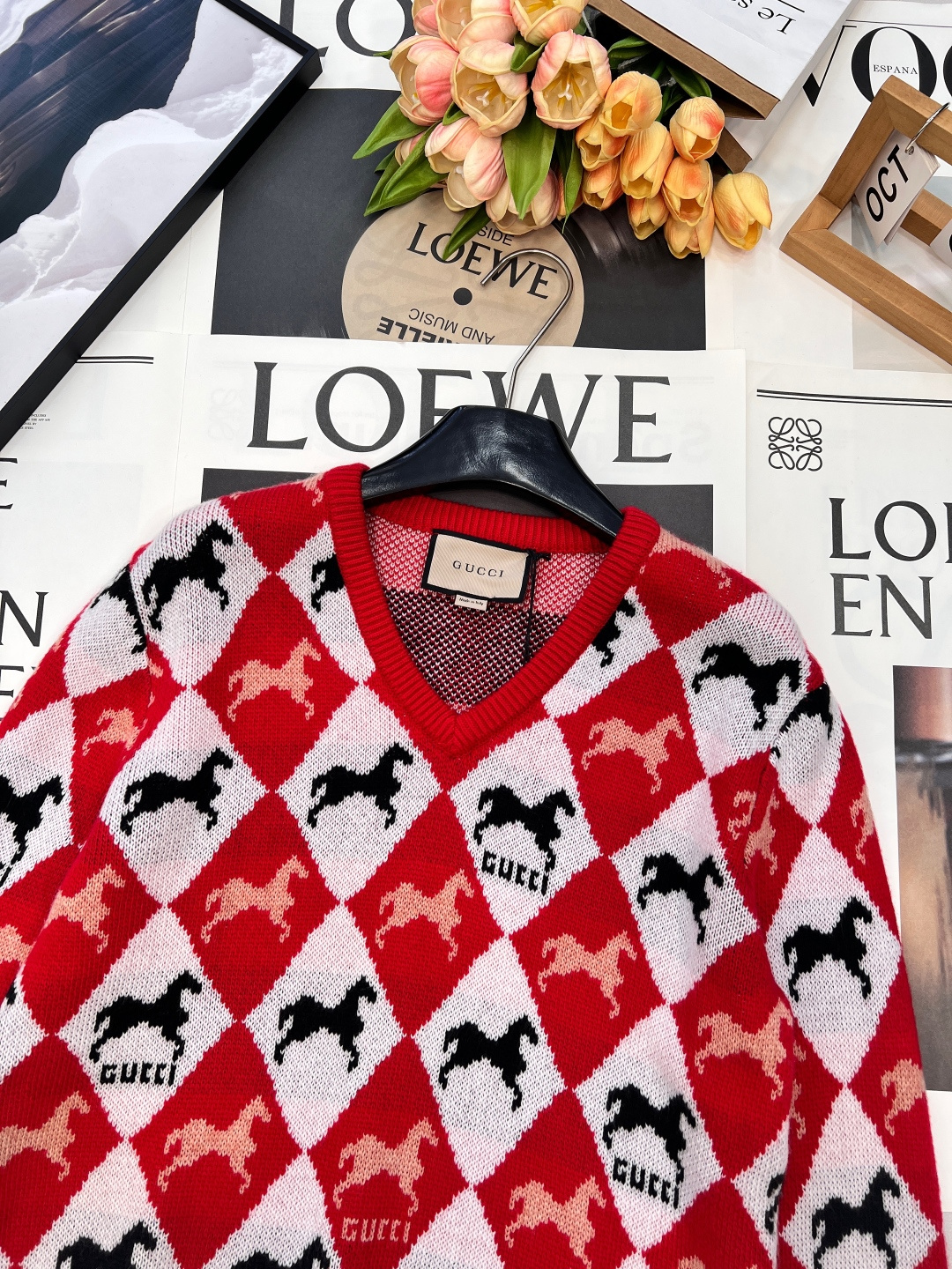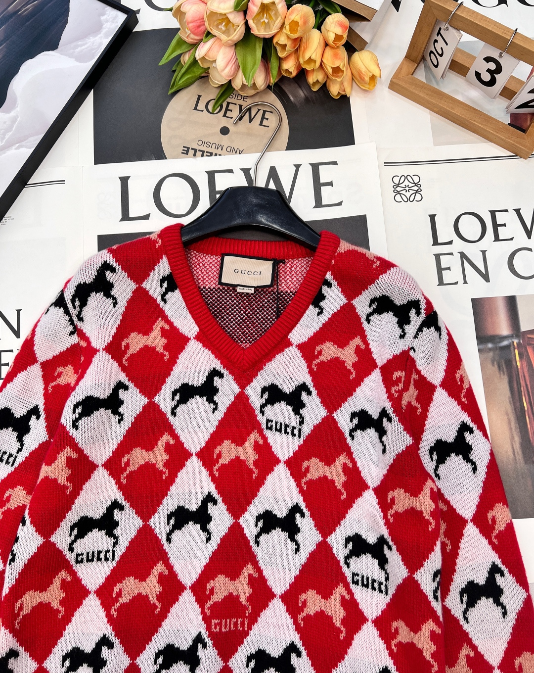 Details: V-neck knitted top with red & white checks, pony jacquard, loose fit, suitable for autumn and winter.