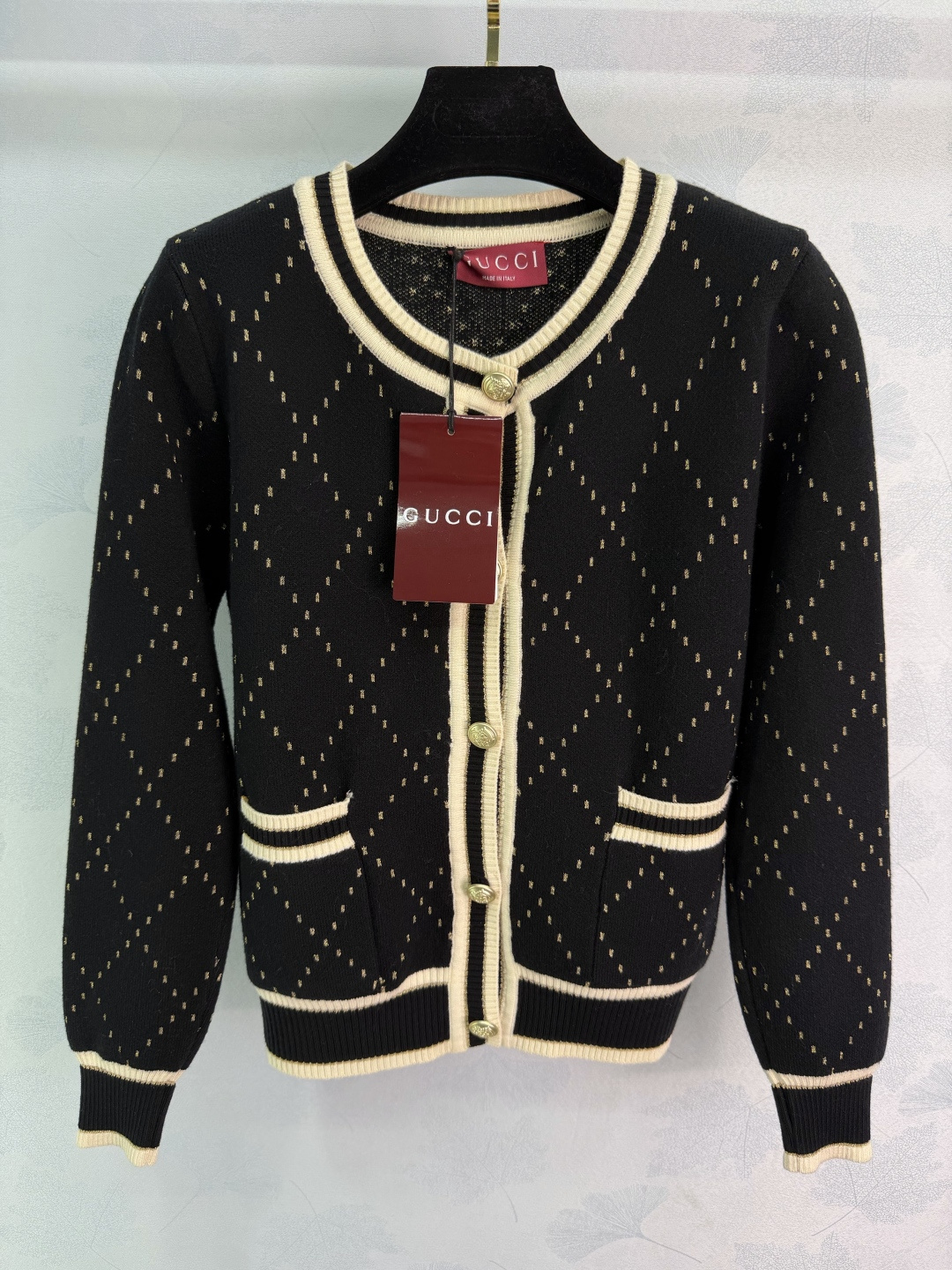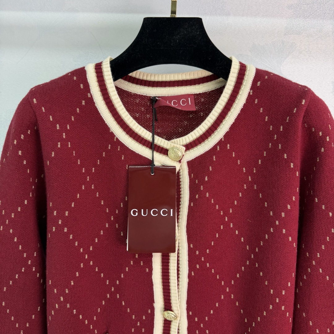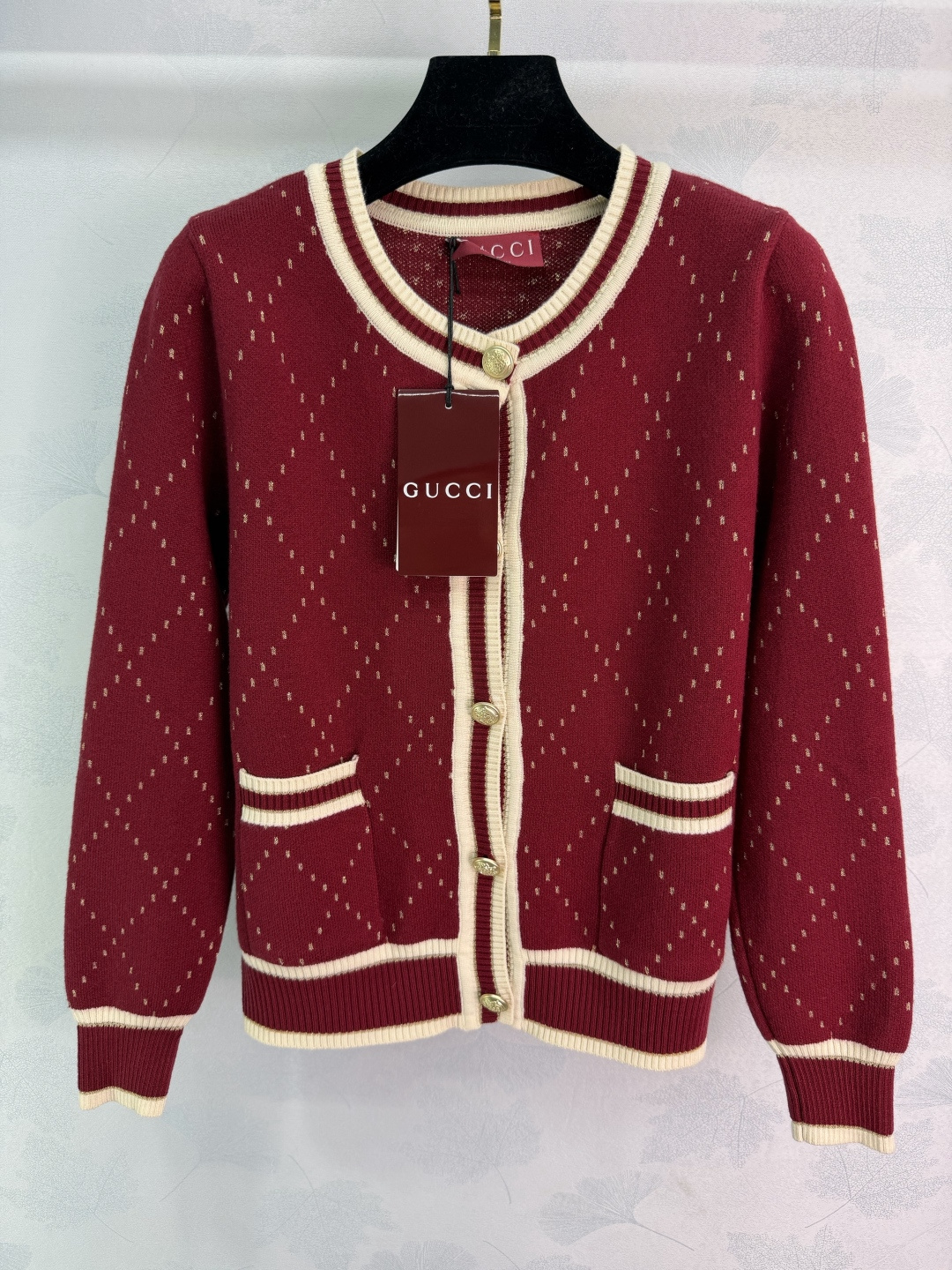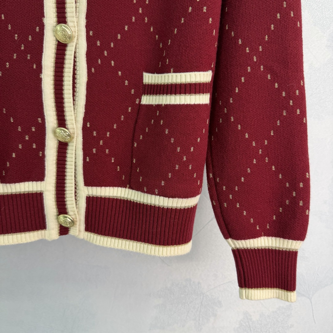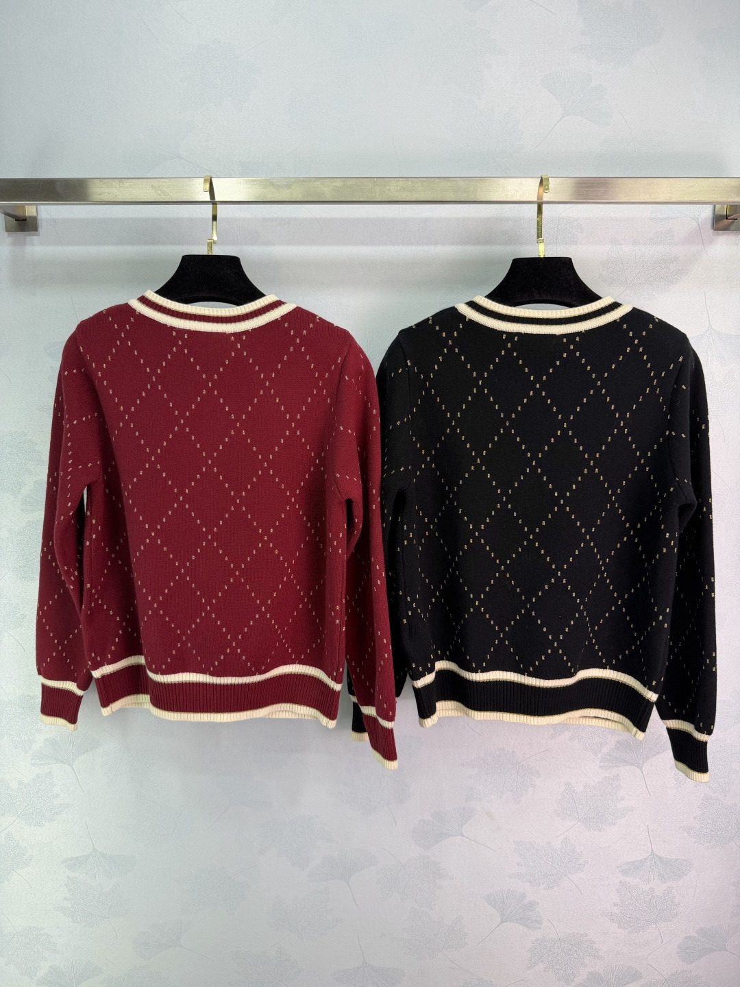 Details: Early spring new diamond-patterned knitted cardigan in red and black, with white contrast trim and metal buttons. Soft fabric, round neck, and double pockets. Classic and versatile.