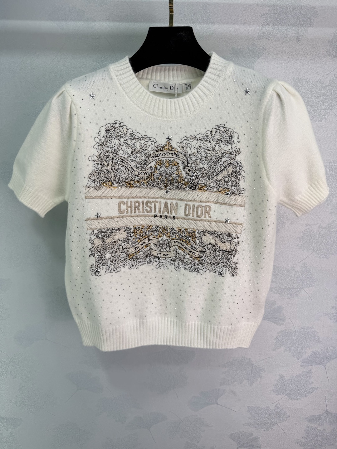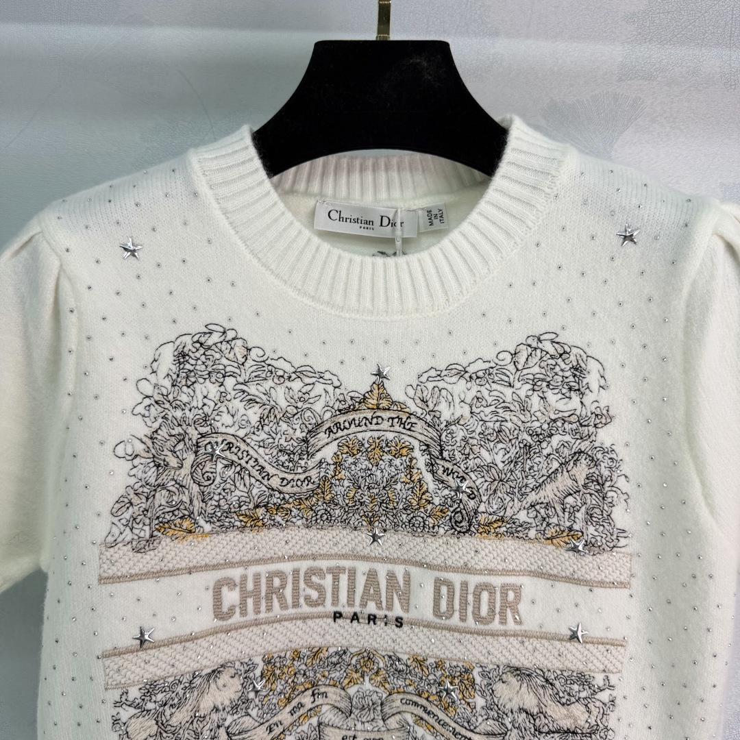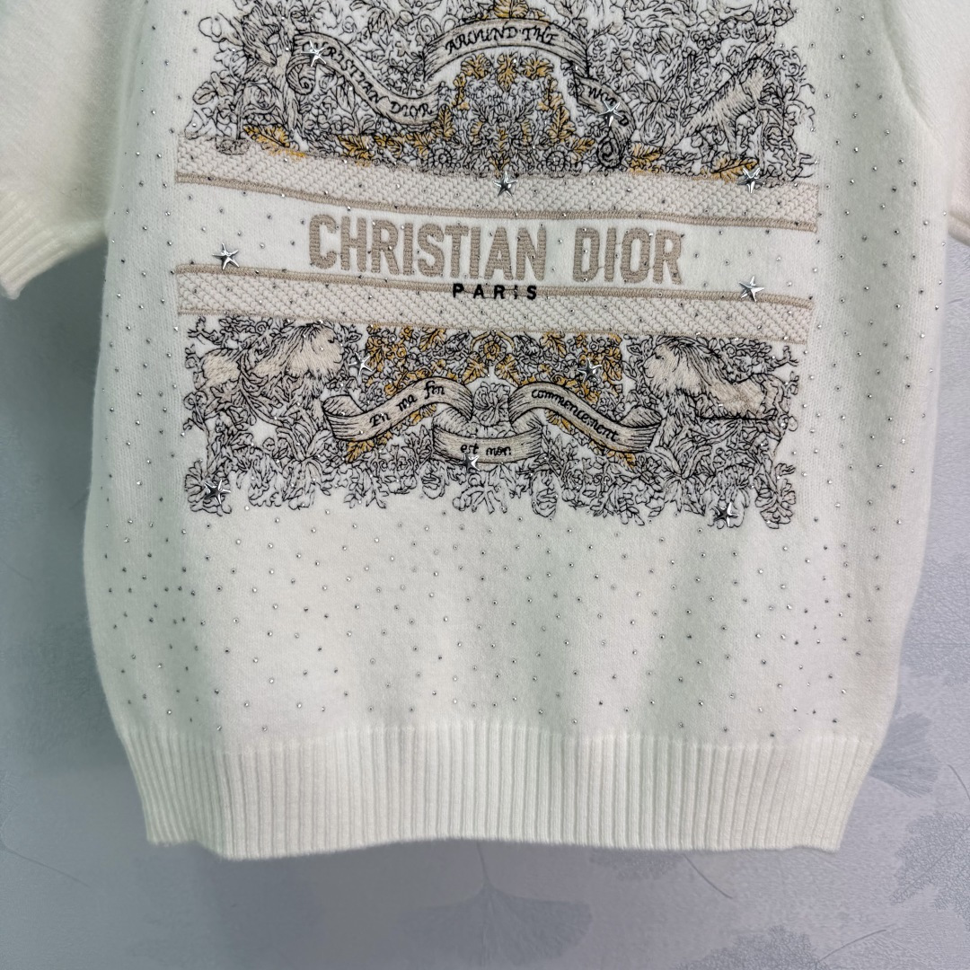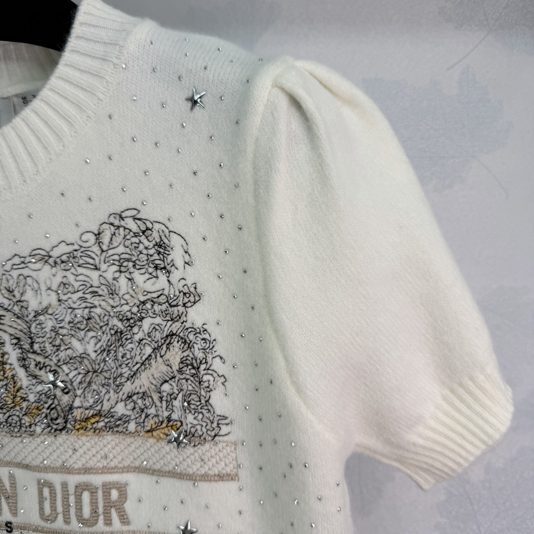 Details: Early spring embroidered sequin knitted short-sleeve sweater, made of high-quality cashmere, with detailed embroidery and sequins, short sleeves ideal for early spring or indoor wear, elegant and versatile.