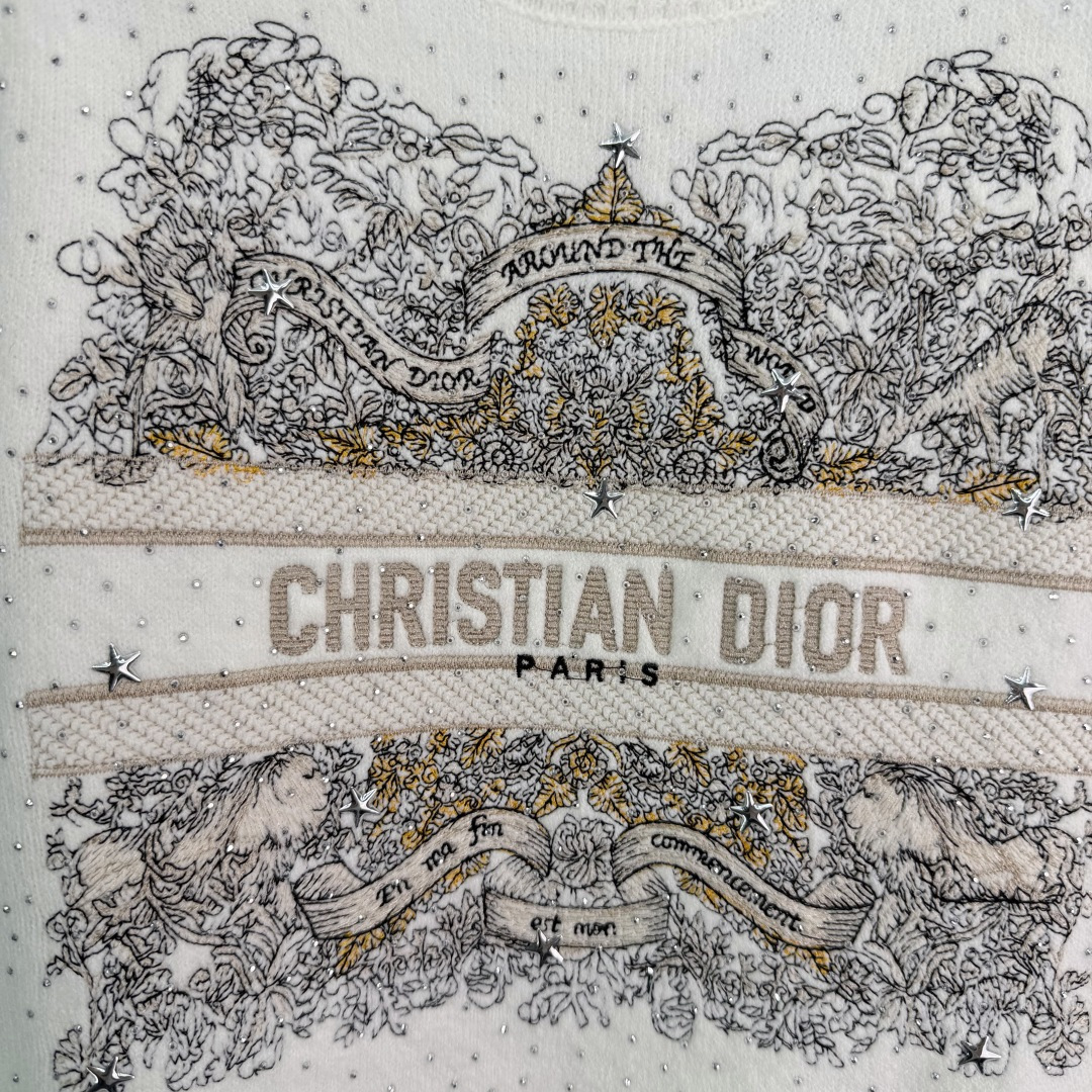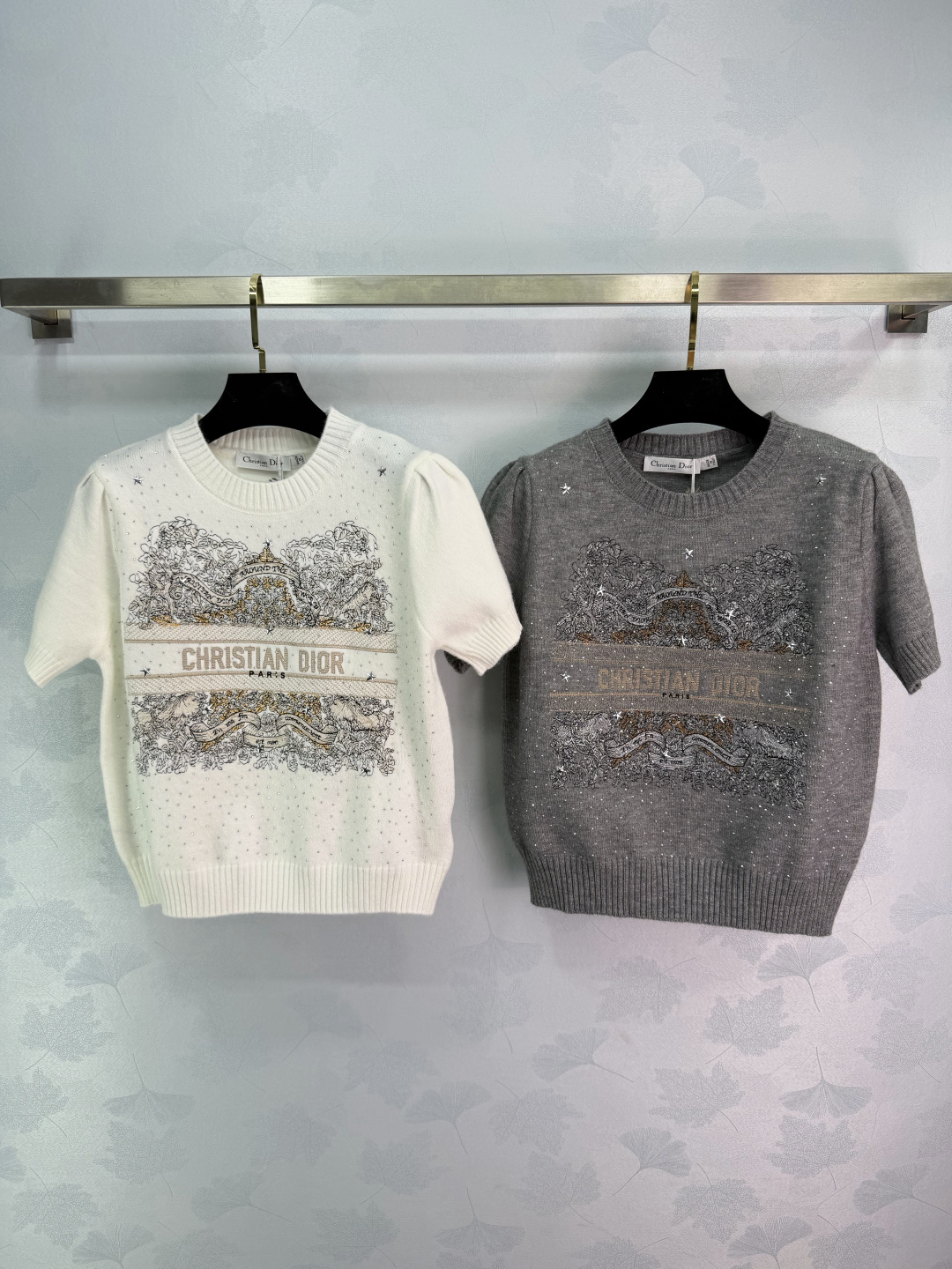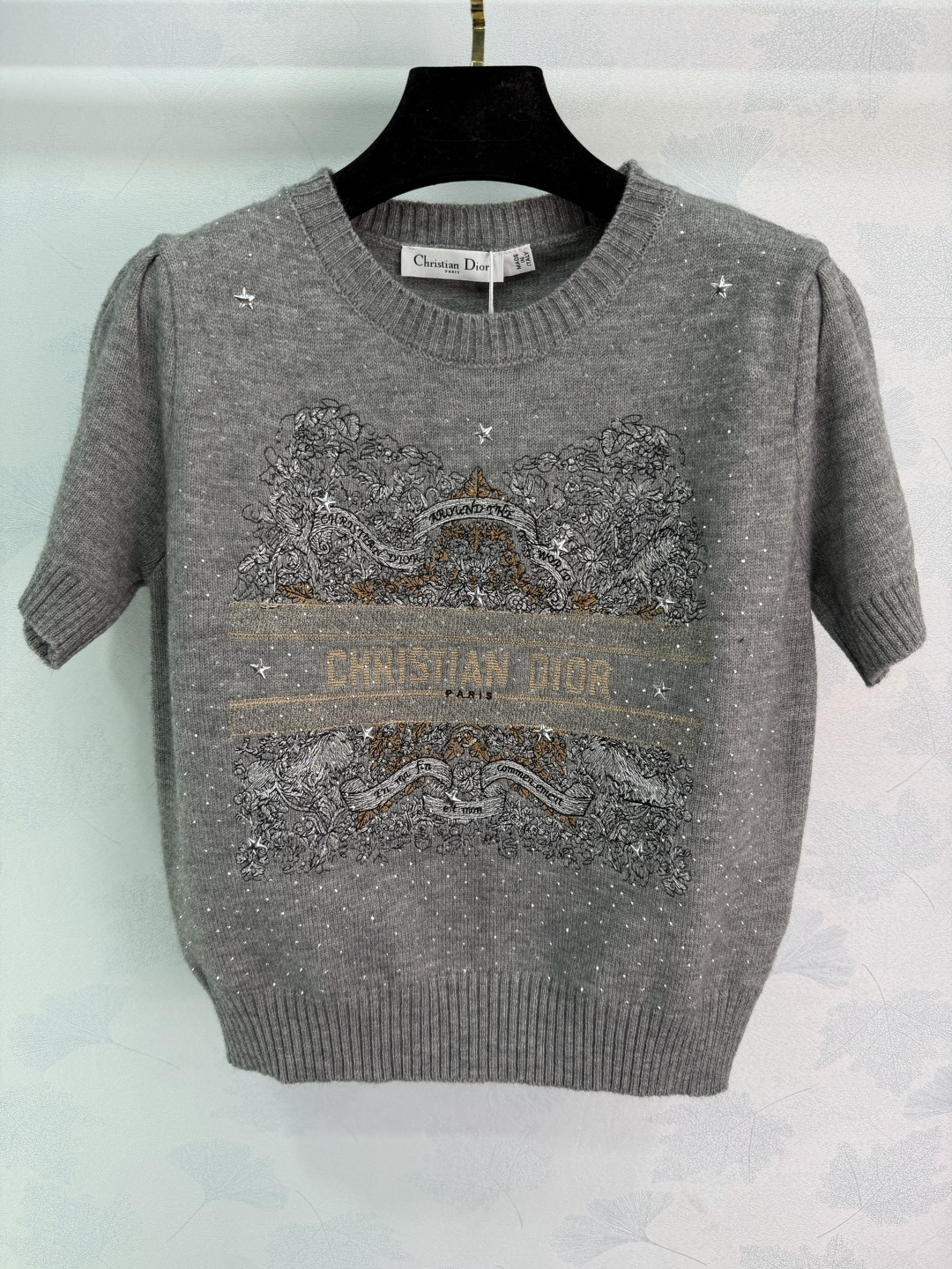 Details: Early spring embroidered sequin knitted short-sleeve sweater, made of high-quality cashmere, with detailed embroidery and sequins, short sleeves ideal for early spring or indoor wear, elegant and versatile.