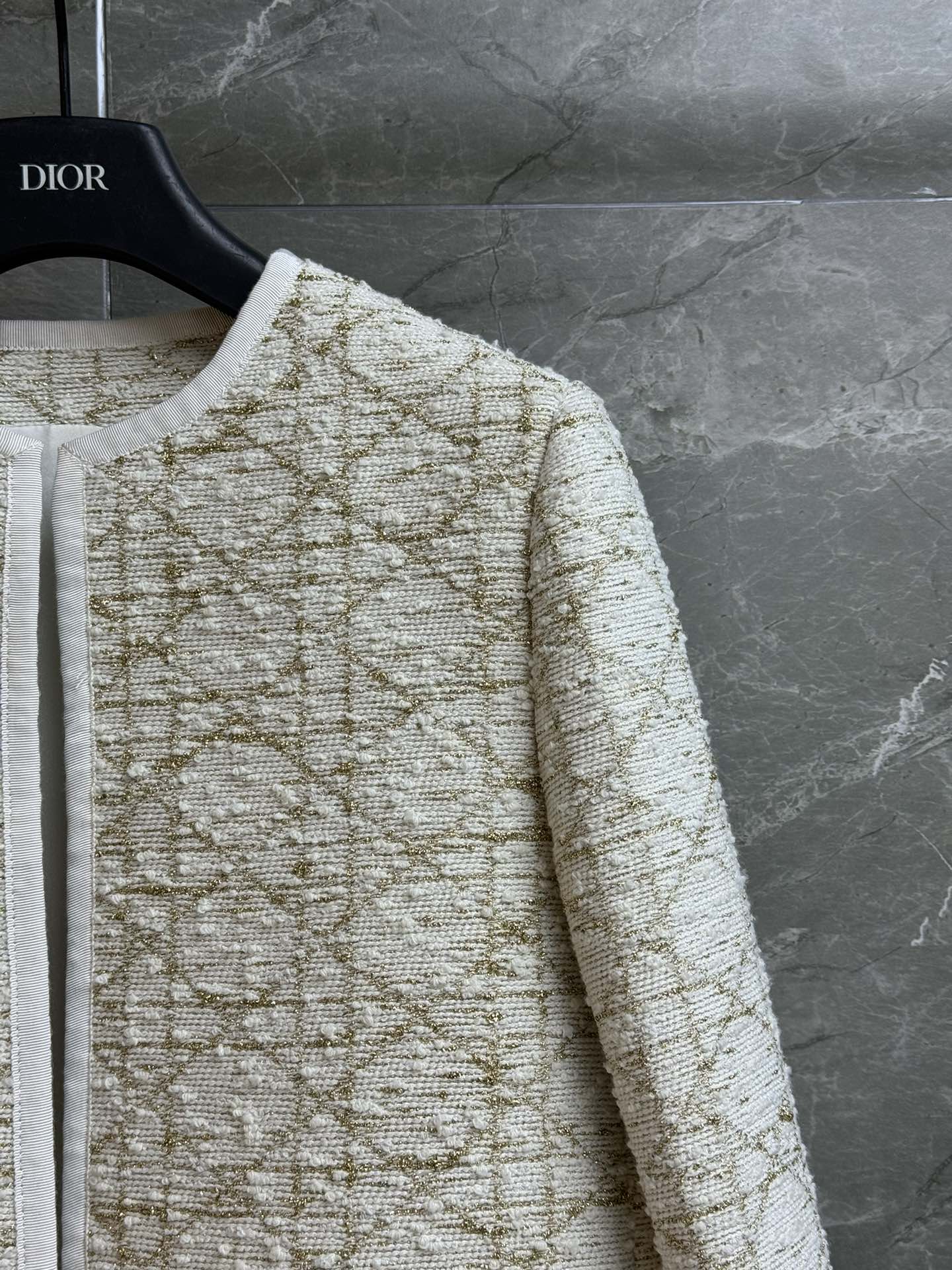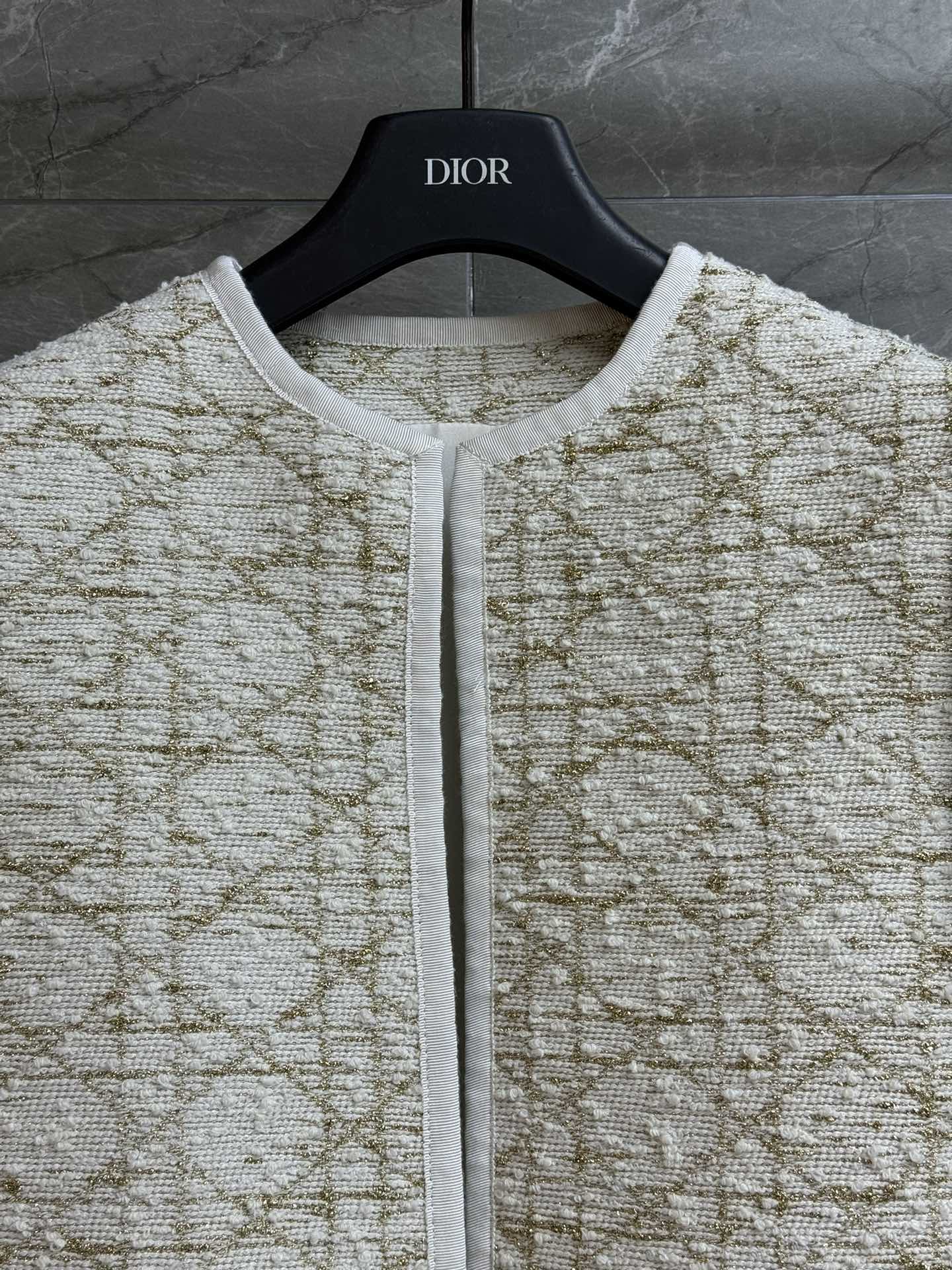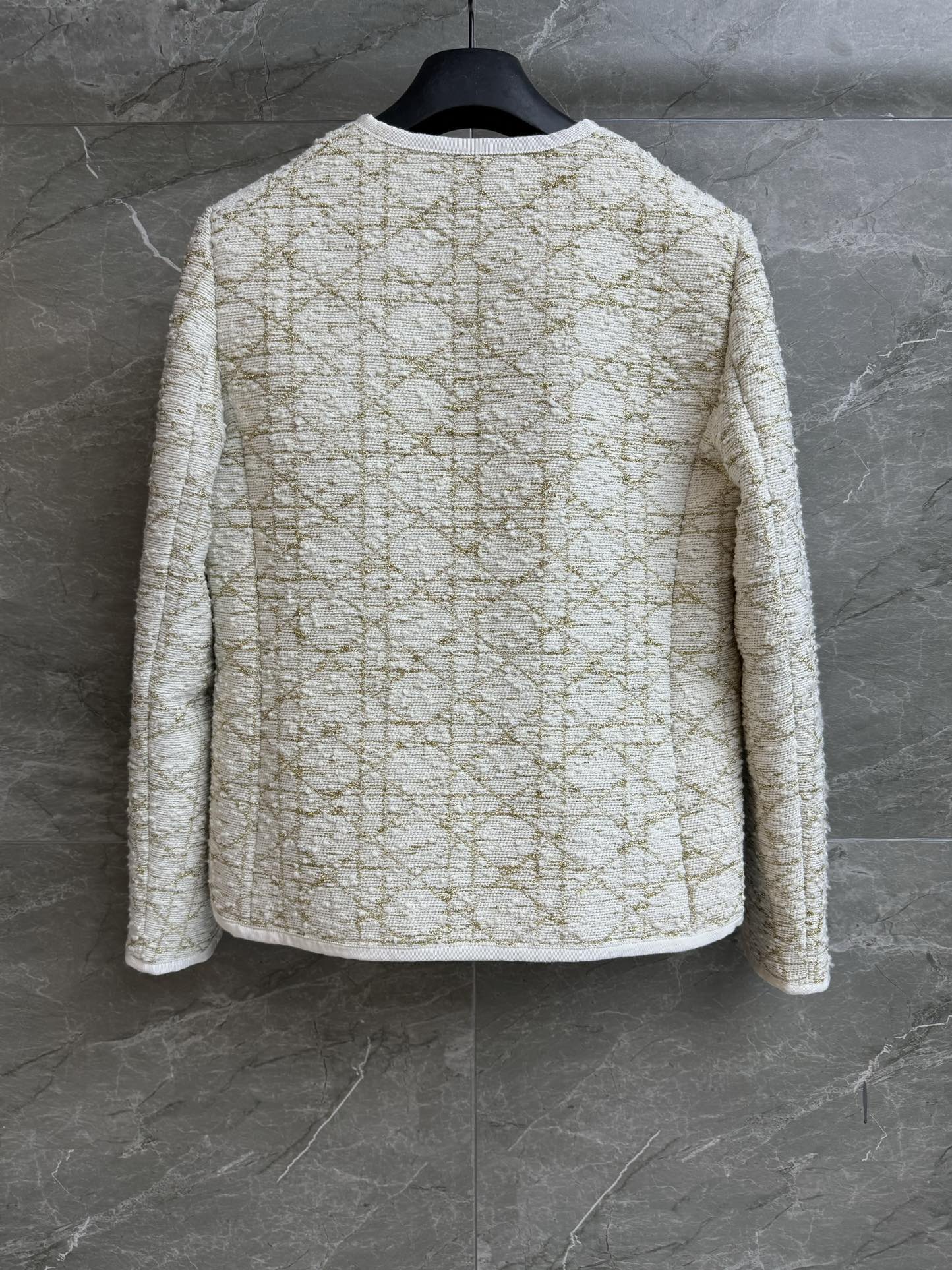 Details: Early spring rattan checkered gold-thread coat, round collar, rattan checkered gold-thread embroidery, platinum color, customized blended tweed, slim fit.