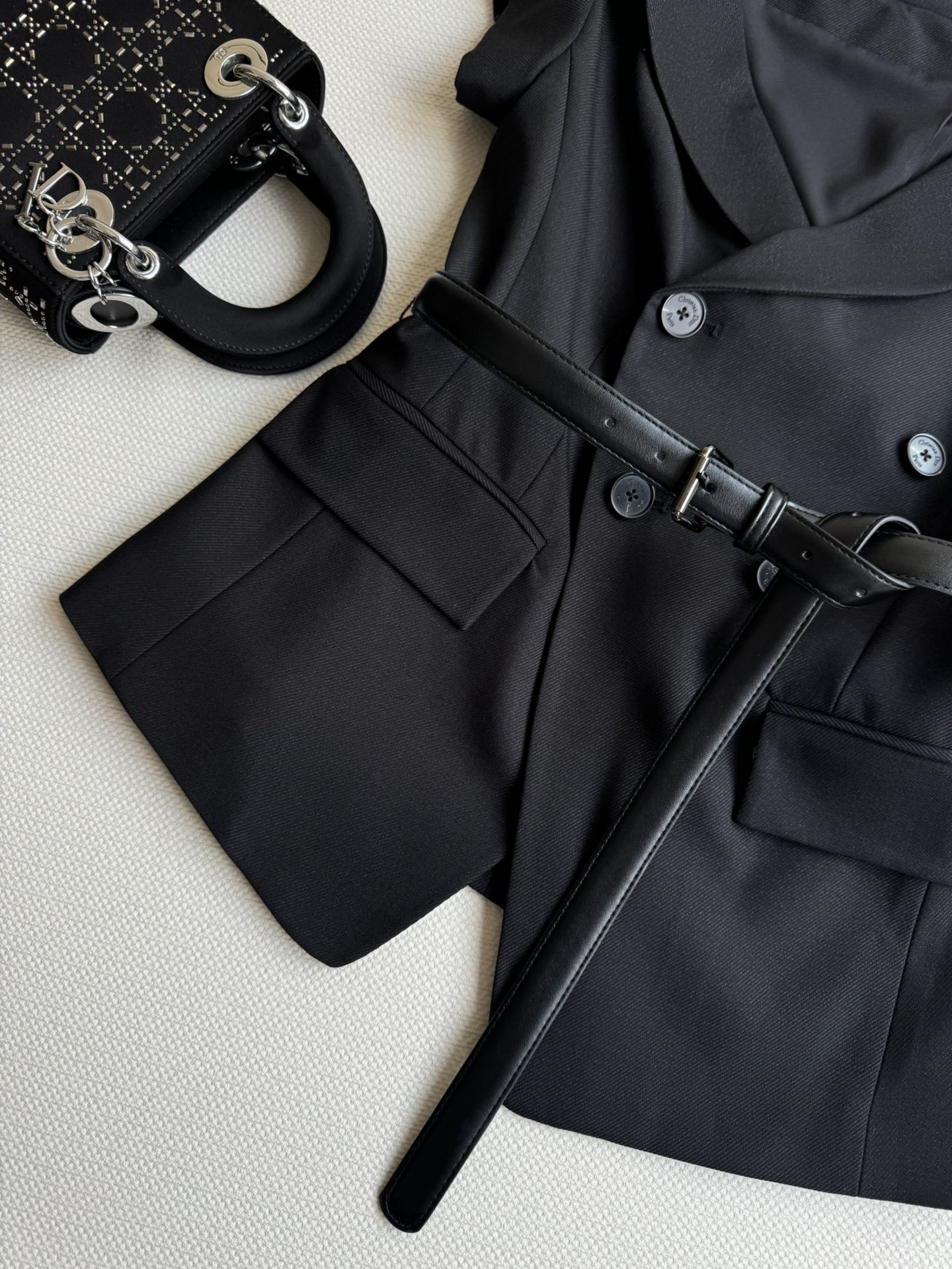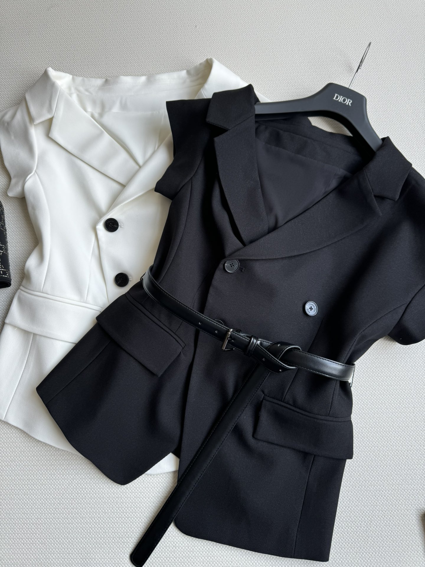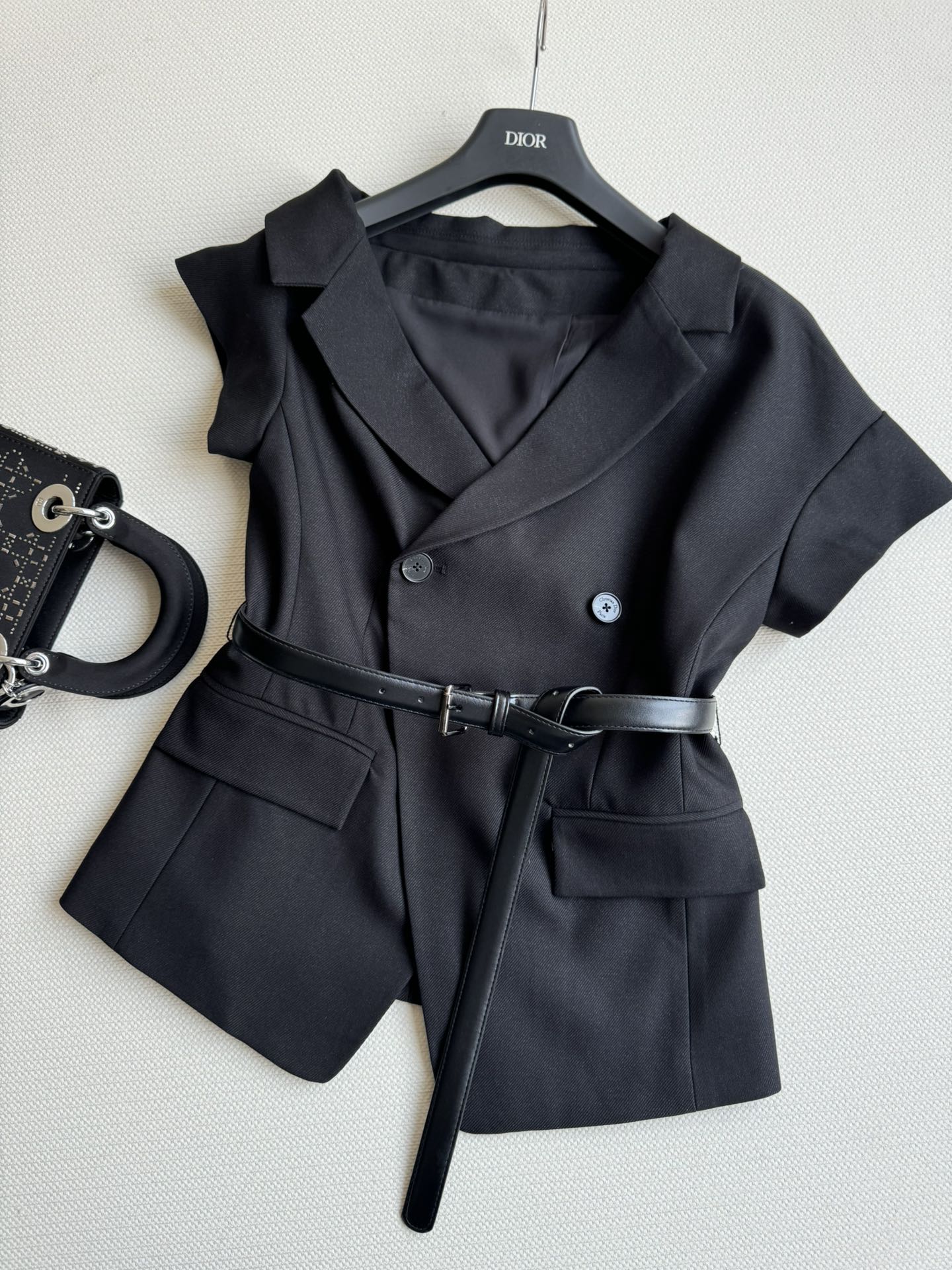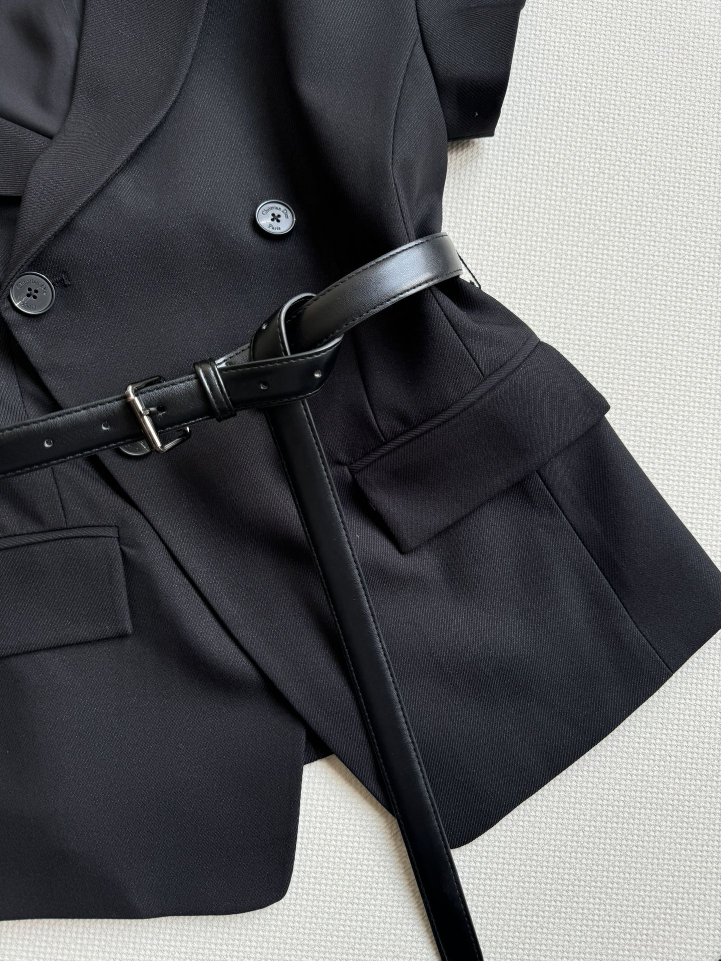 Details: Irregular suit-style top, fashionable lapel, asymmetric sleeves, double-breasted, with belt, slimming and stylish