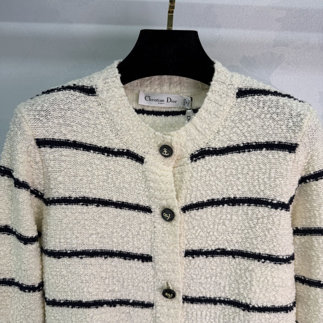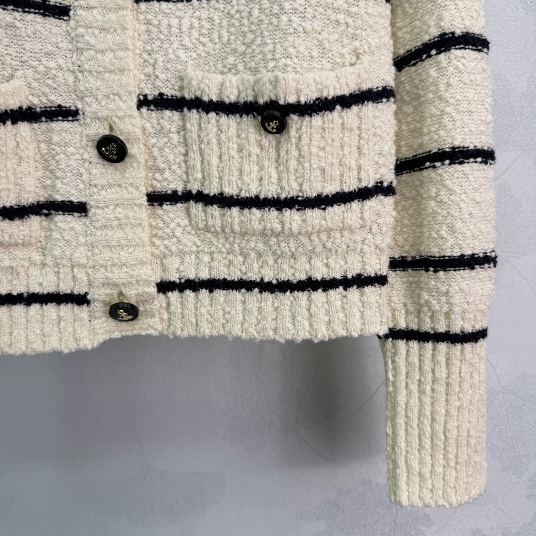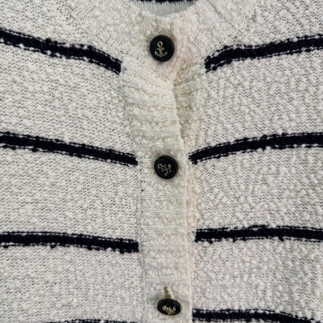 Details: Early autumn round - neck knitted striped cardigan, made of custom yarn, with anchor logo and two - color stripes, simple and elegant