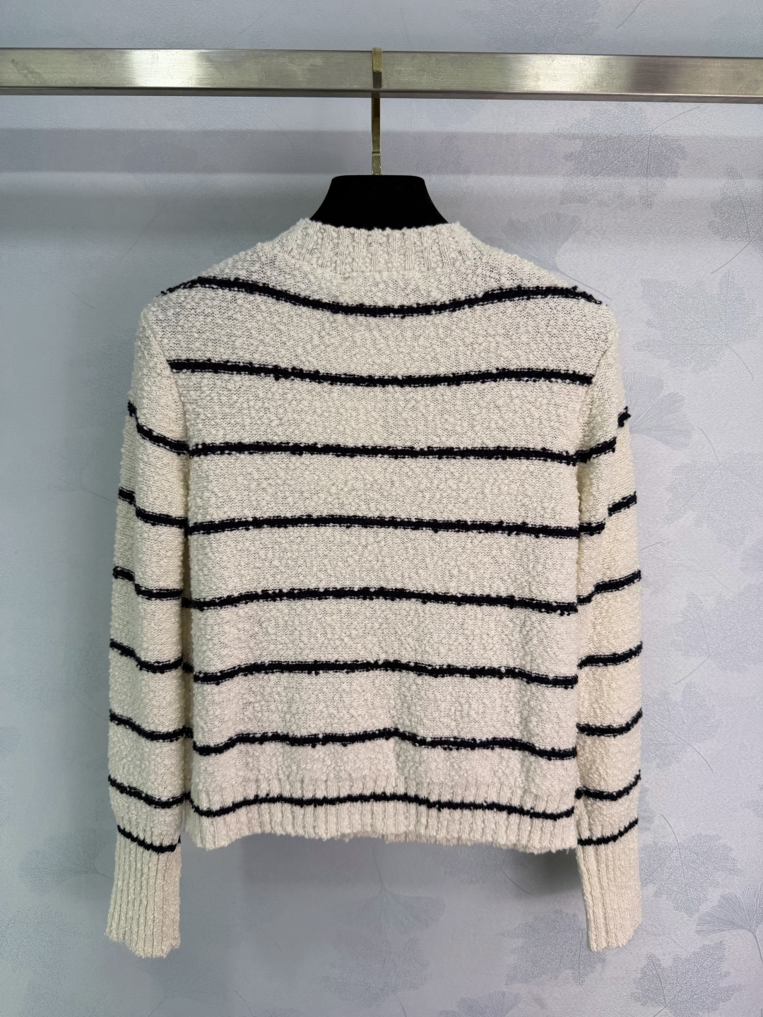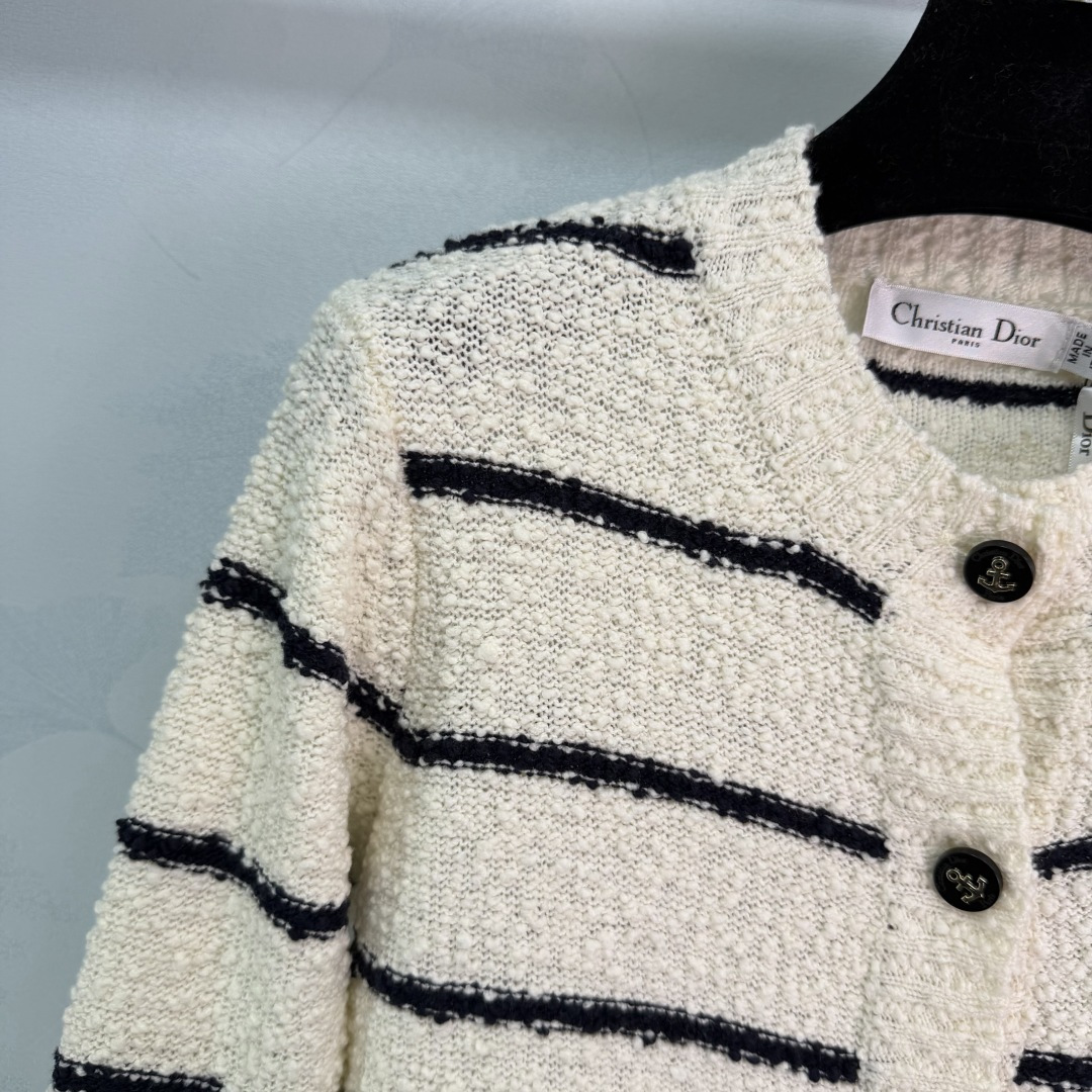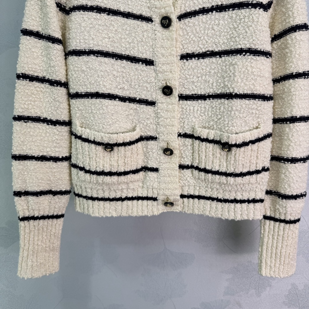 Details: Early autumn round - neck knitted striped cardigan, made of custom yarn, with anchor logo and two - color stripes, simple and elegant