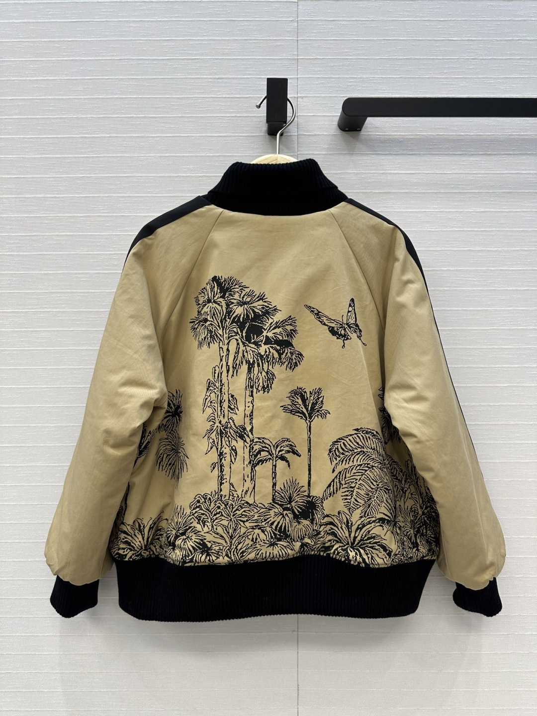 Details: Khaki baseball jacket with coconut tree print, made of high - quality cotton, warm and stylish. High - end customization, fine craftsmanship