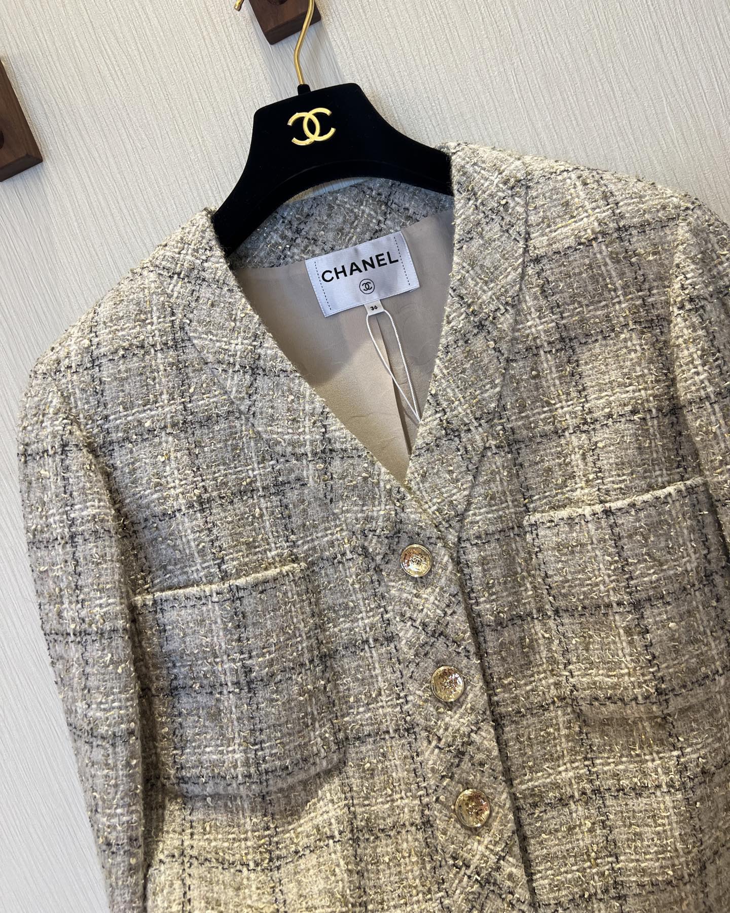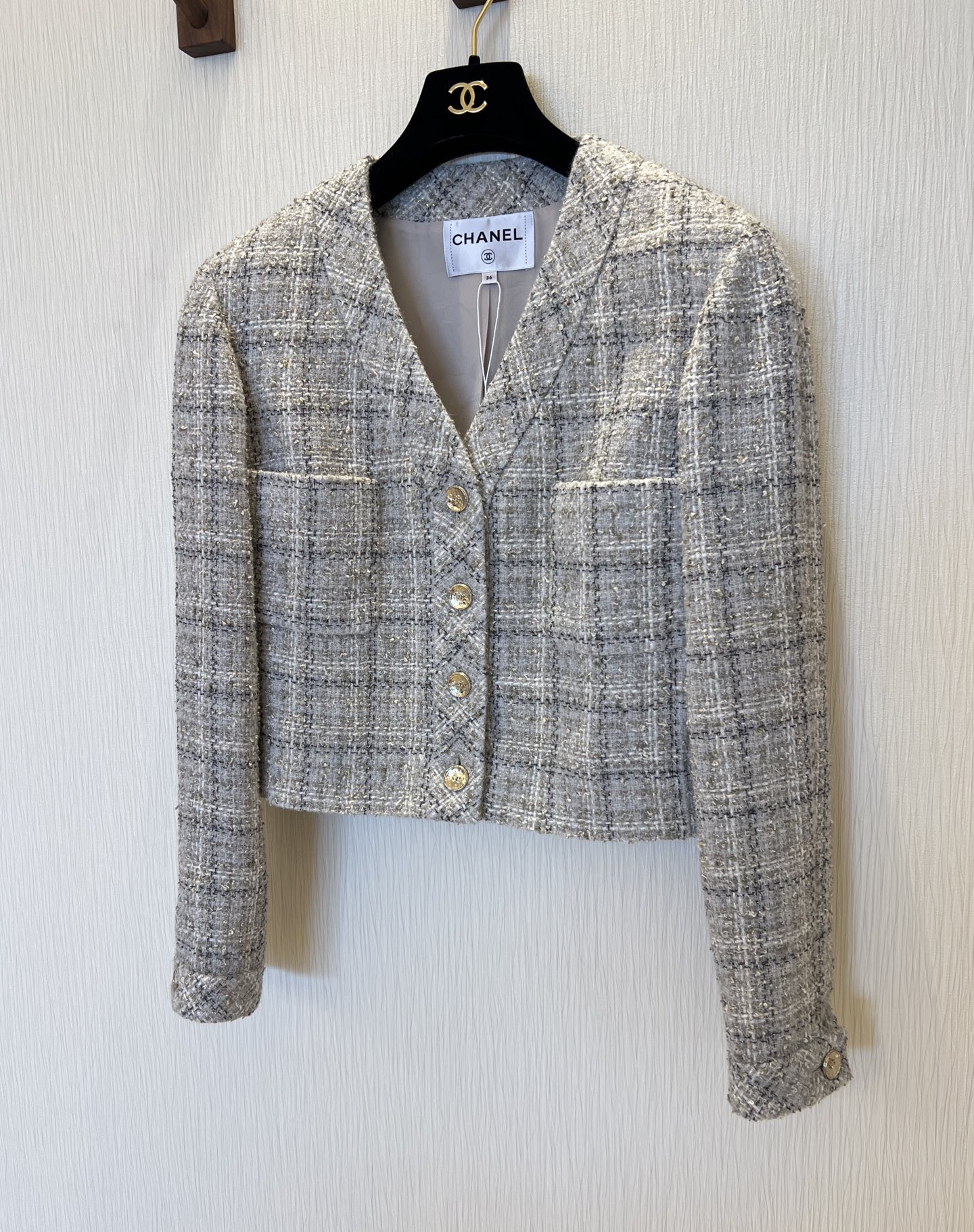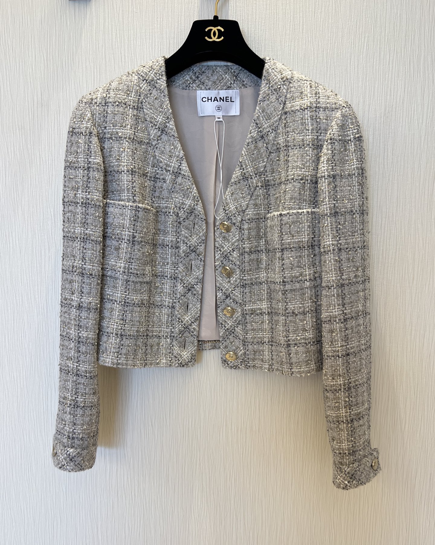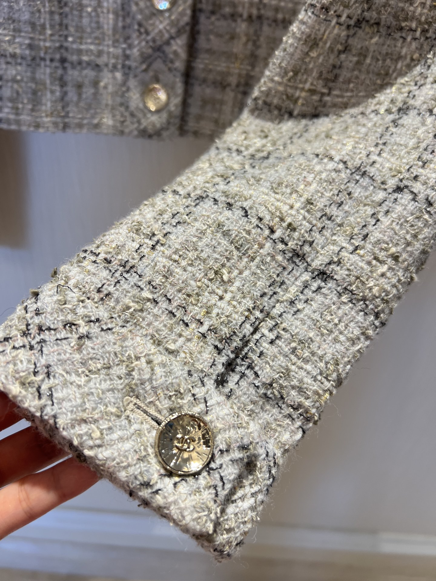 Details: V-neck tweed coat crafted from classic soft wool fabric in low-saturation colors, exuding a gentle and fashionable vibe suitable for both work and daily wear.