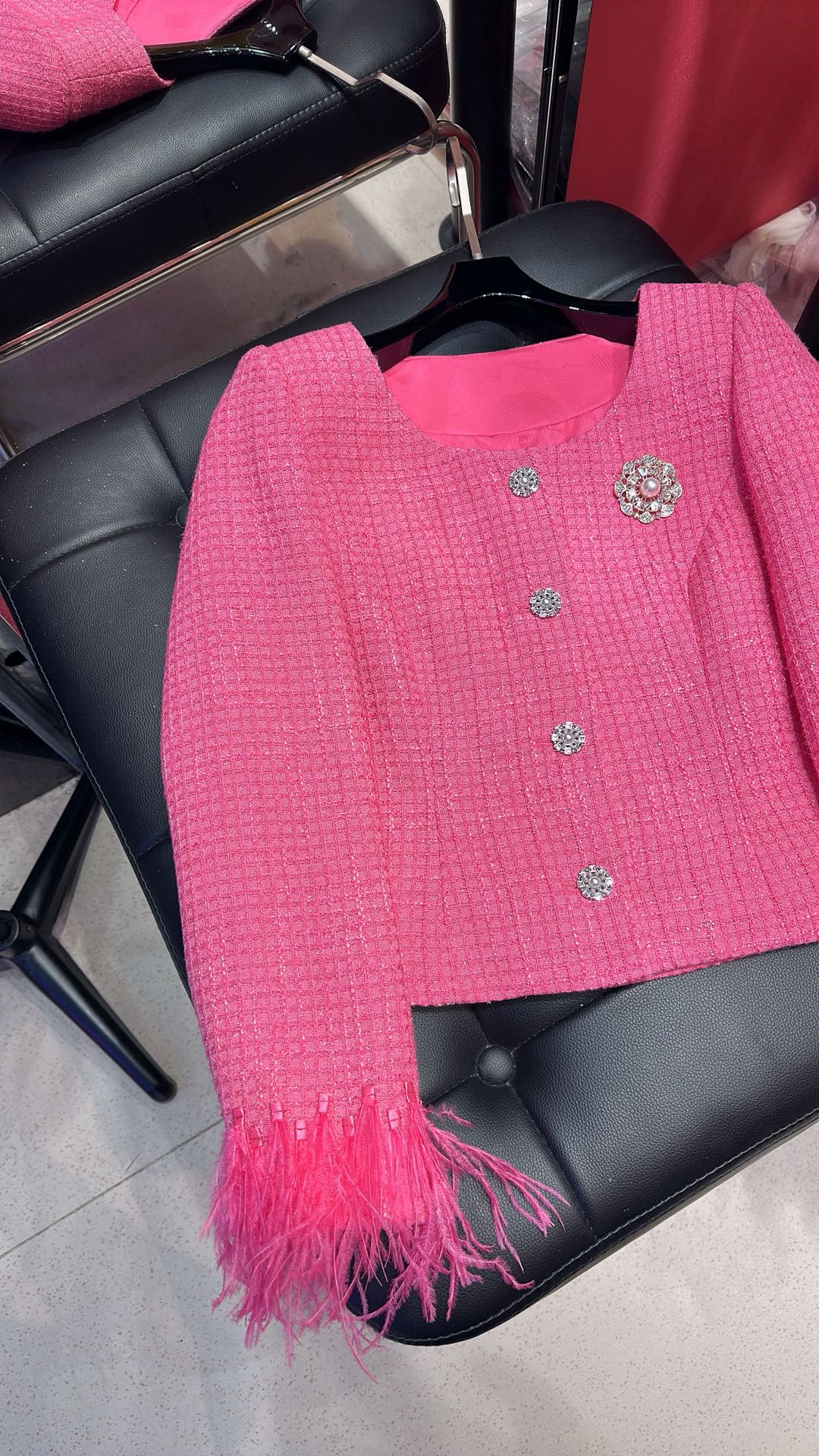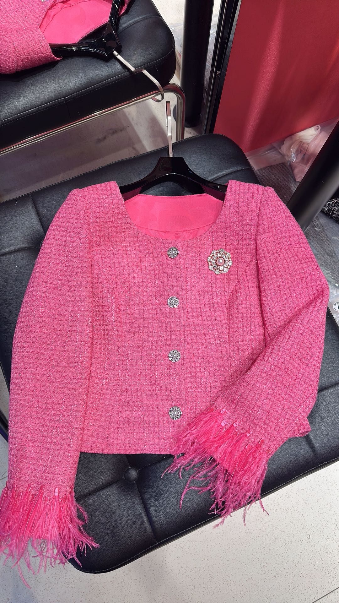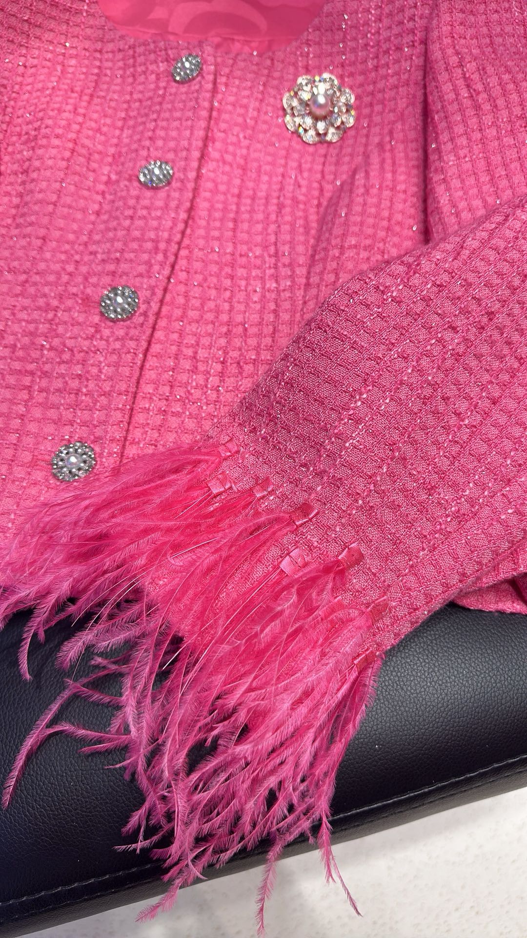 Details: Fairy - style thin fabric coat with ostrich feather splicing, elegant design, sizes 36, 38, 40.