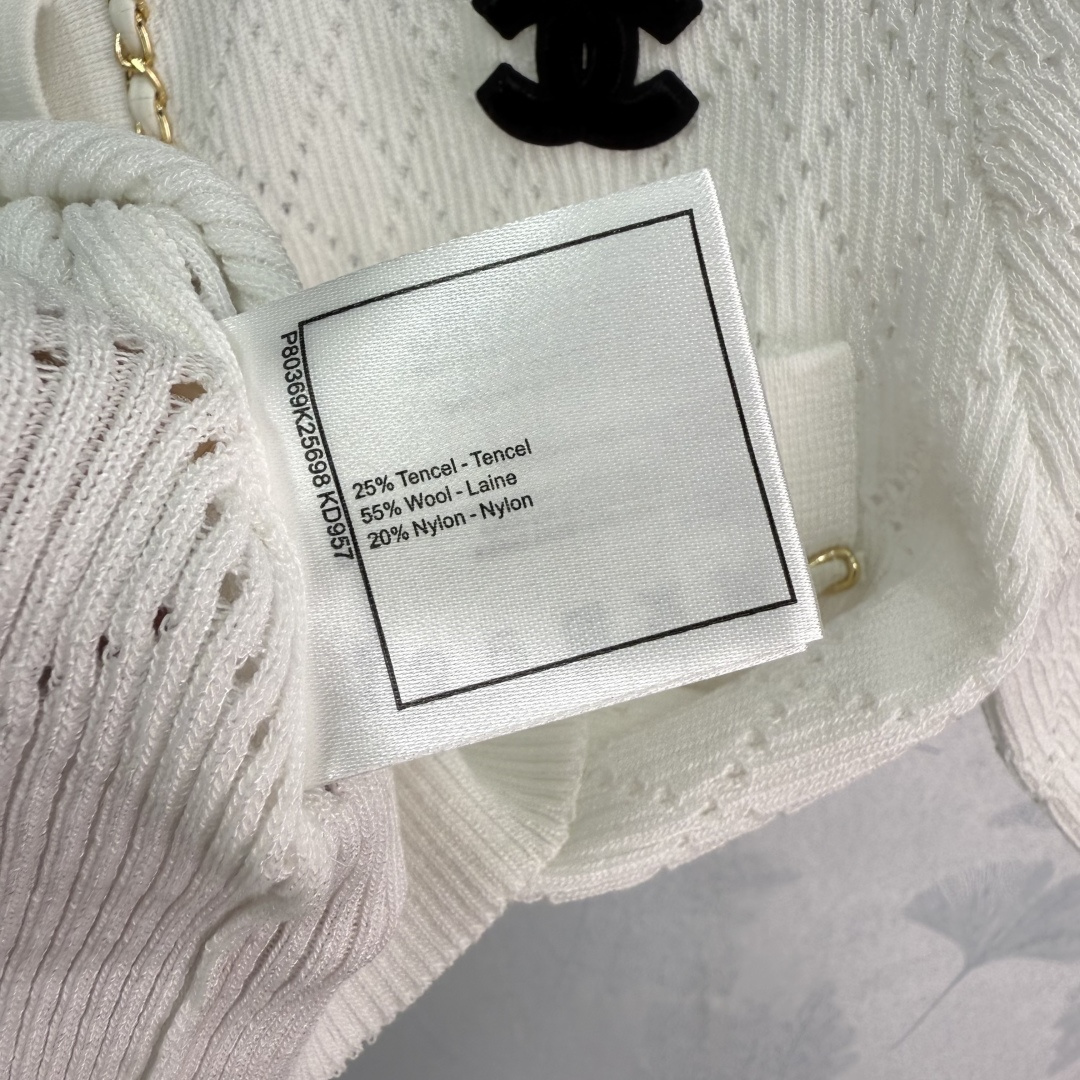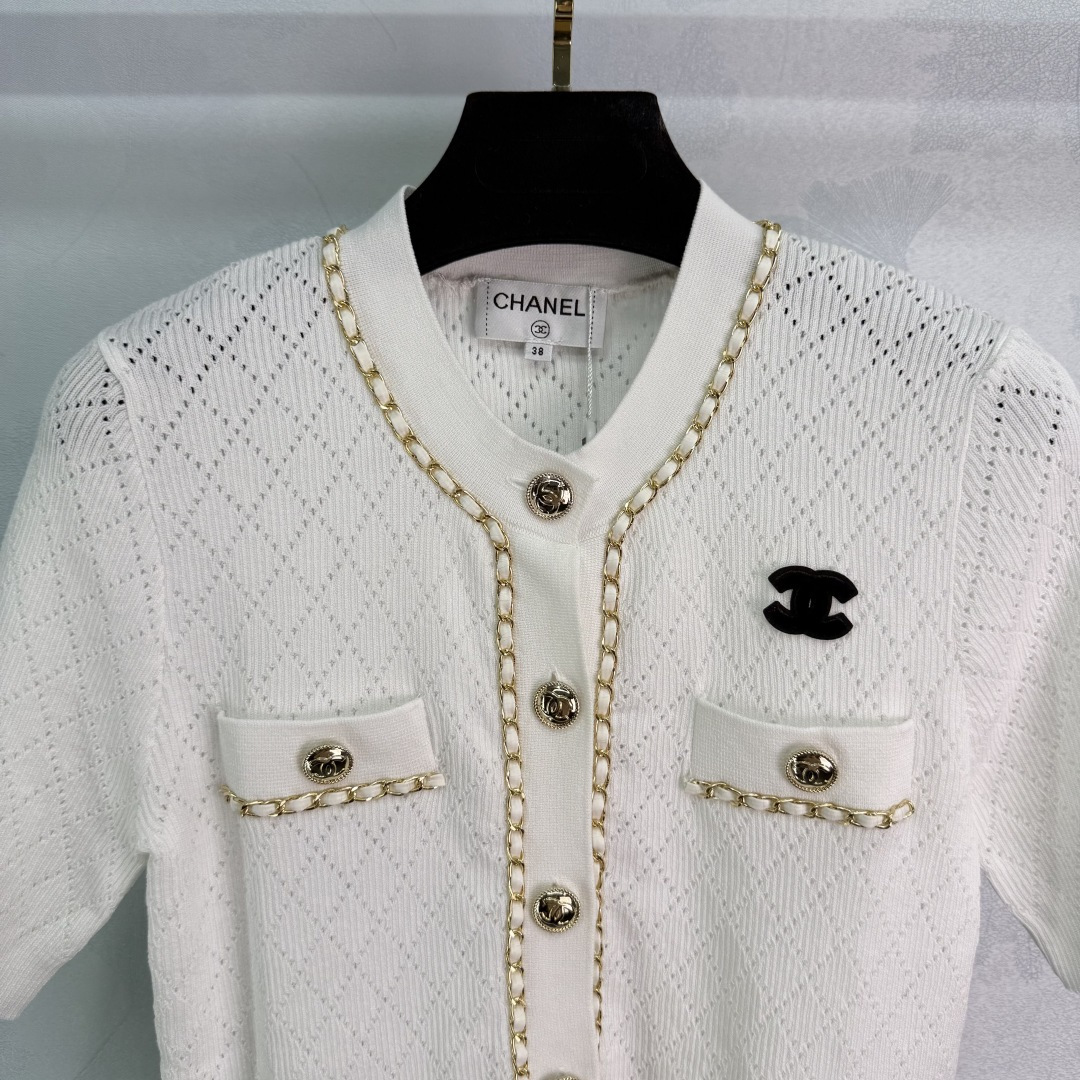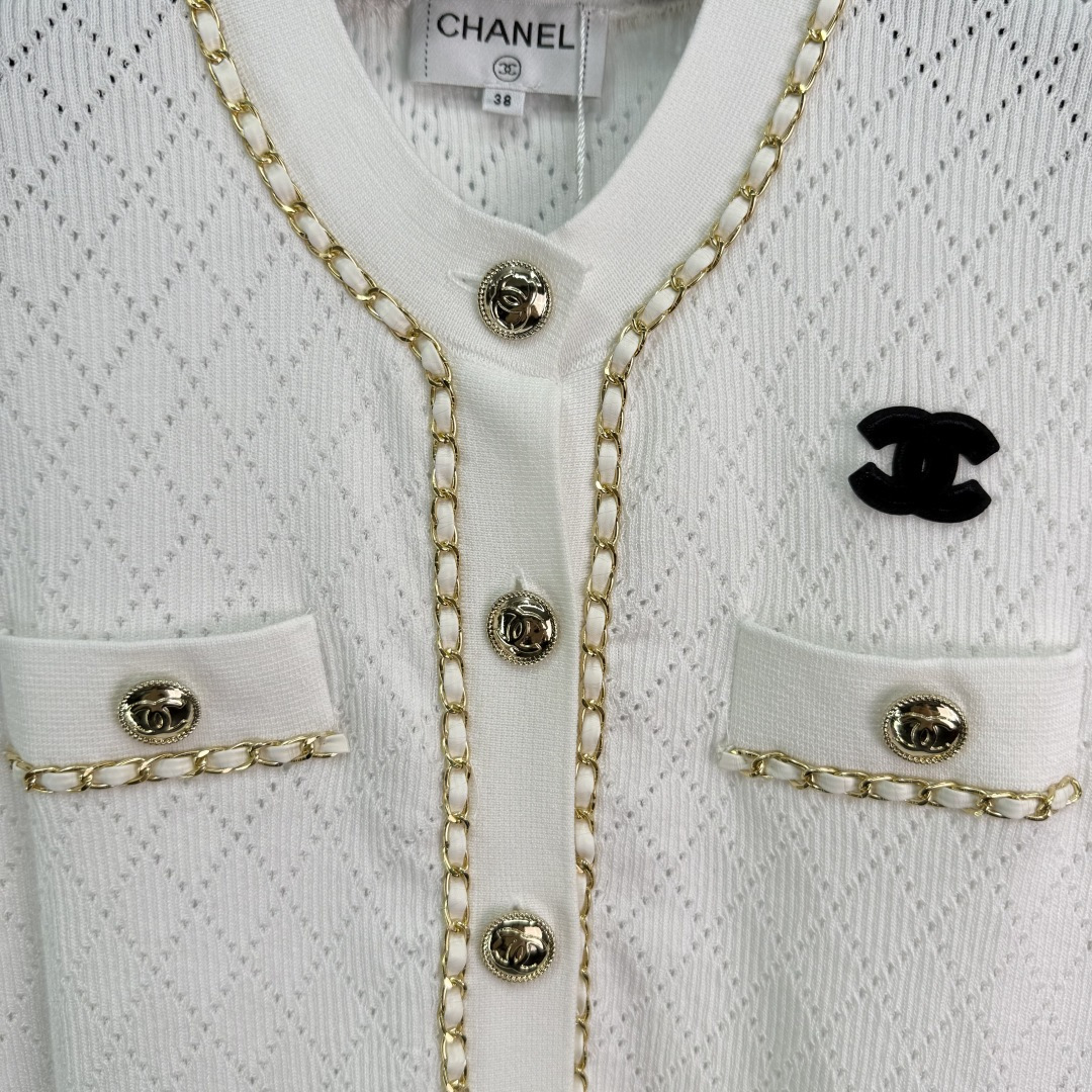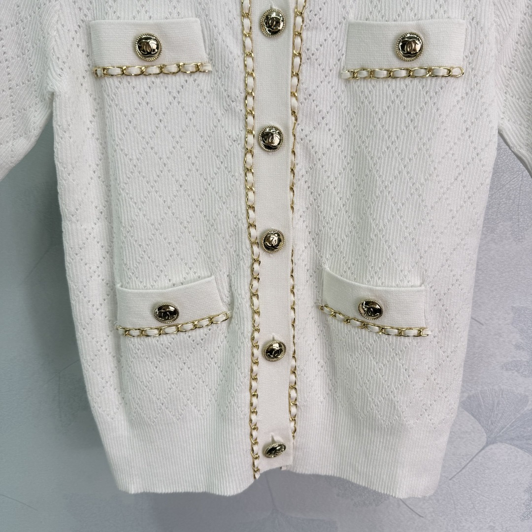 Details: Autumn new chain-embellished knitted cardigan with classic double C logo. Hollowed-out diamond pattern, slim fit, soft fabric, stylish.