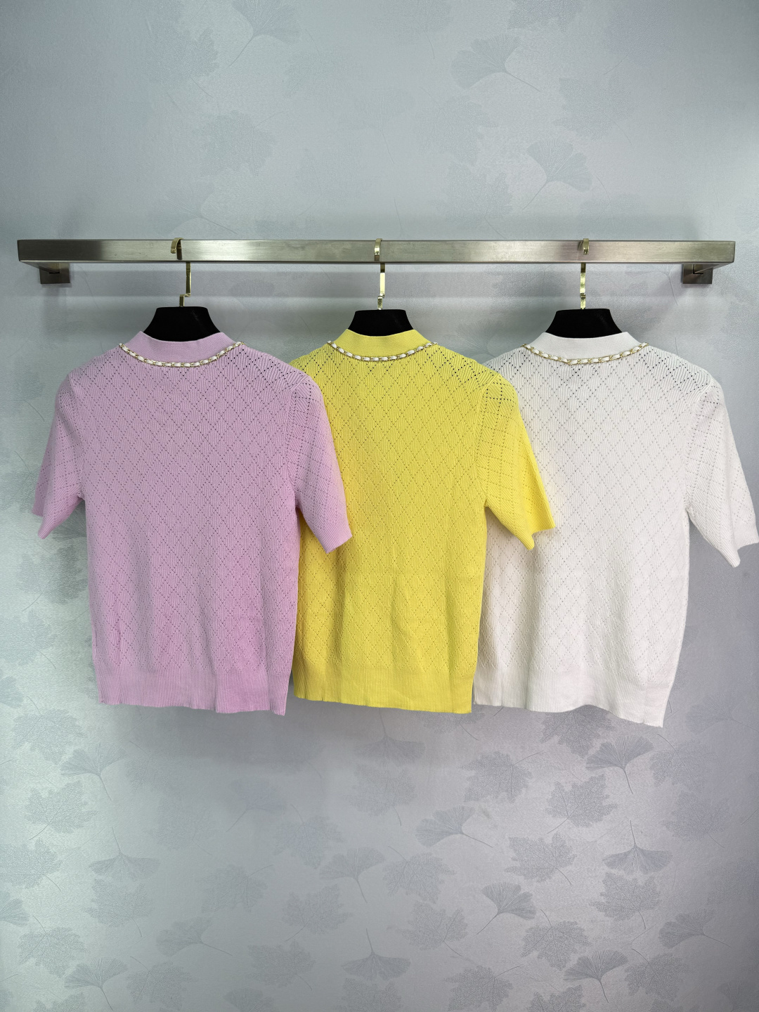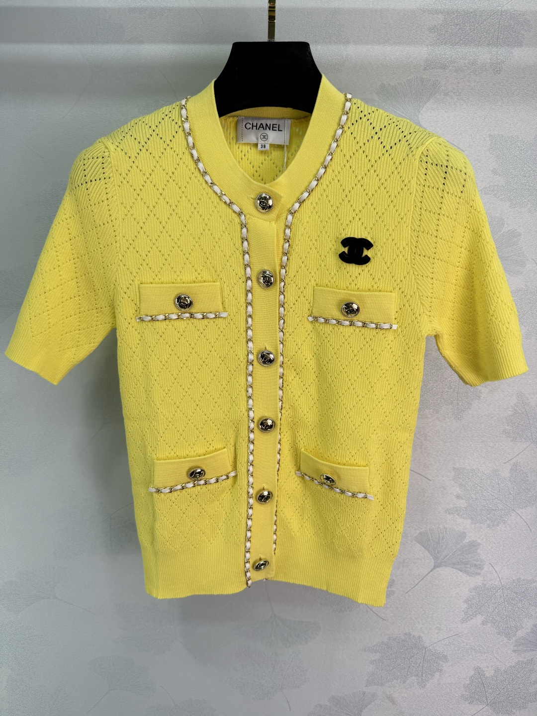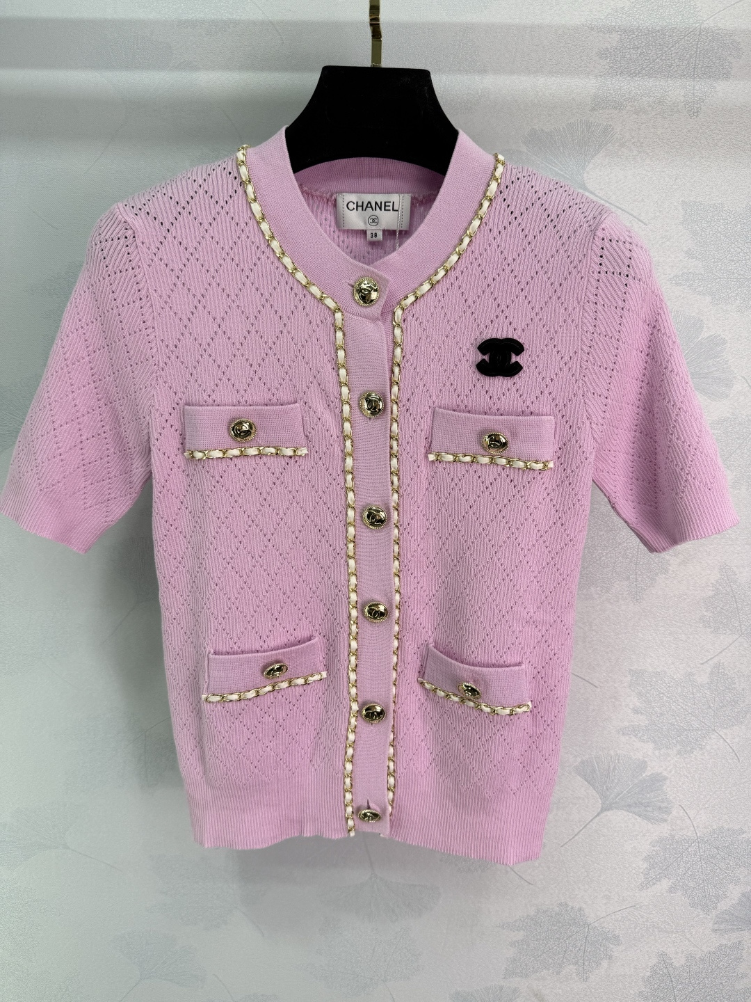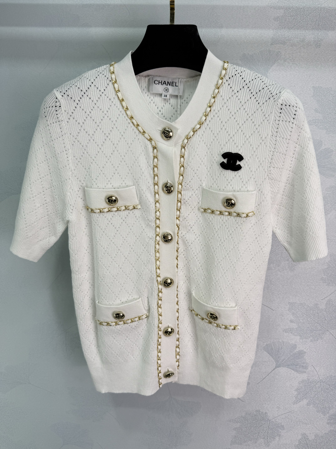 Details: Autumn new chain-embellished knitted cardigan with classic double C logo. Hollowed-out diamond pattern, slim fit, soft fabric, stylish.