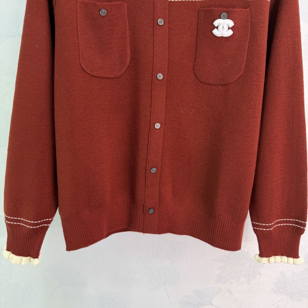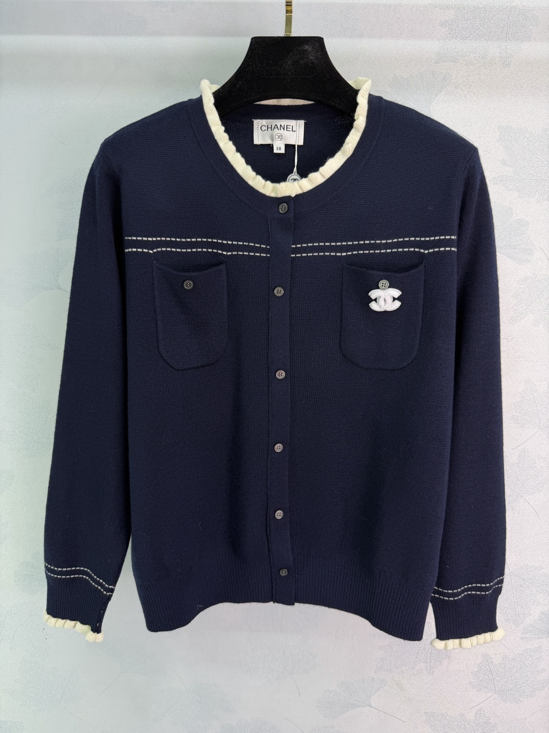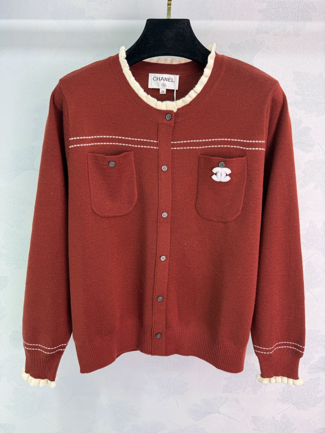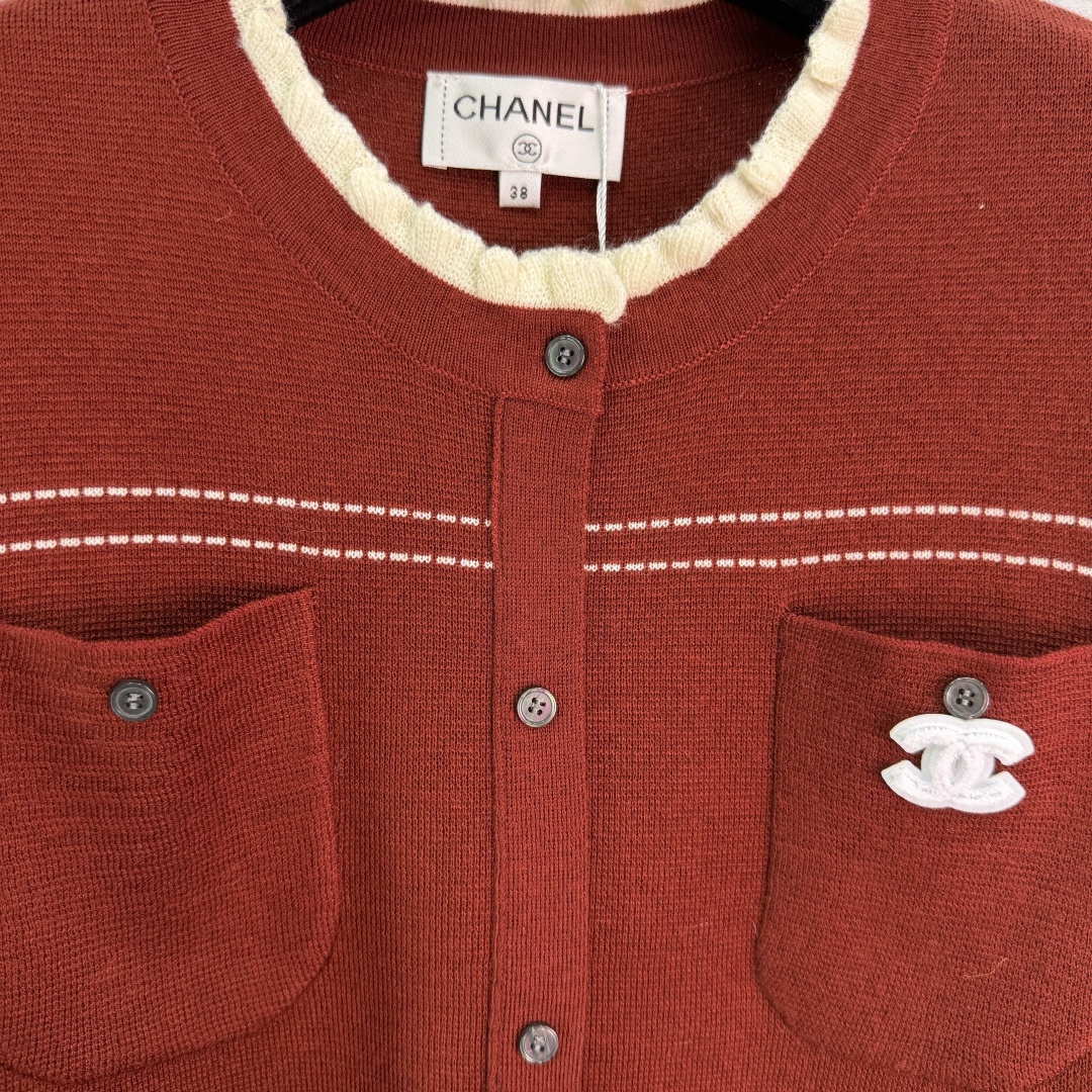 Details: Early Spring Color - blocked Round - neck Knitted Cardigan, High - quality Wool, with Double C Logo Embroidery, Elegant