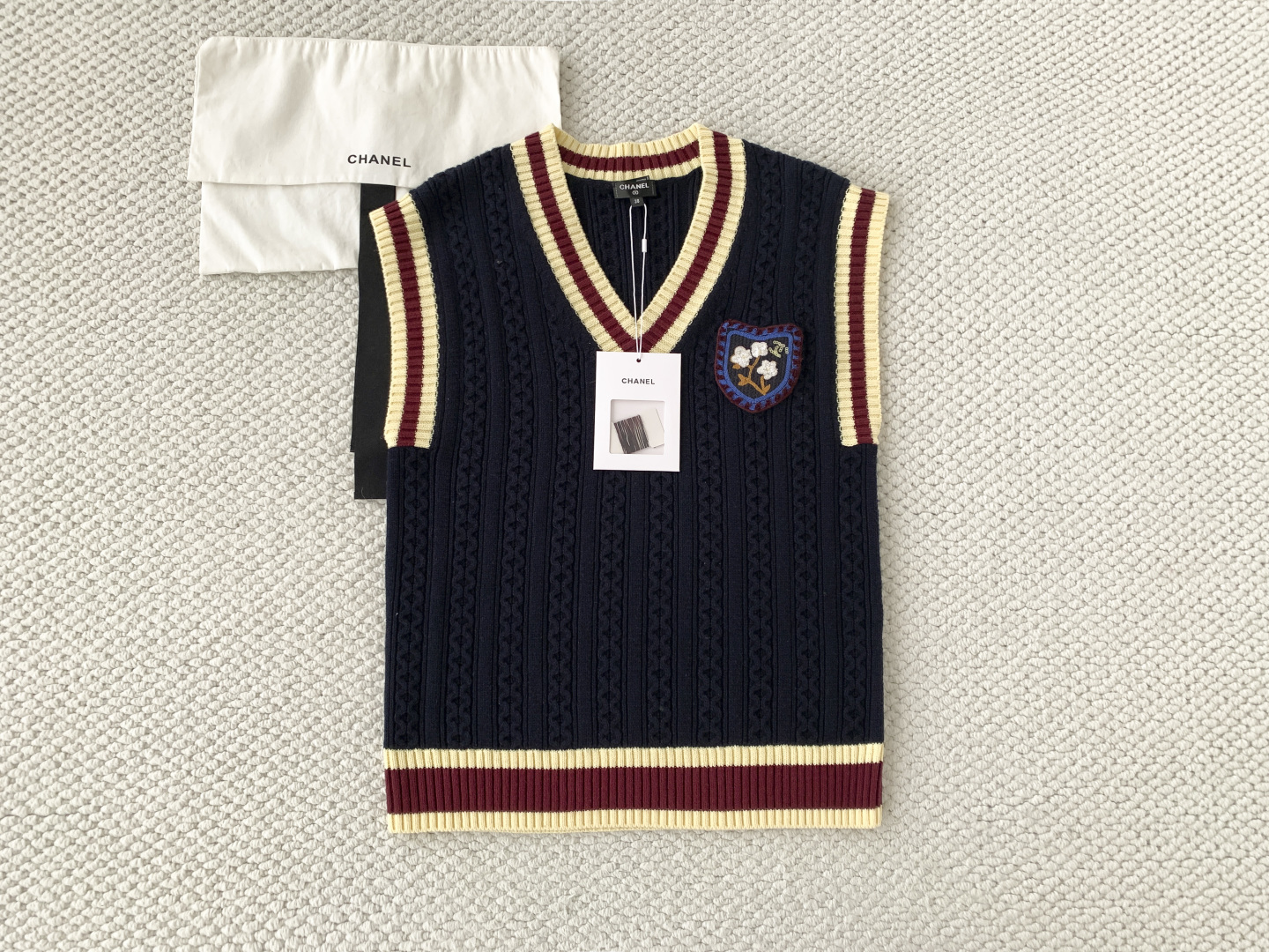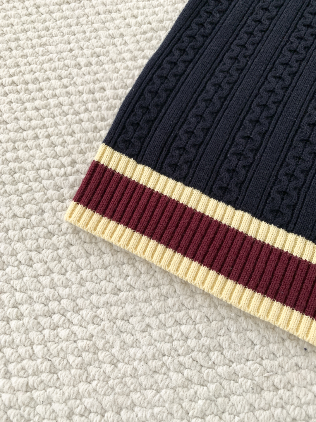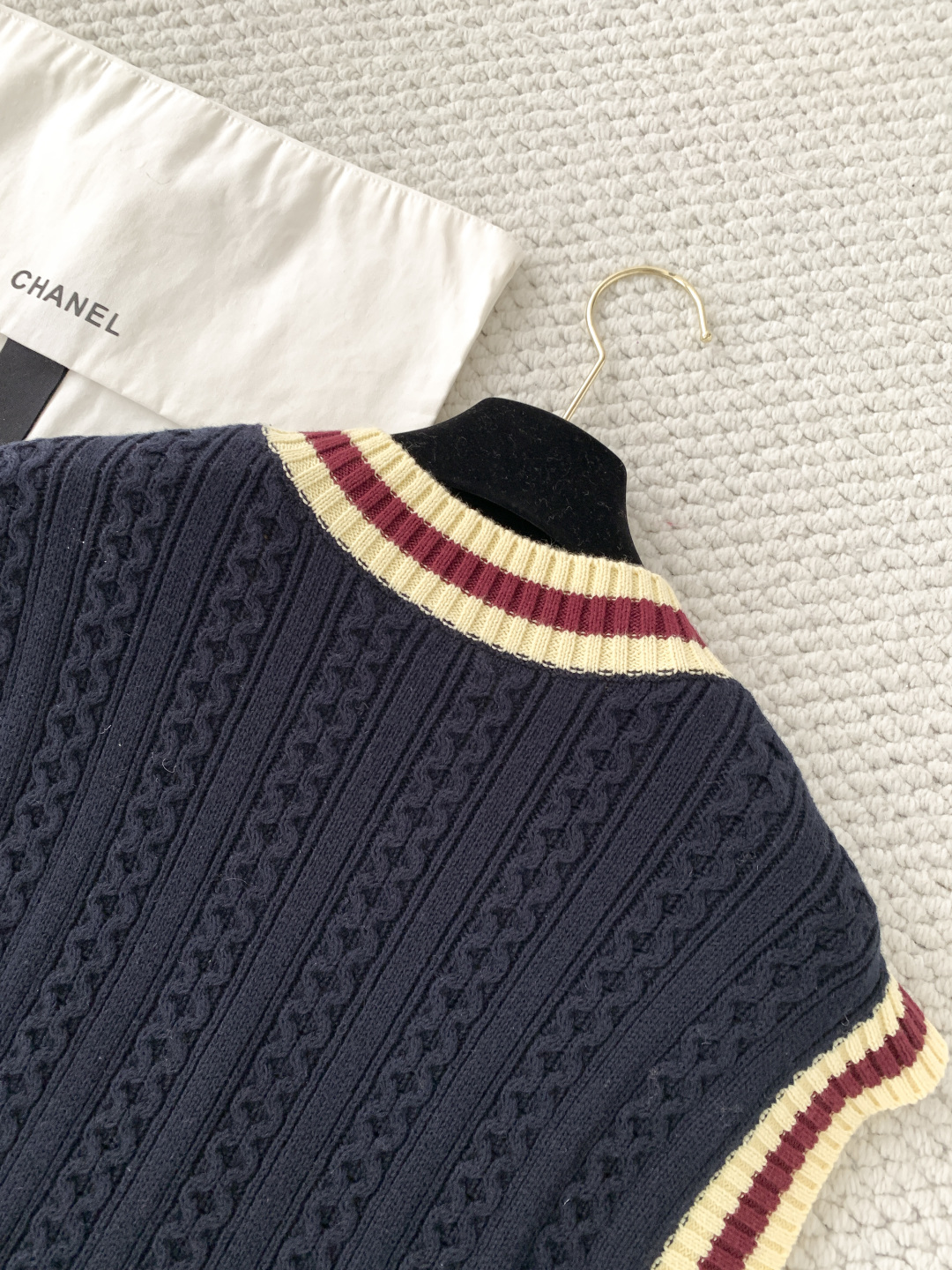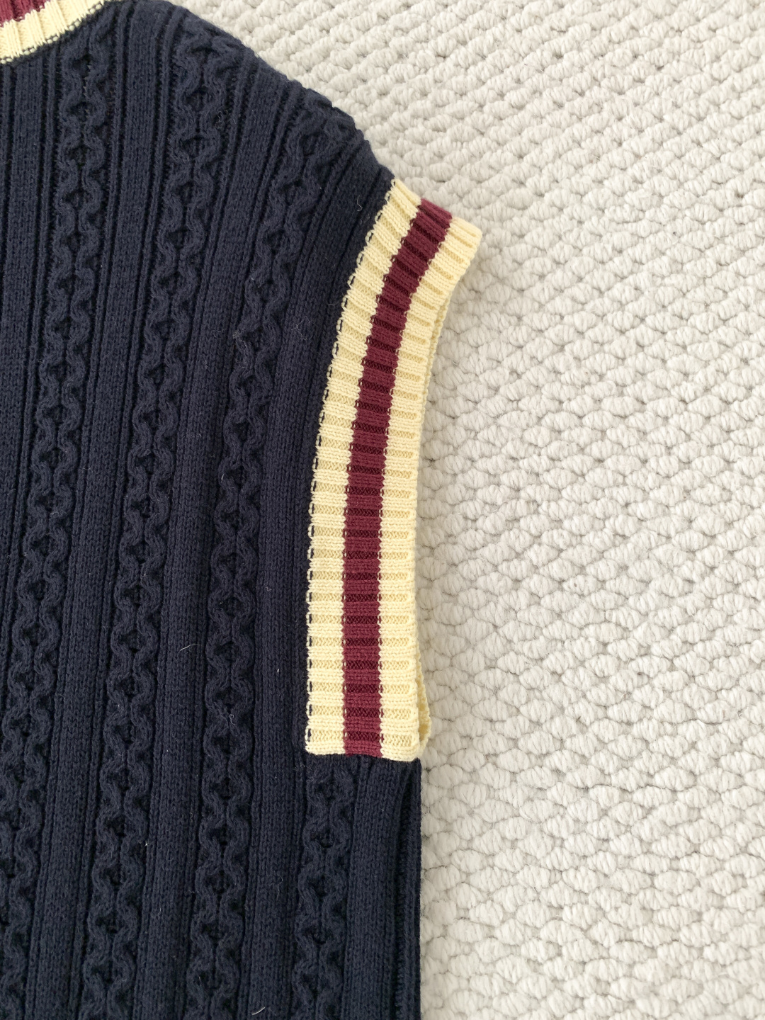 Details: College-style colliding color dark blue knitted vest with cloth bag.