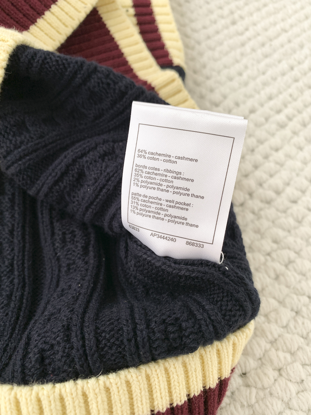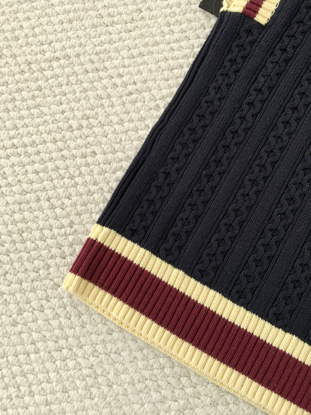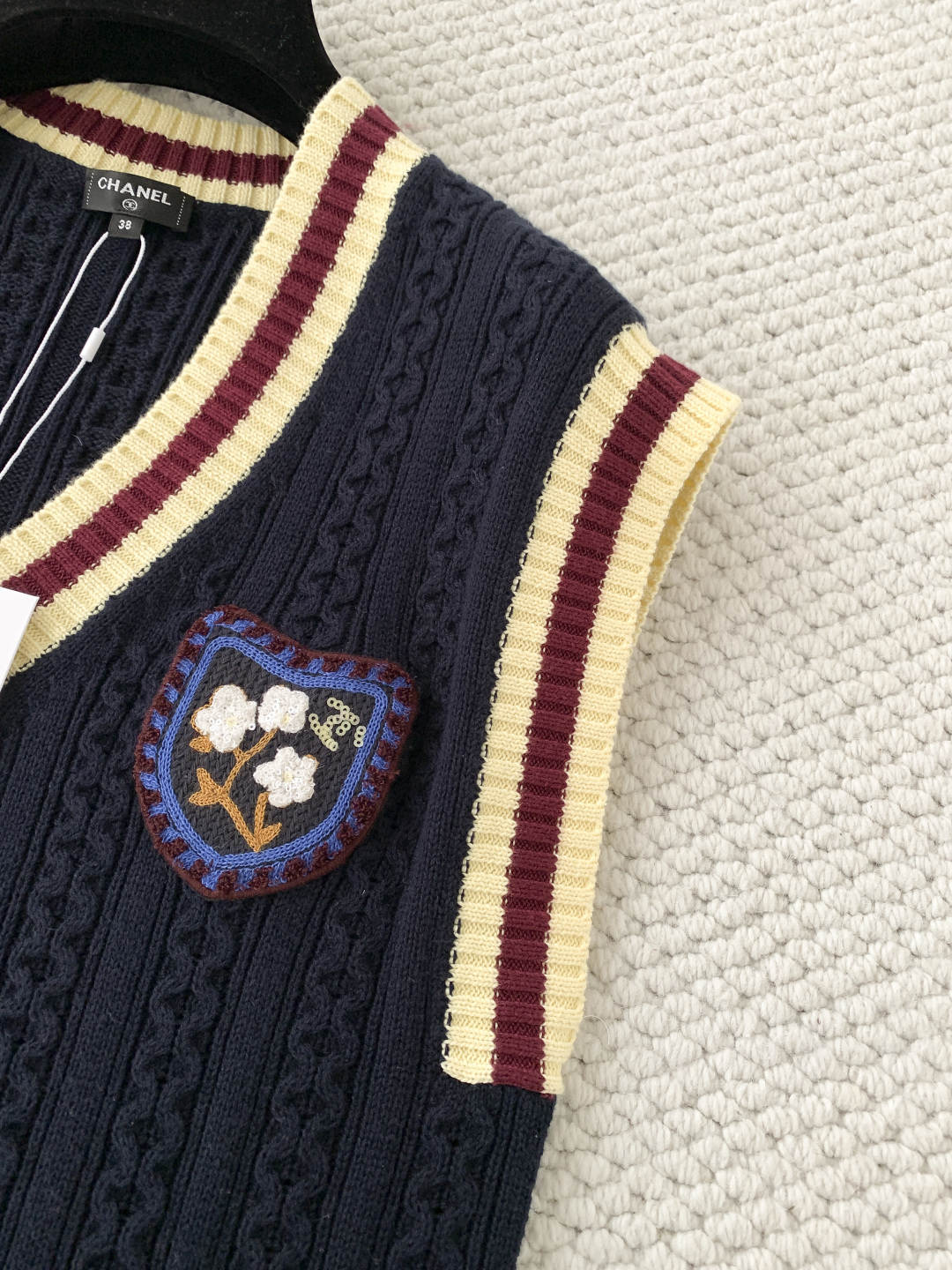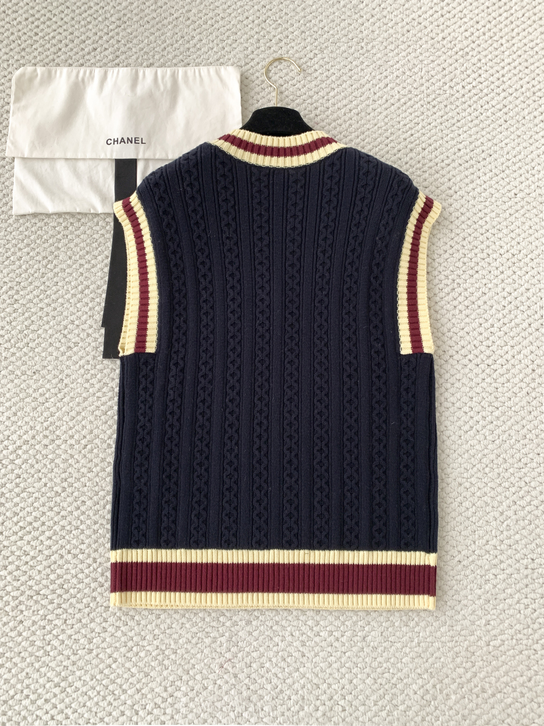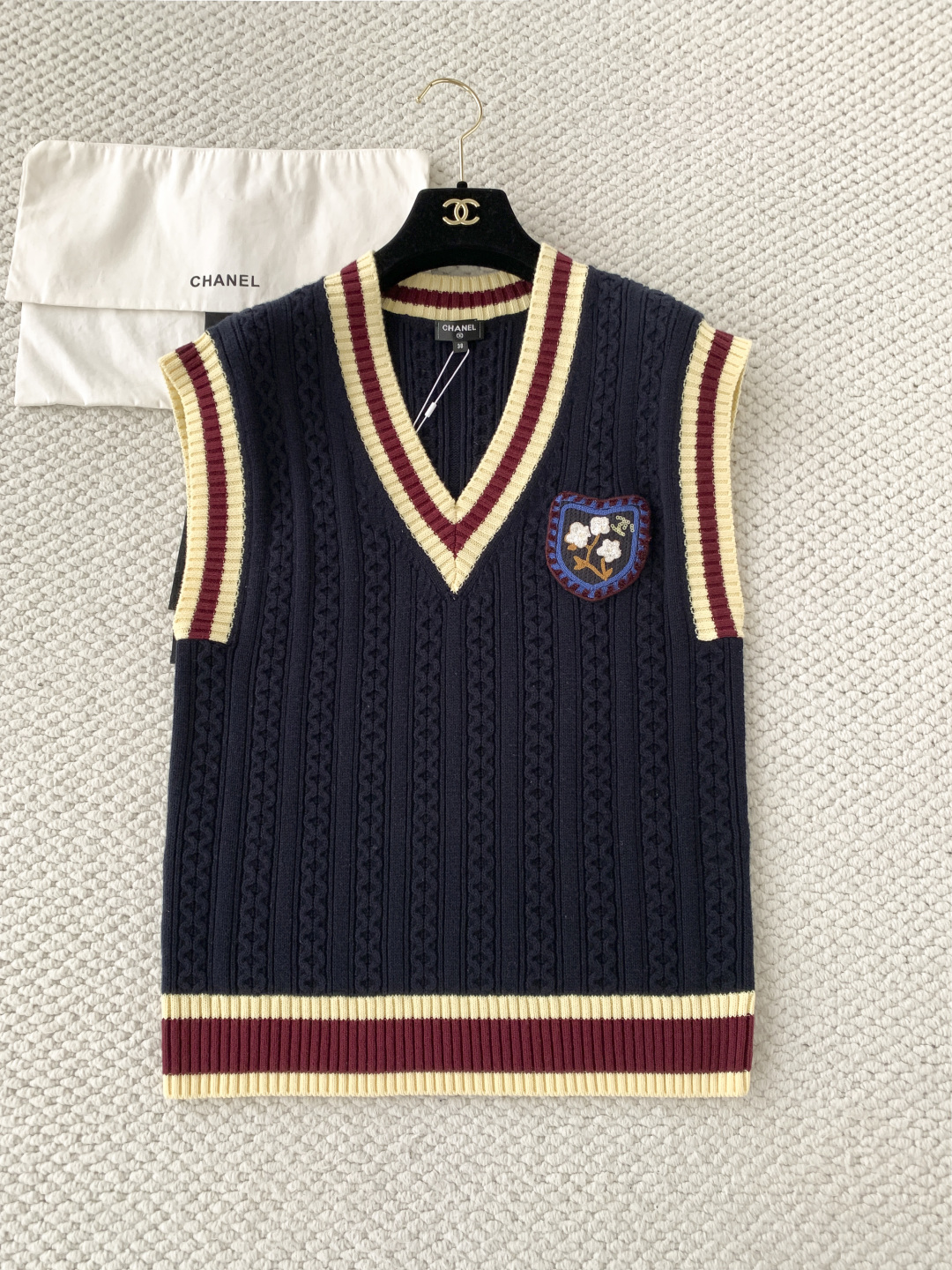 Details: College-style colliding color dark blue knitted vest with cloth bag.