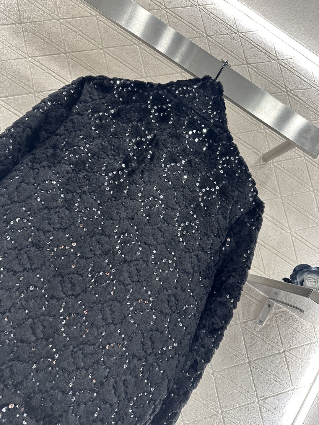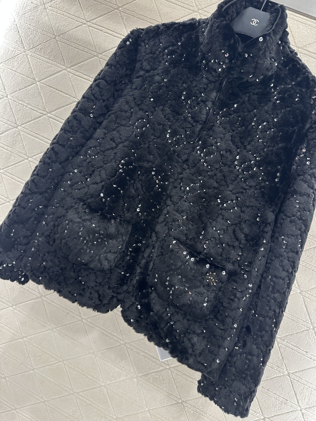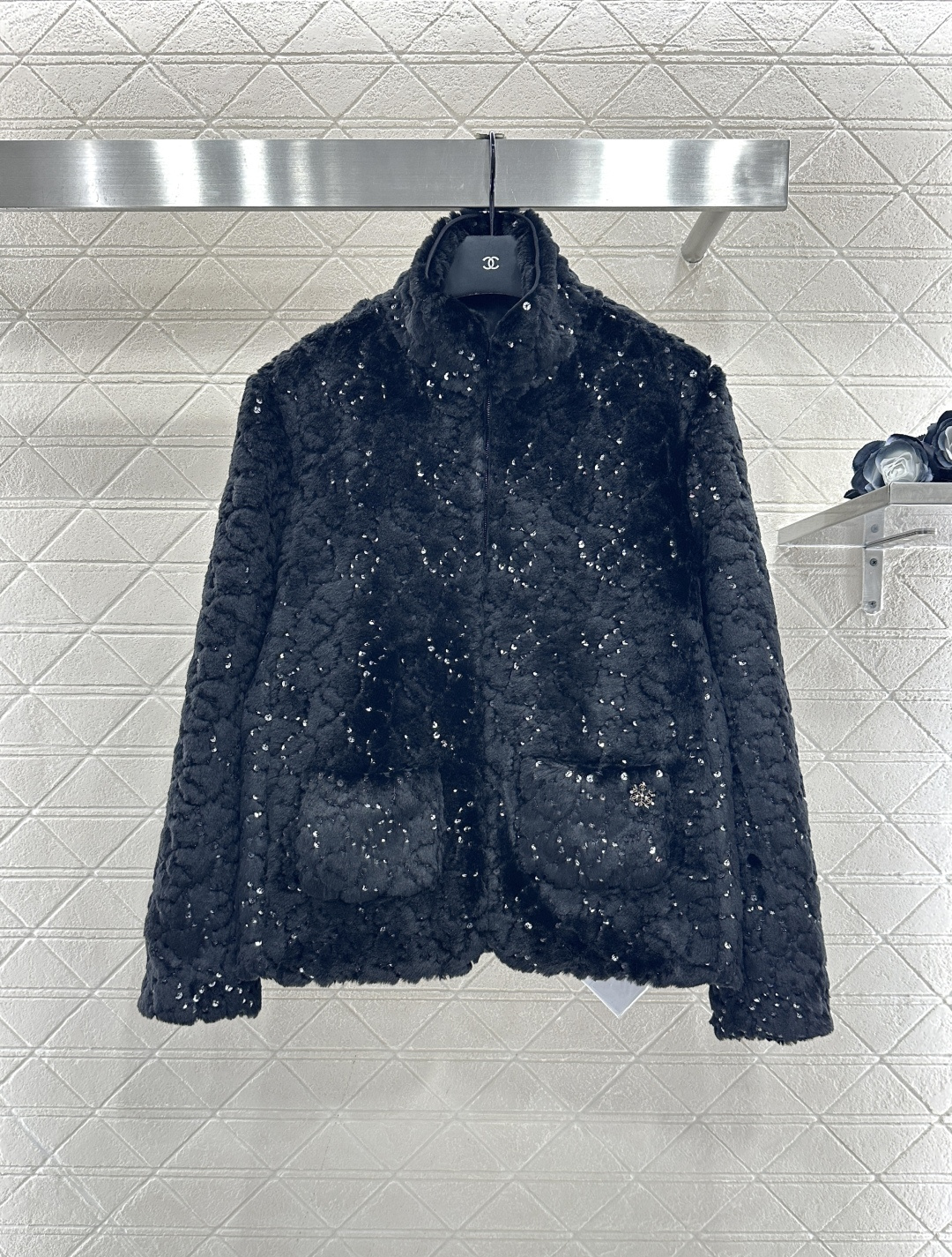 Details: Stand-collar Zipper Faux Fur Cotton Jacket, Lightweight and Warm, Luxury Design with Sequins and Rhinestones, High-end Customized, Exquisite Workmanship