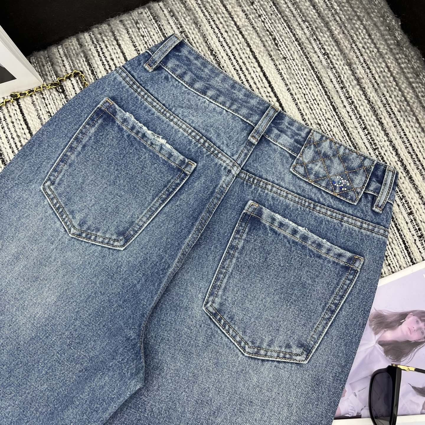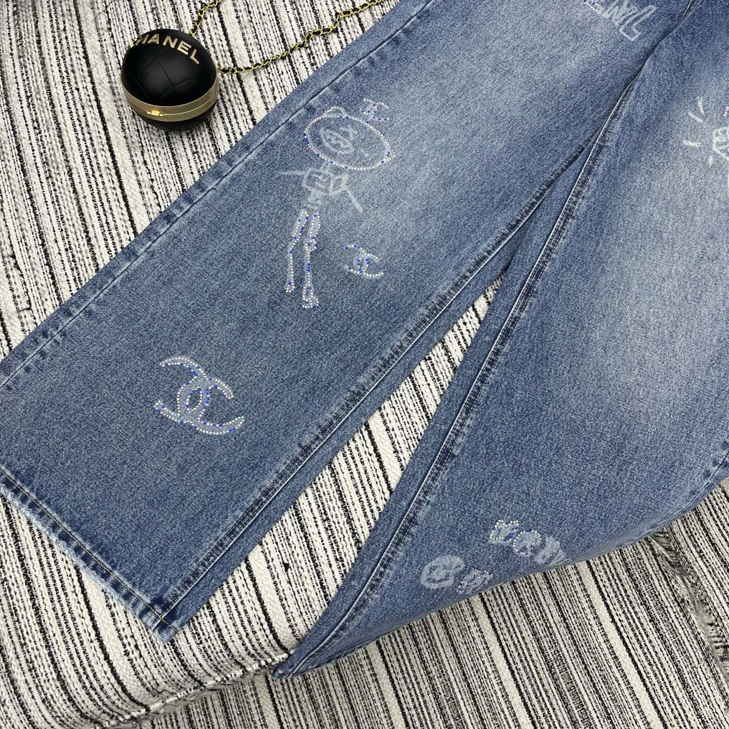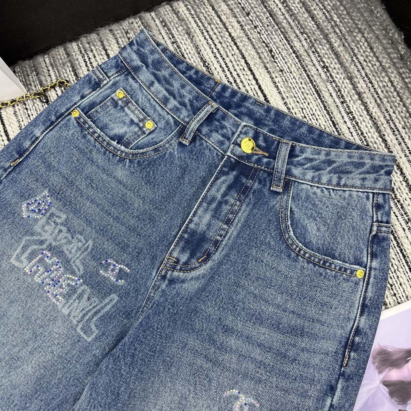 Details: Highly recommended early autumn straight - leg denim pants with double - C logo print and rhinestones, nice wash color. Custom - made, fine workmanship