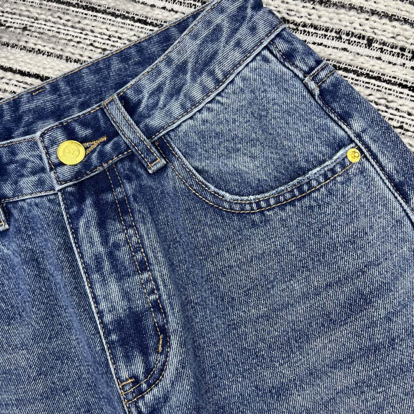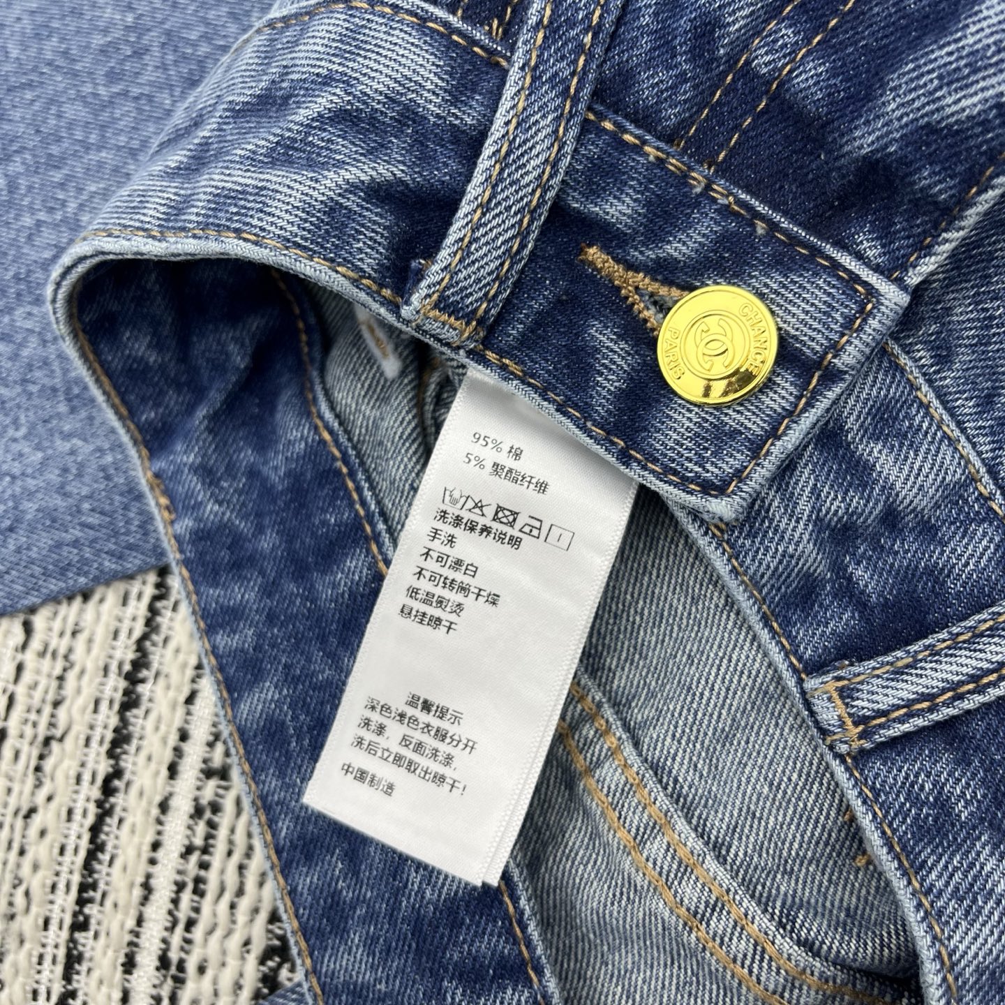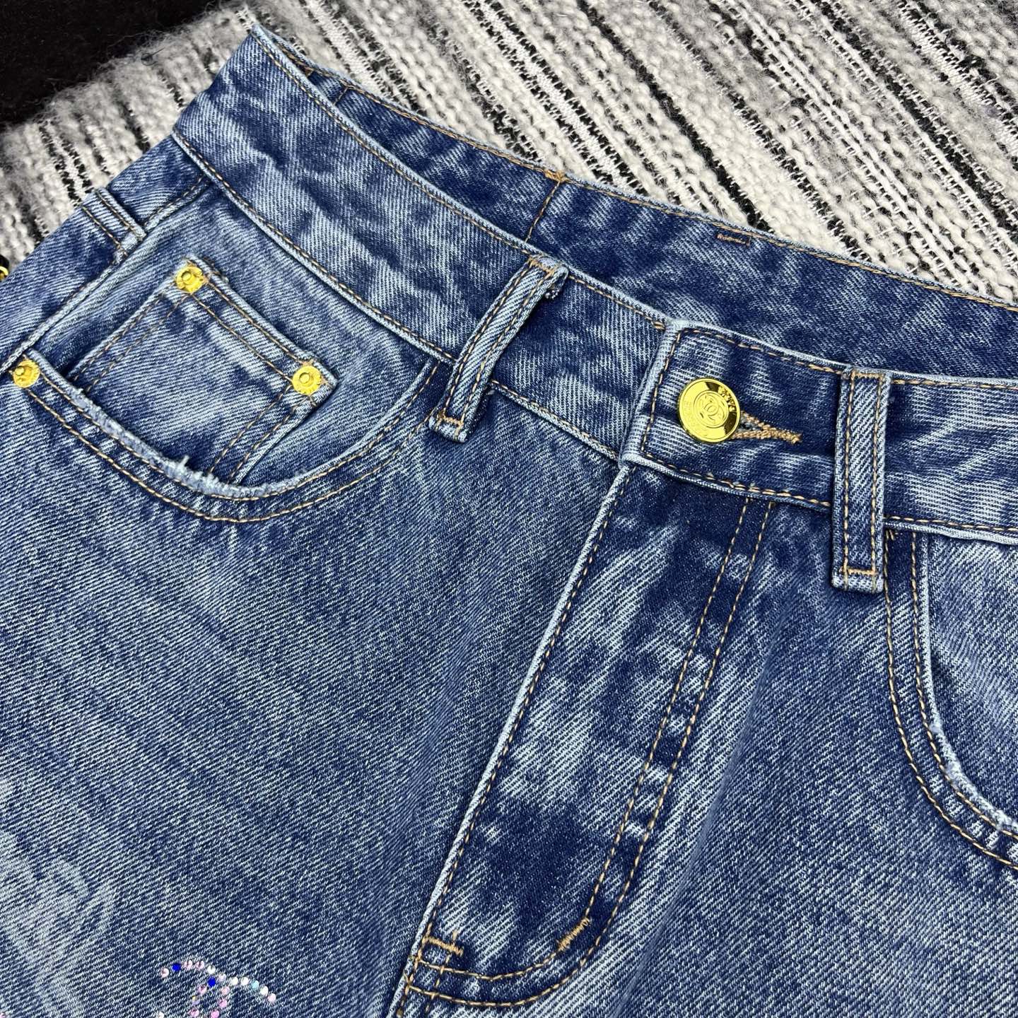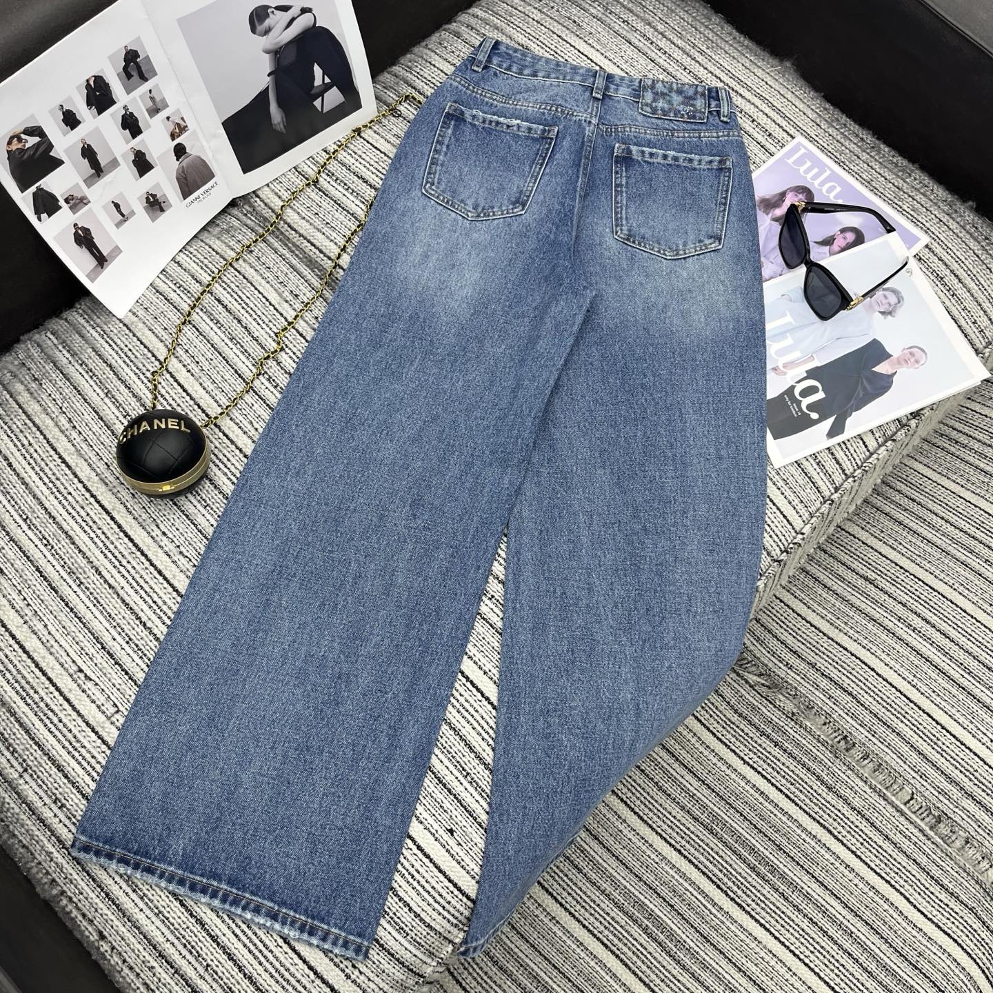 Details: Highly recommended early autumn straight - leg denim pants with double - C logo print and rhinestones, nice wash color. Custom - made, fine workmanship