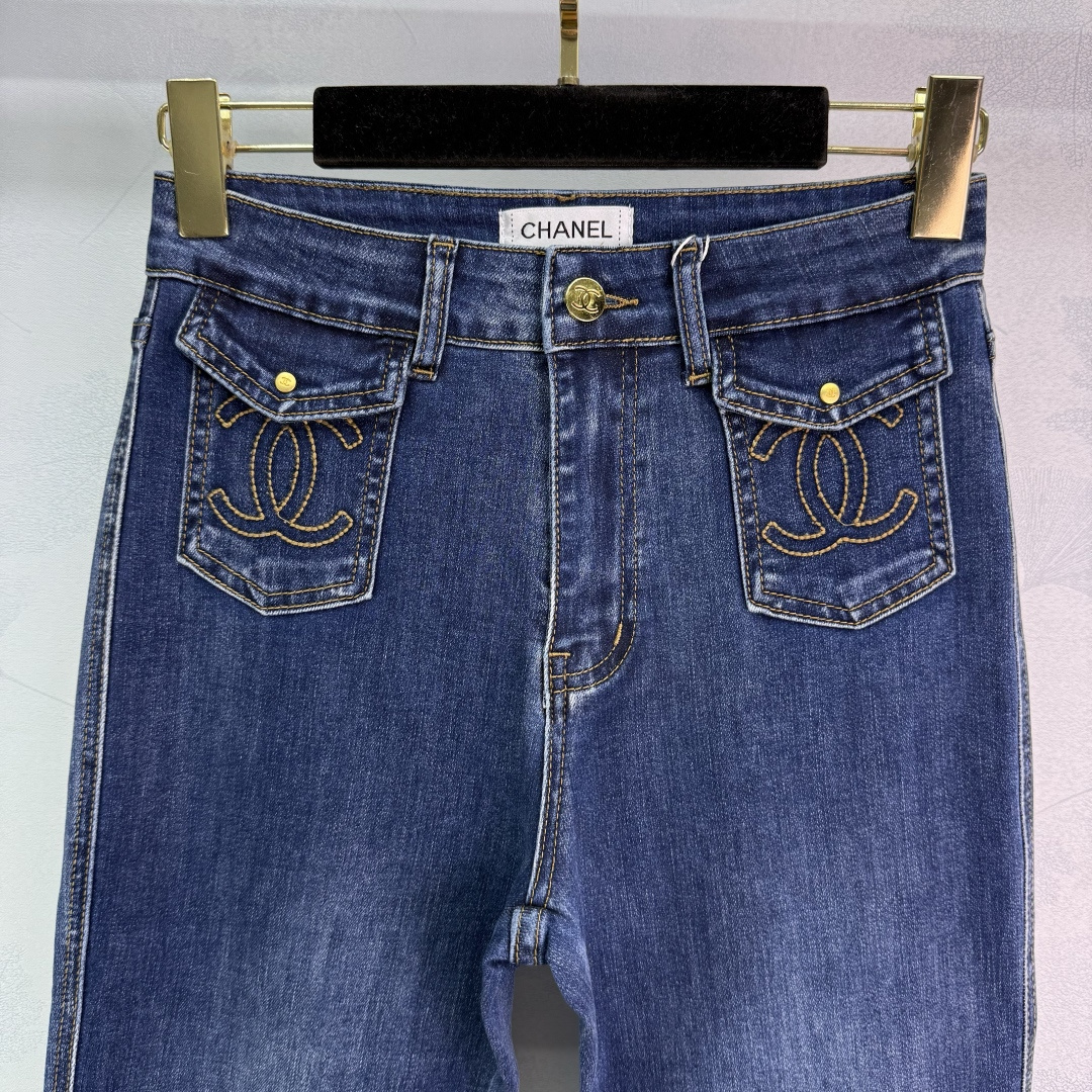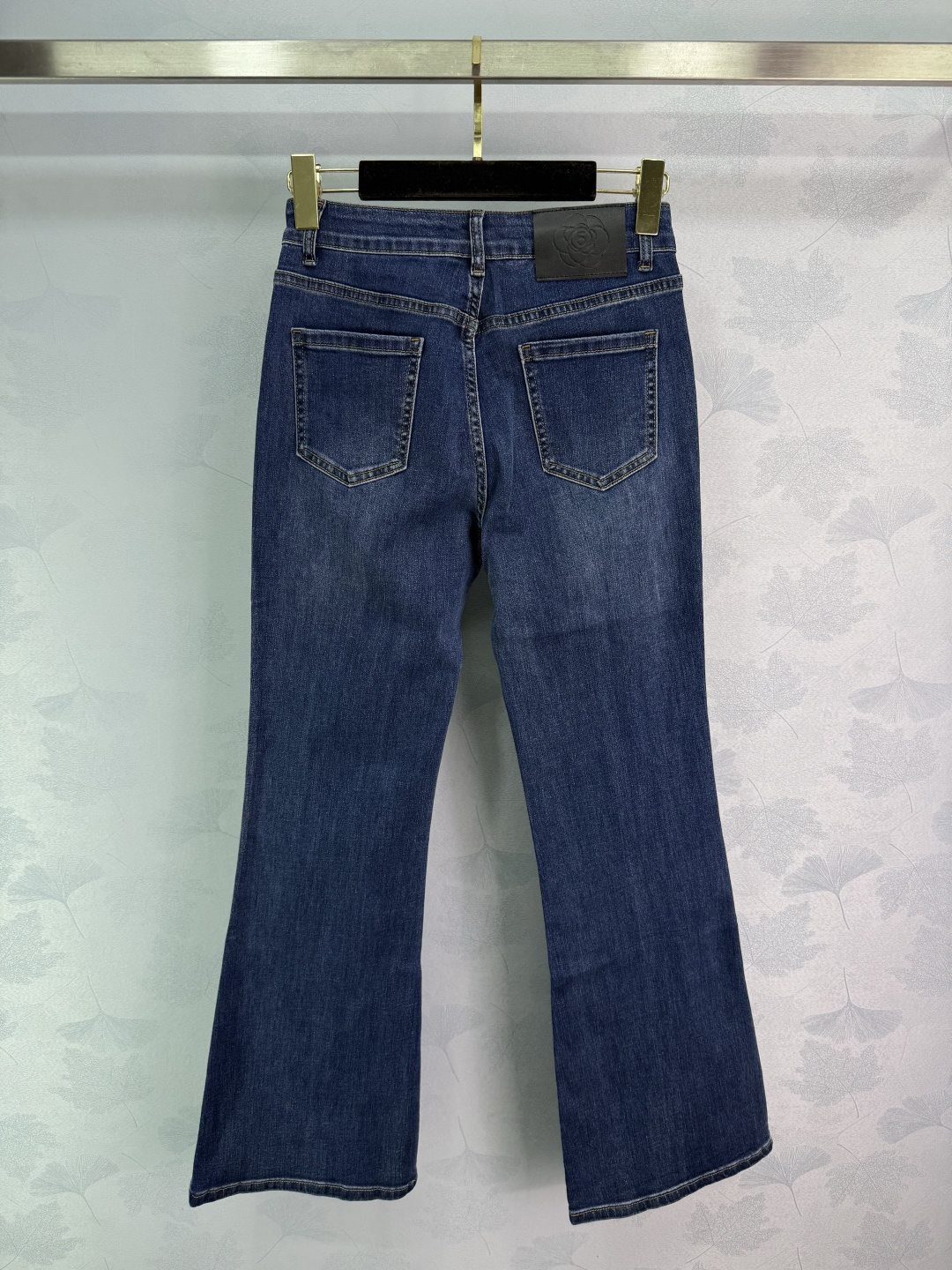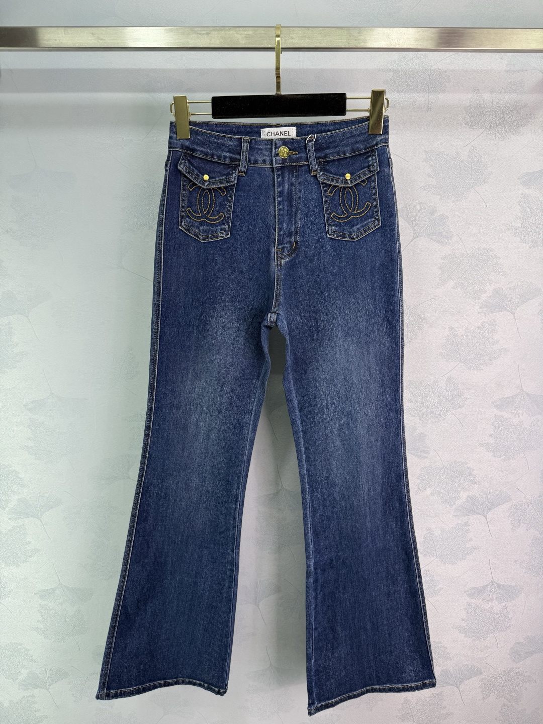 Details: early autumn denim flare pants with double C logo embroidery, high waist, slim fit, comfortable and stretchy.