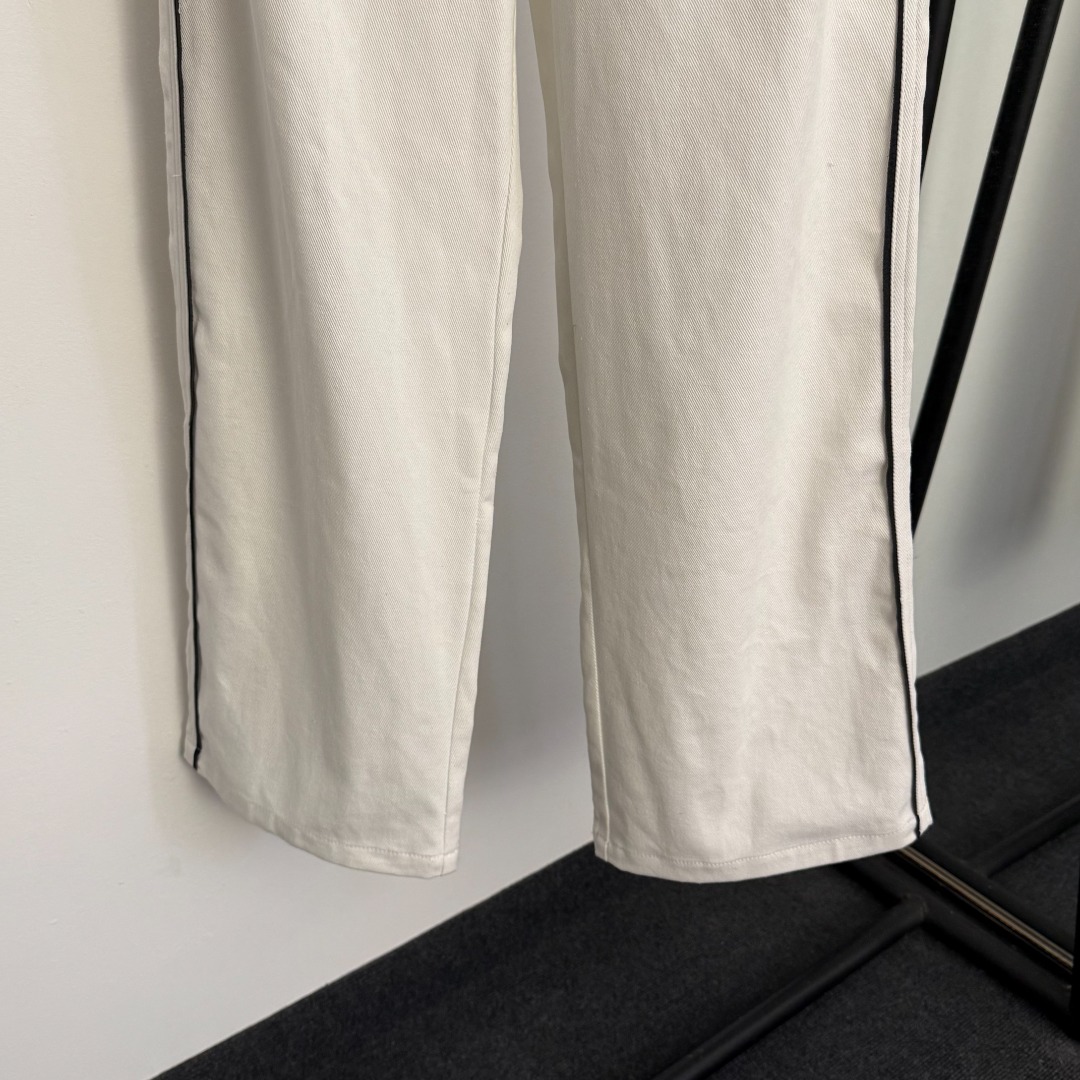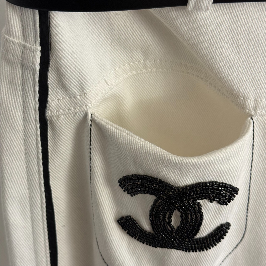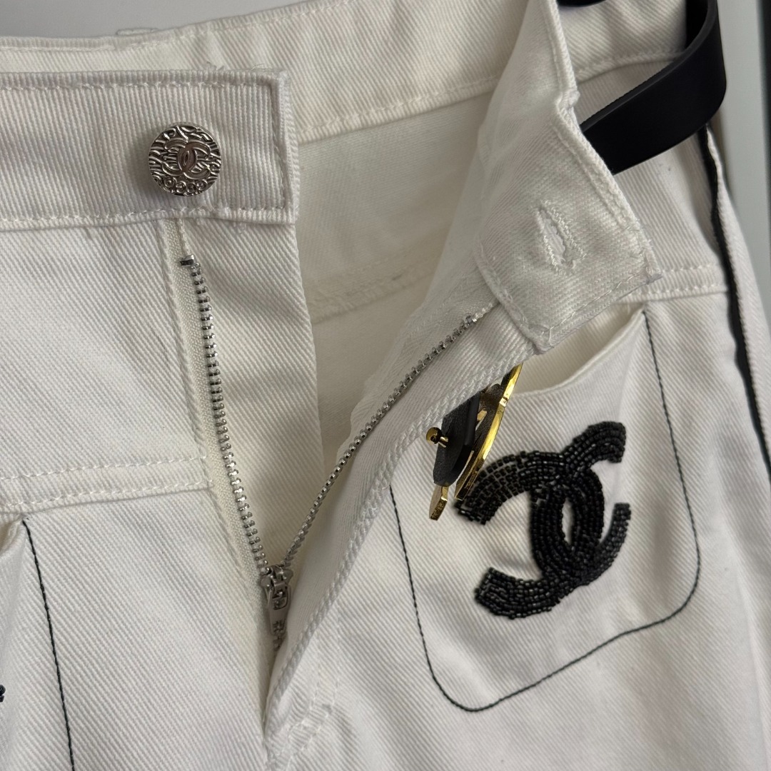 Details: New high-waisted white denim pants with studs and double pockets, available in S and M sizes. High-end customization with fine workmanship