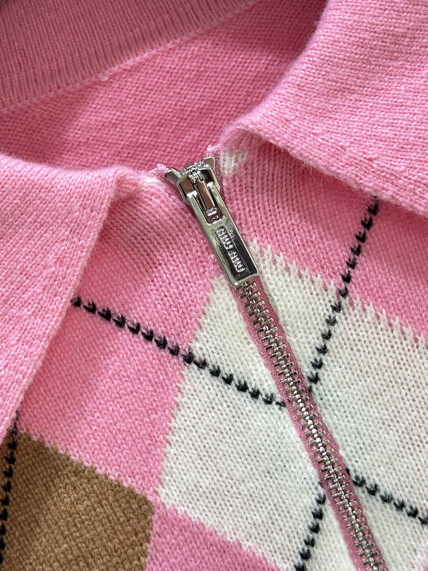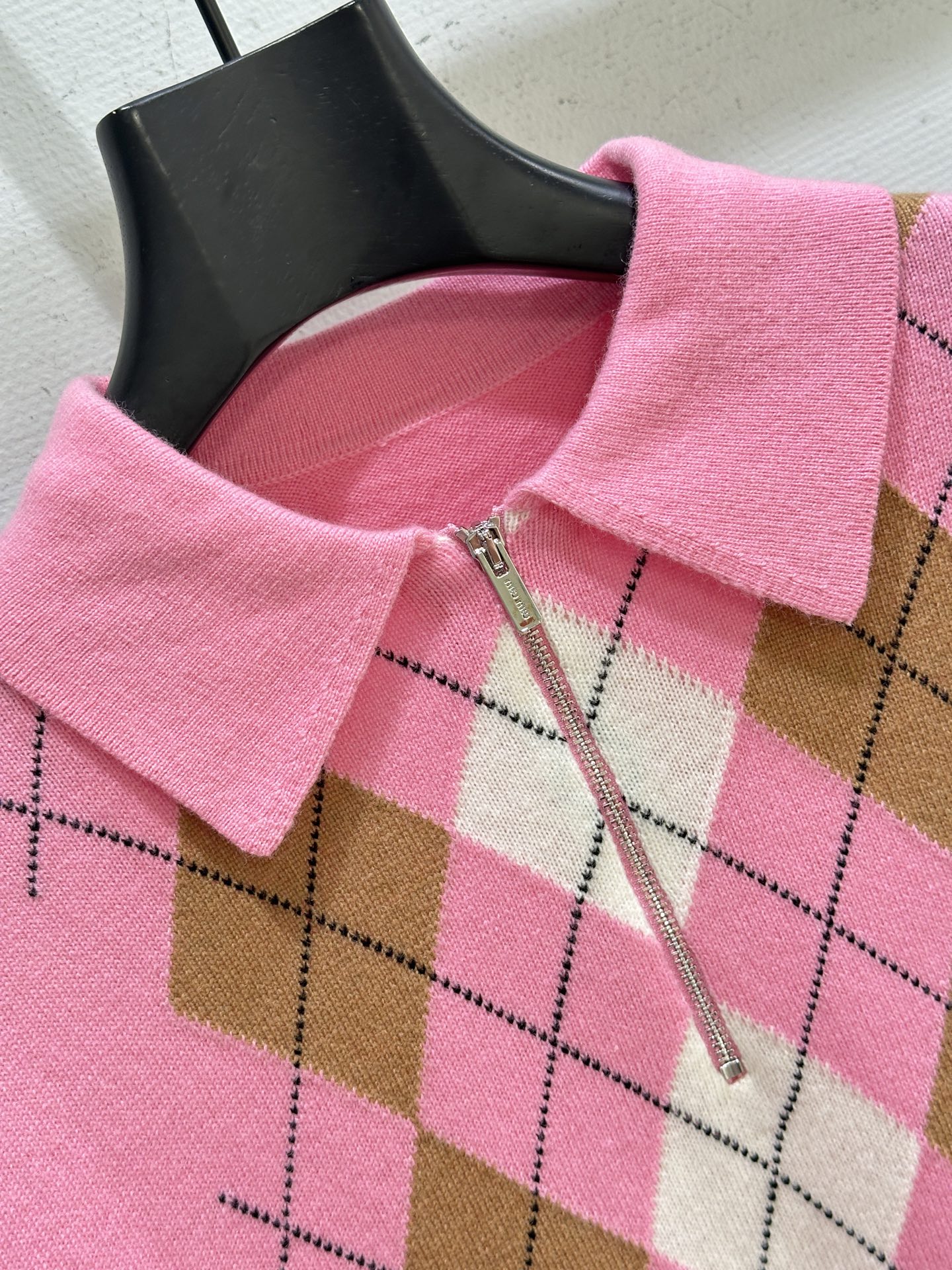 Details: new! Soft half-zip cashmere Polo sweater with diamond pattern, in pink.