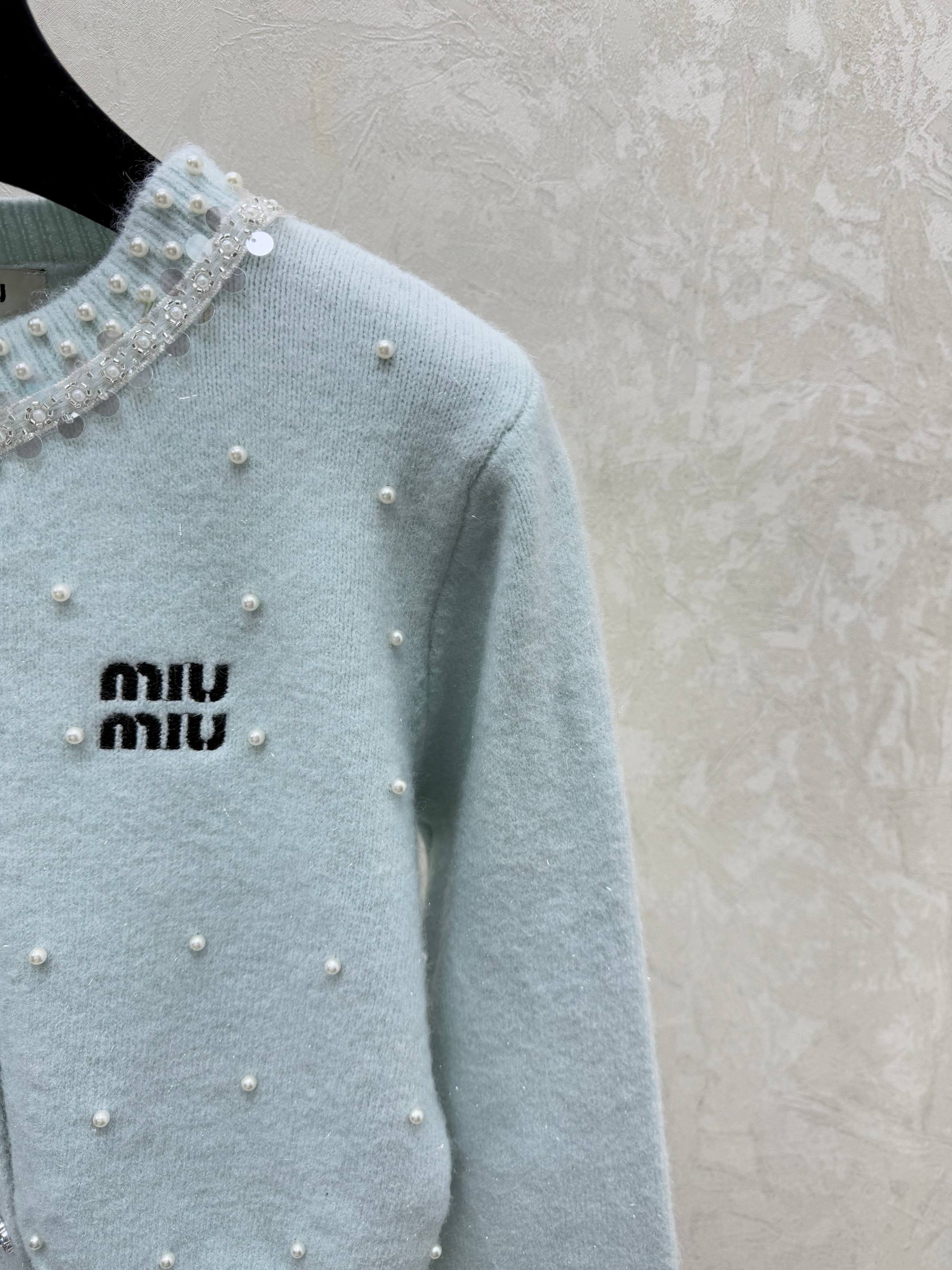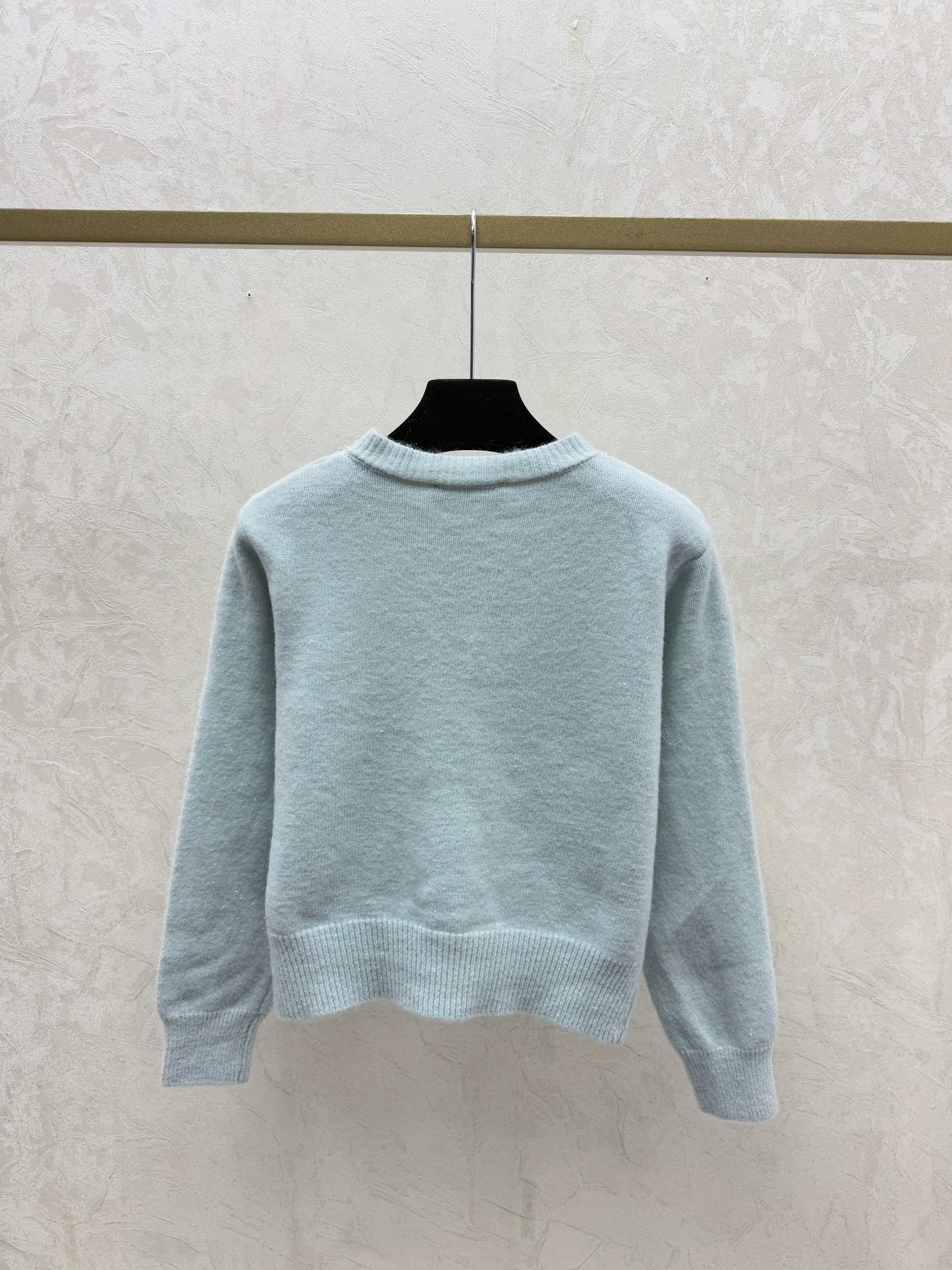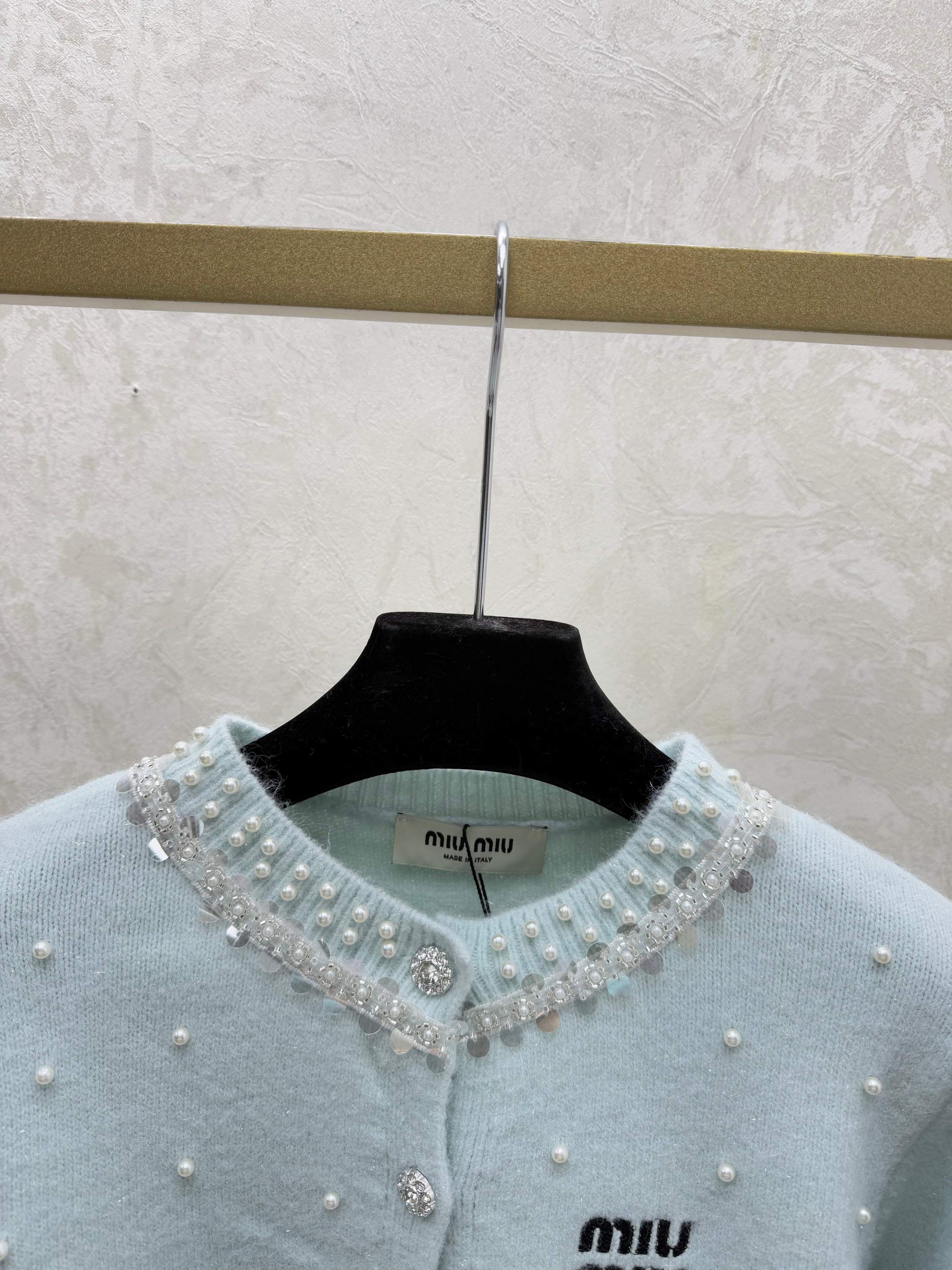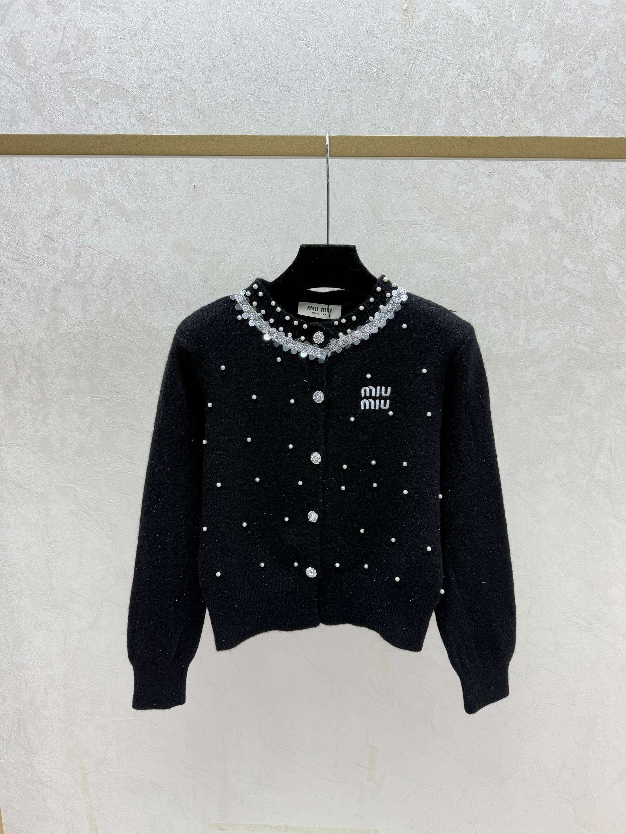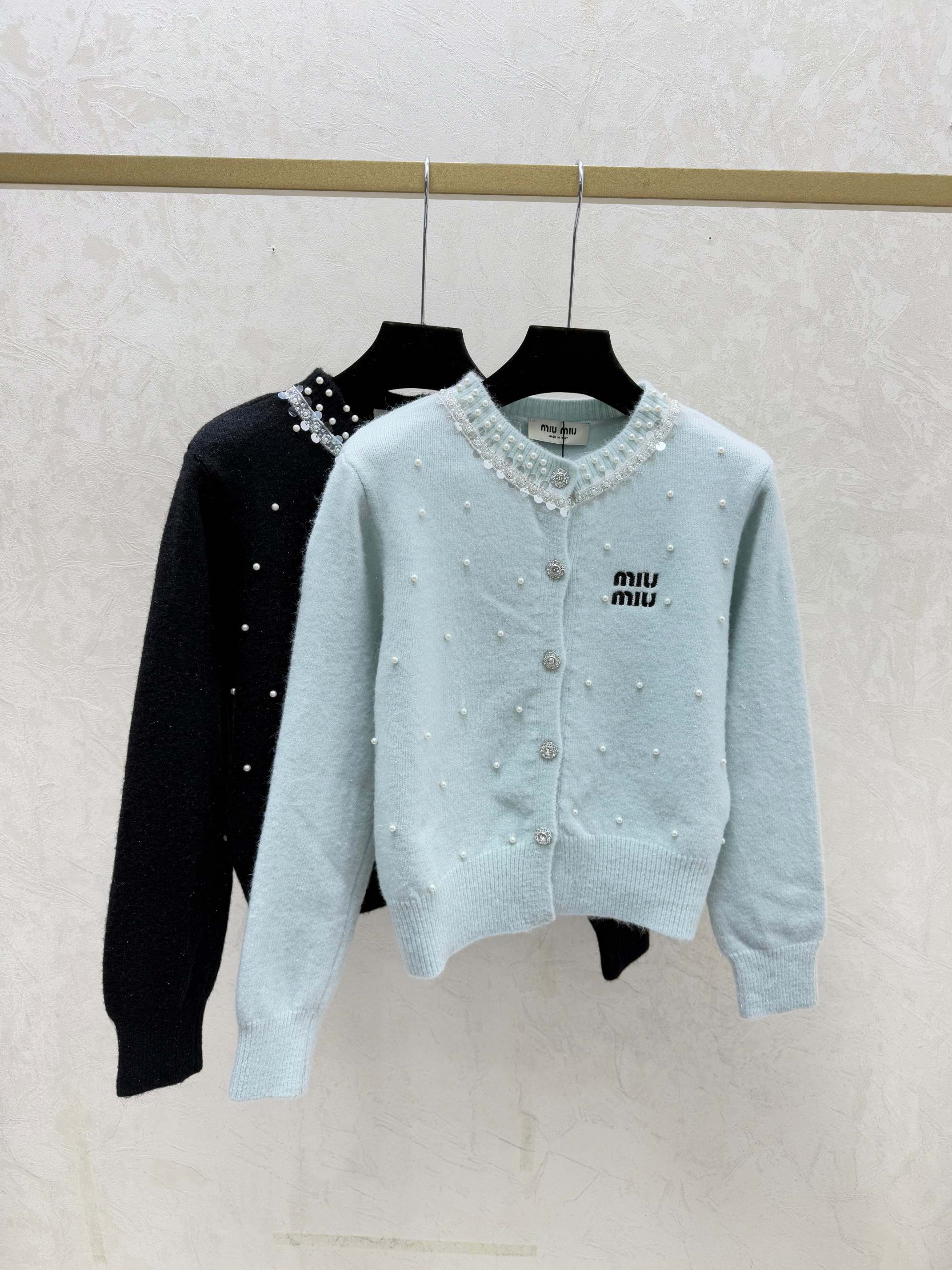 Details: Early autumn solid-color heavy bead-embellished round-neck knitted long-sleeved cardigan in blue and black. Sizes 36 to 40. Premium custom, fine workmanship