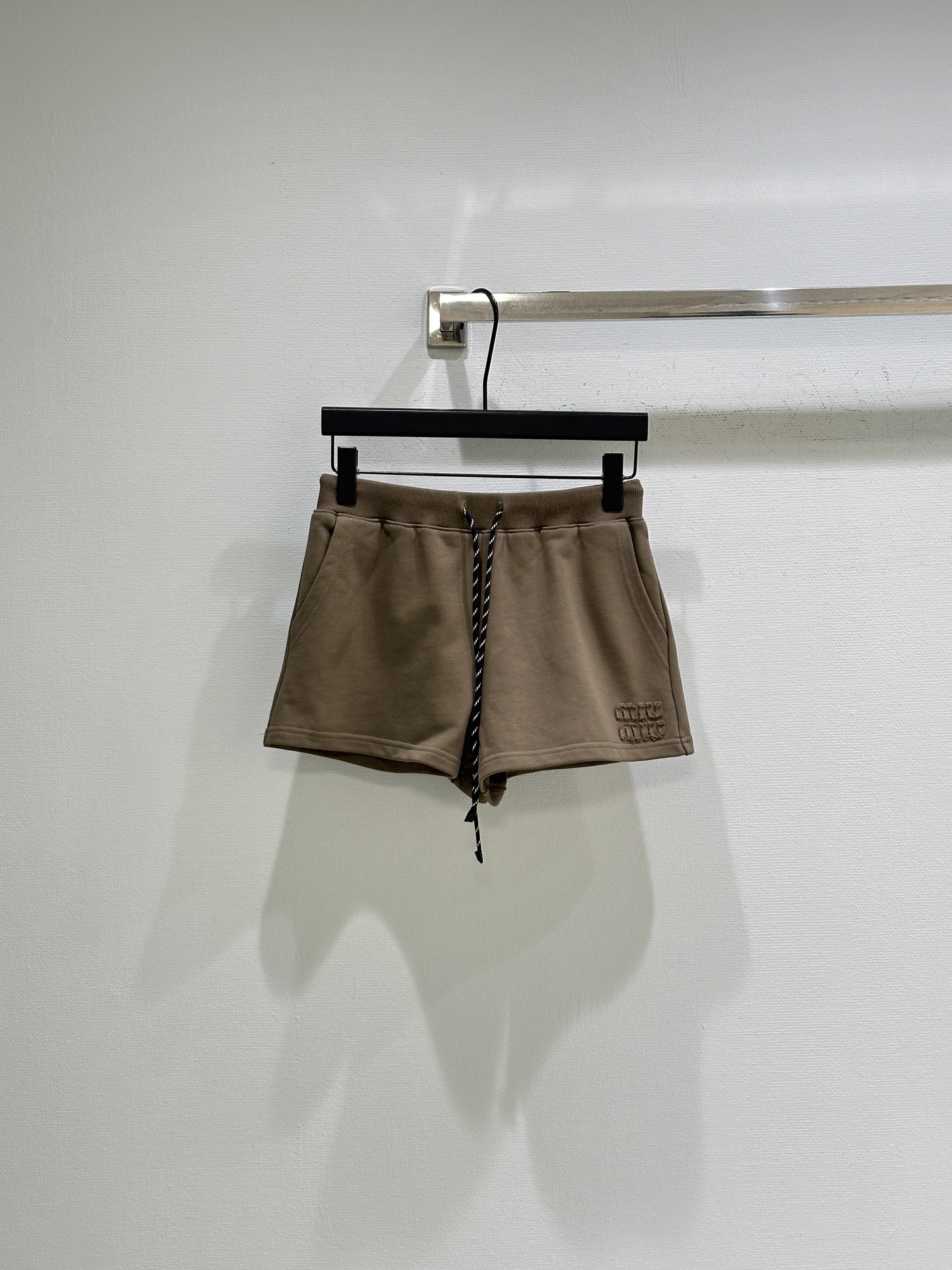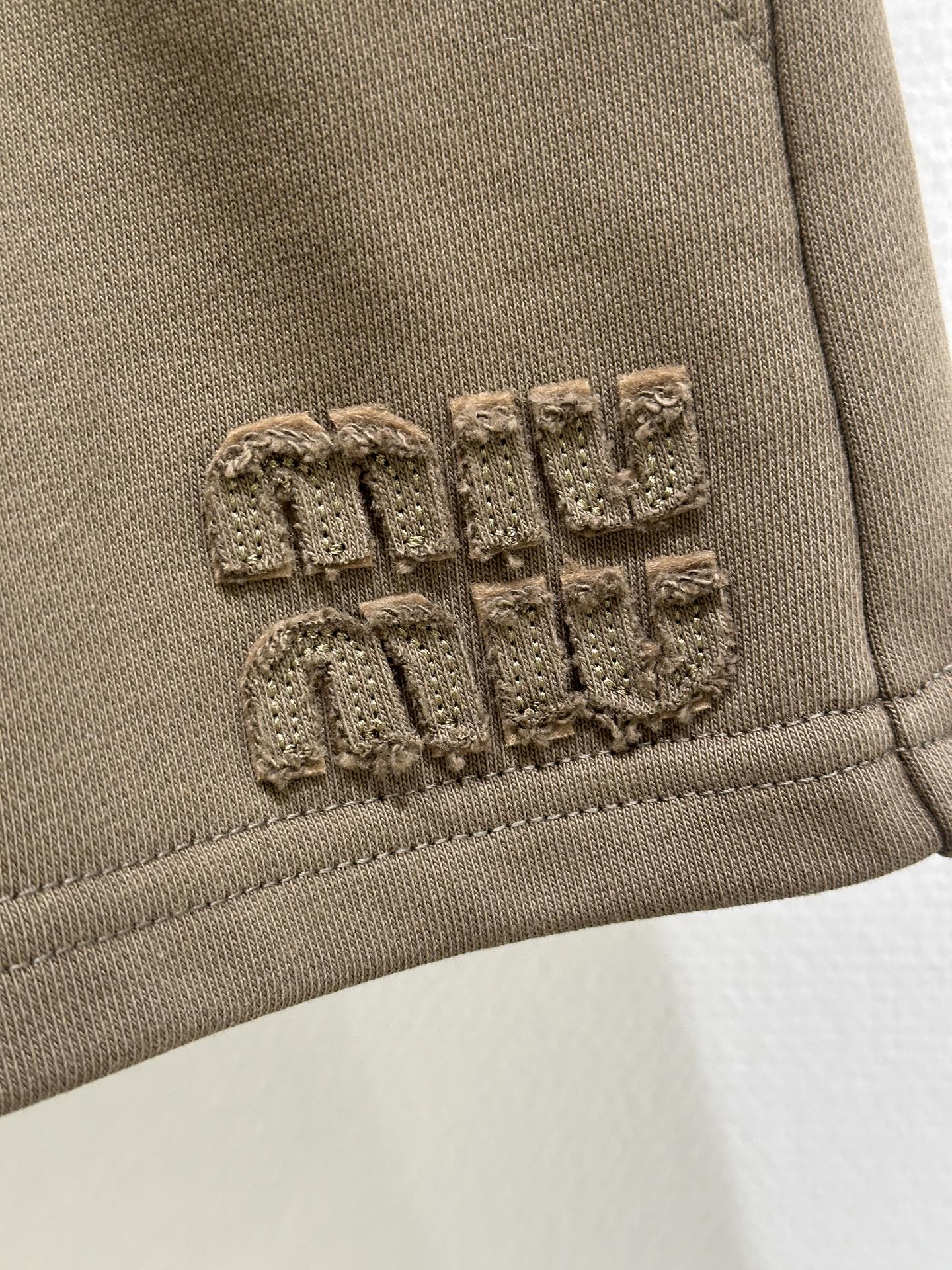 Details: Spring casual tracksuit shorts, crafted from pure cotton, in classic miu style, with simple drawstring design, embroidered logo, high - end customization, and fine craftsmanship of 1:1 original quality.