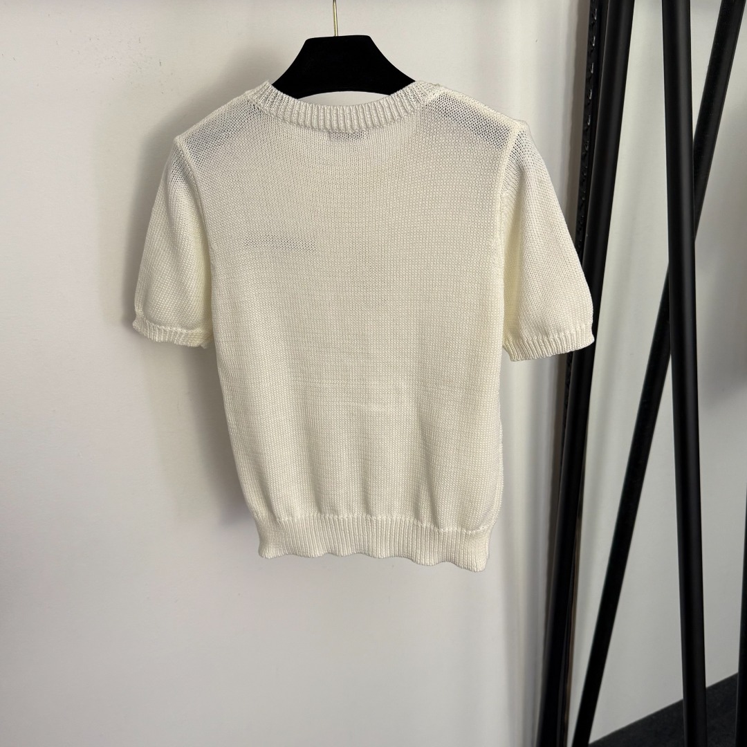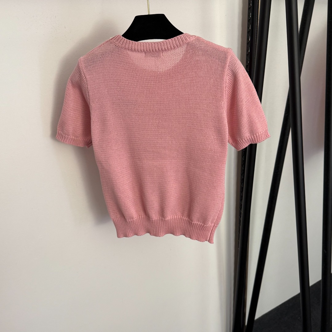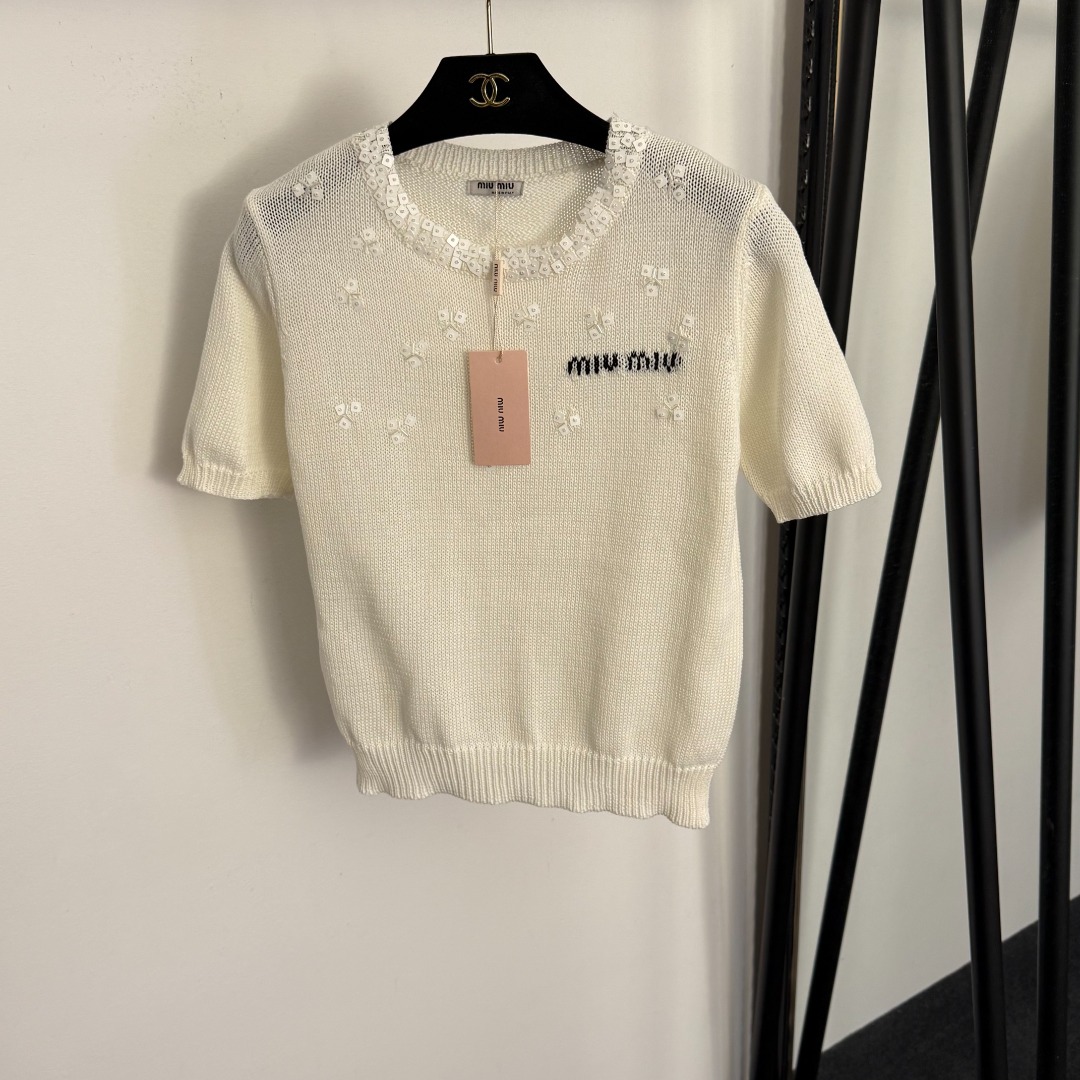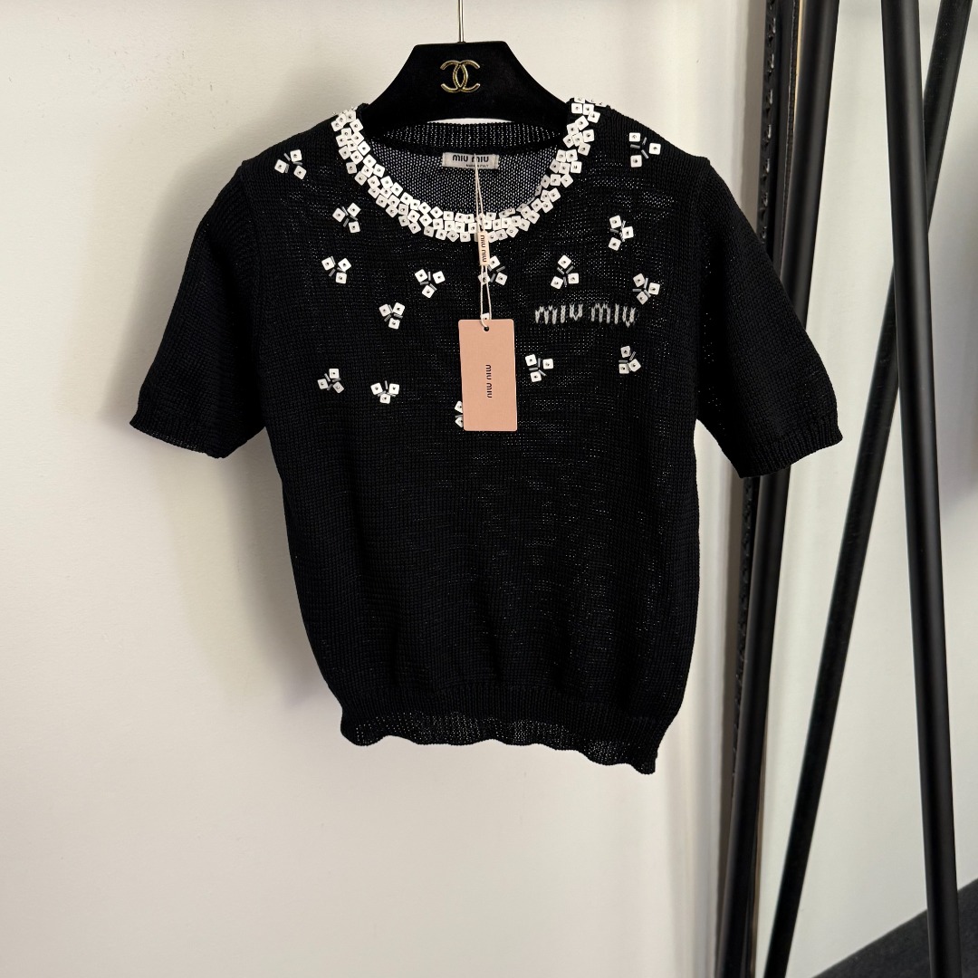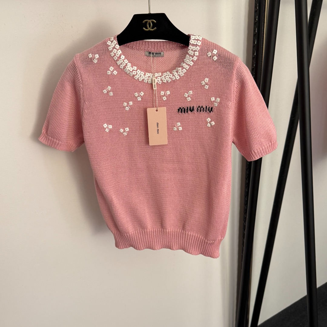 Details: New sequined and beaded round collar short-sleeved knitted top in beige, pink, black, one size.