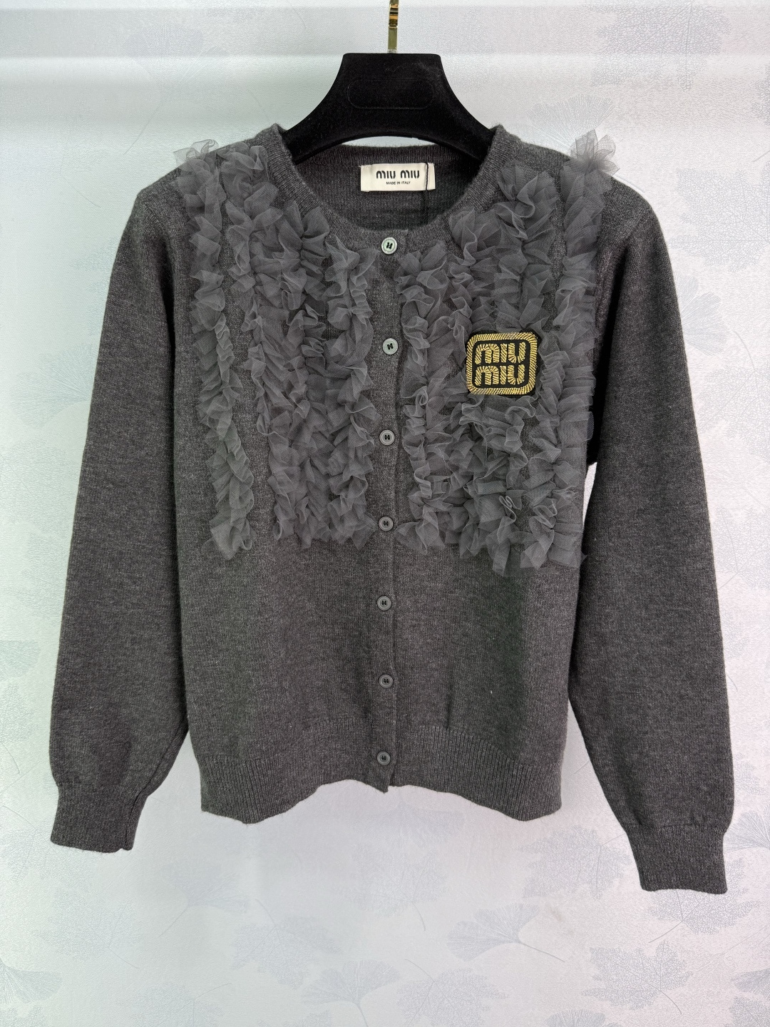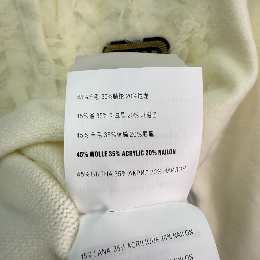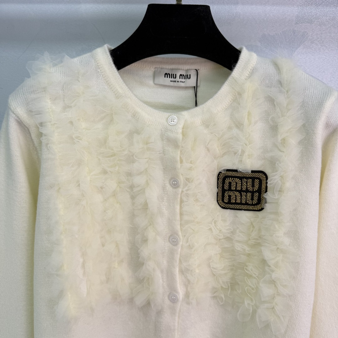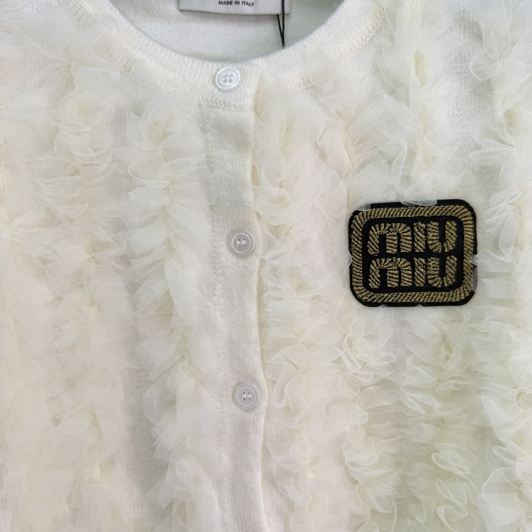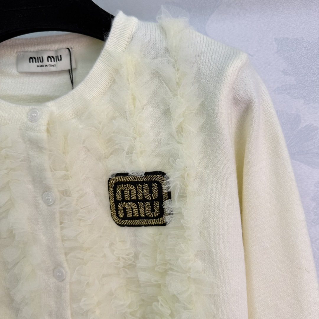 Details: Early Autumn Round-Neck Knit Cardigan, Delicate Lace with Golden Logo Embroidery, Classic and Elegant Design