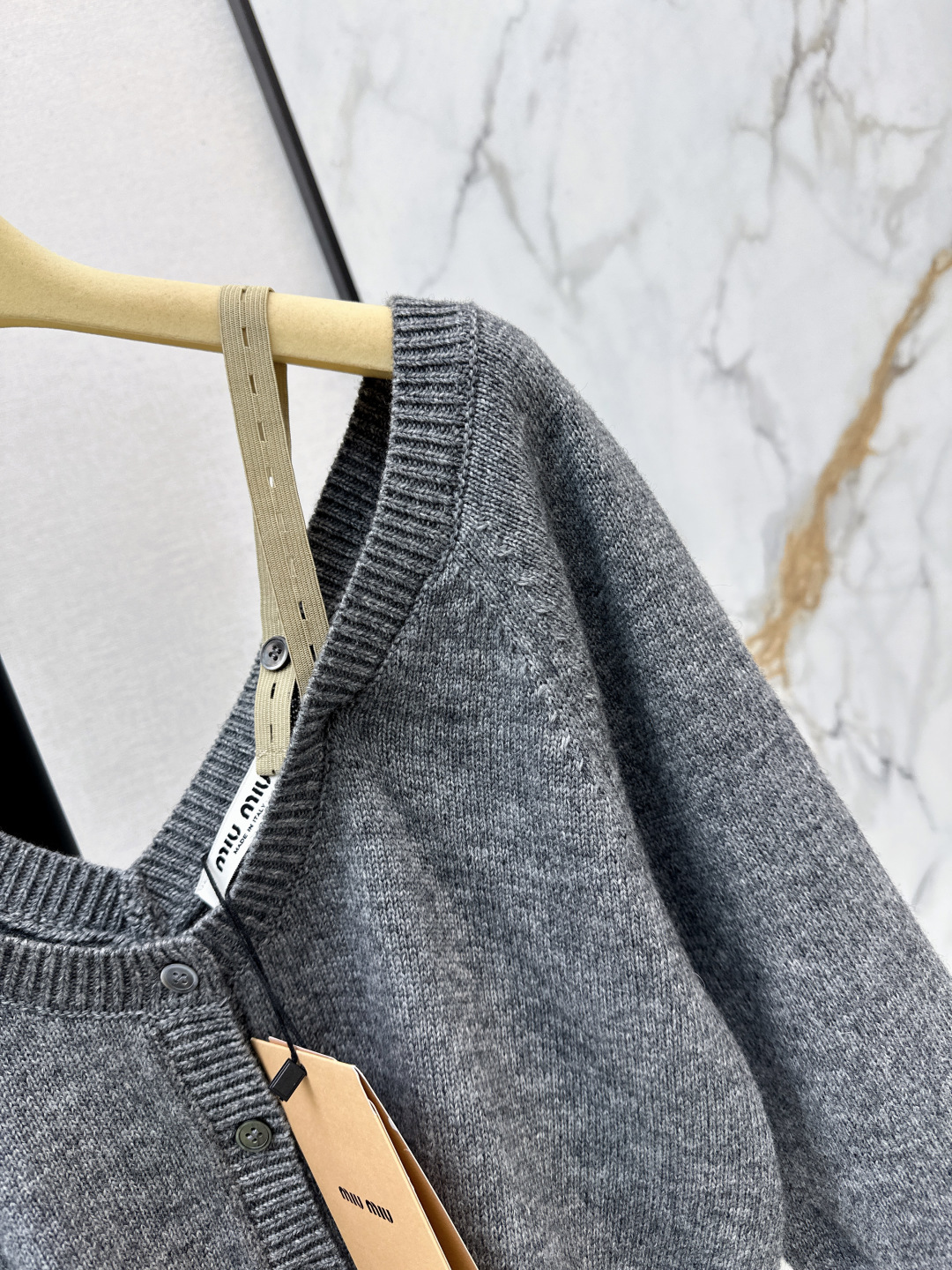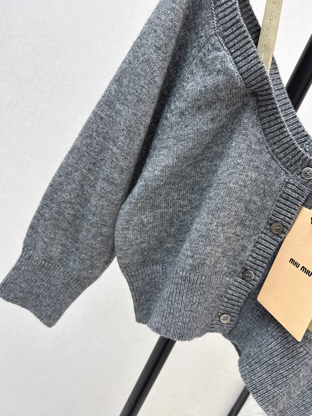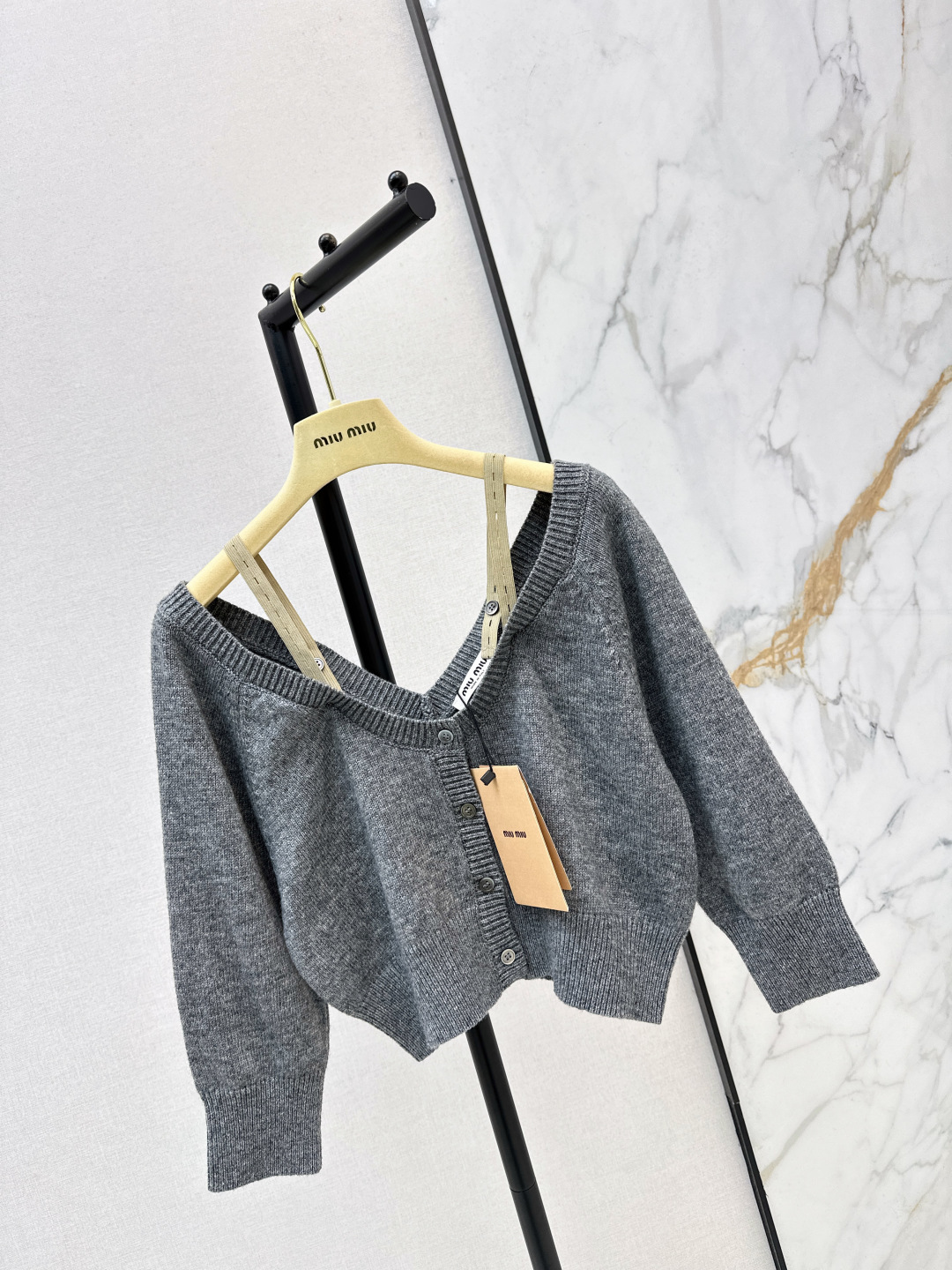 Details: Spring-summer grey knitted off-shoulder cardigan, short and slim-fitting, versatile for layering, custom-made, fine craftsmanship