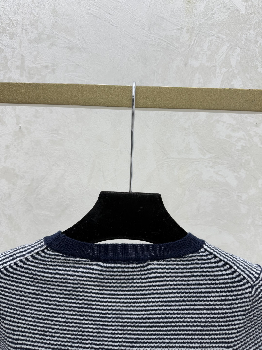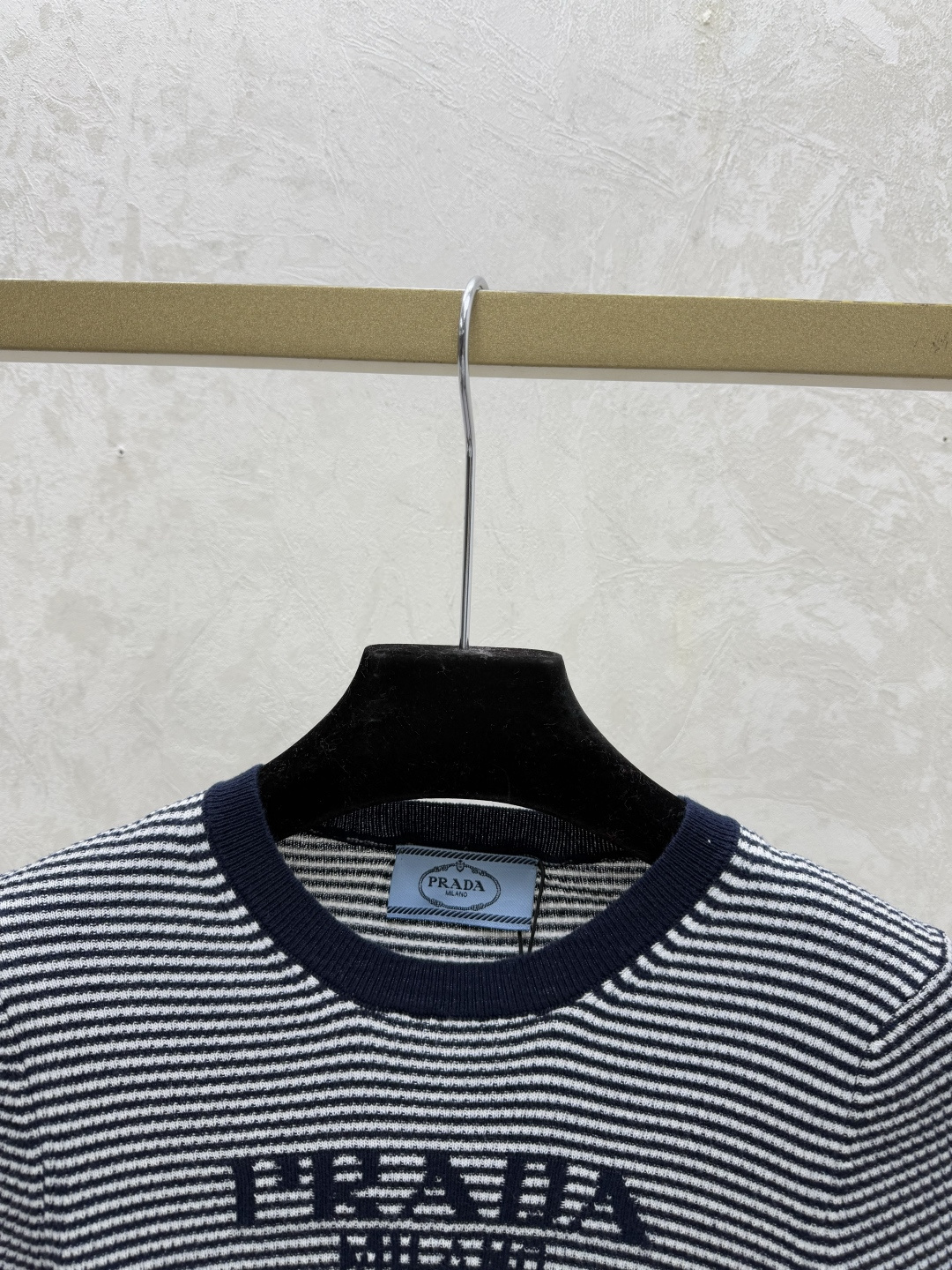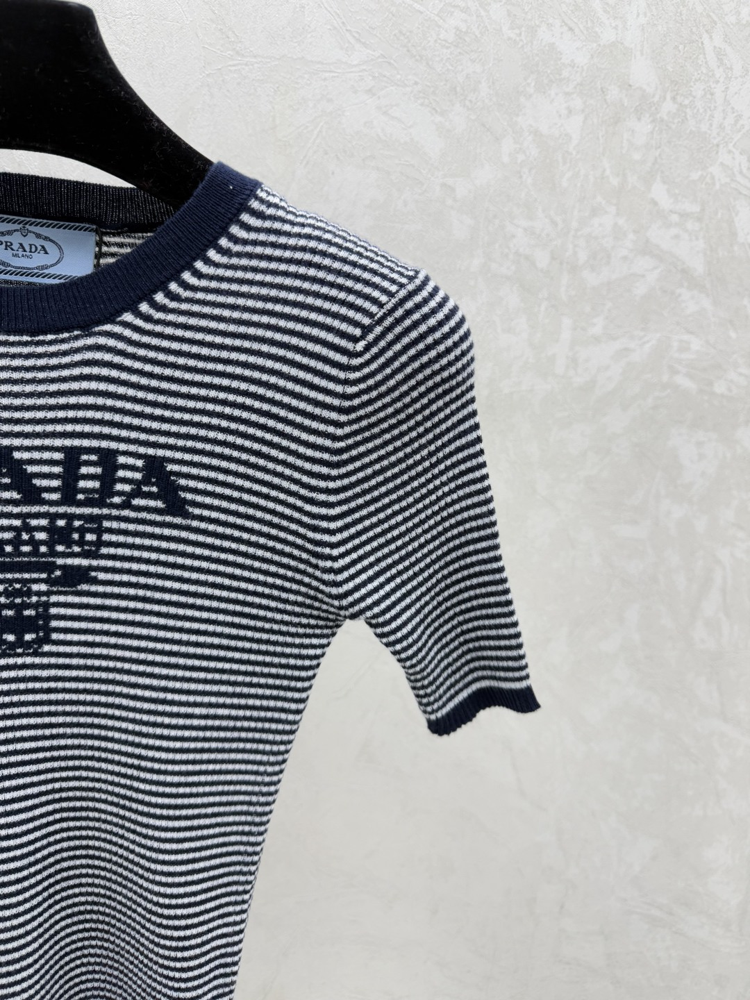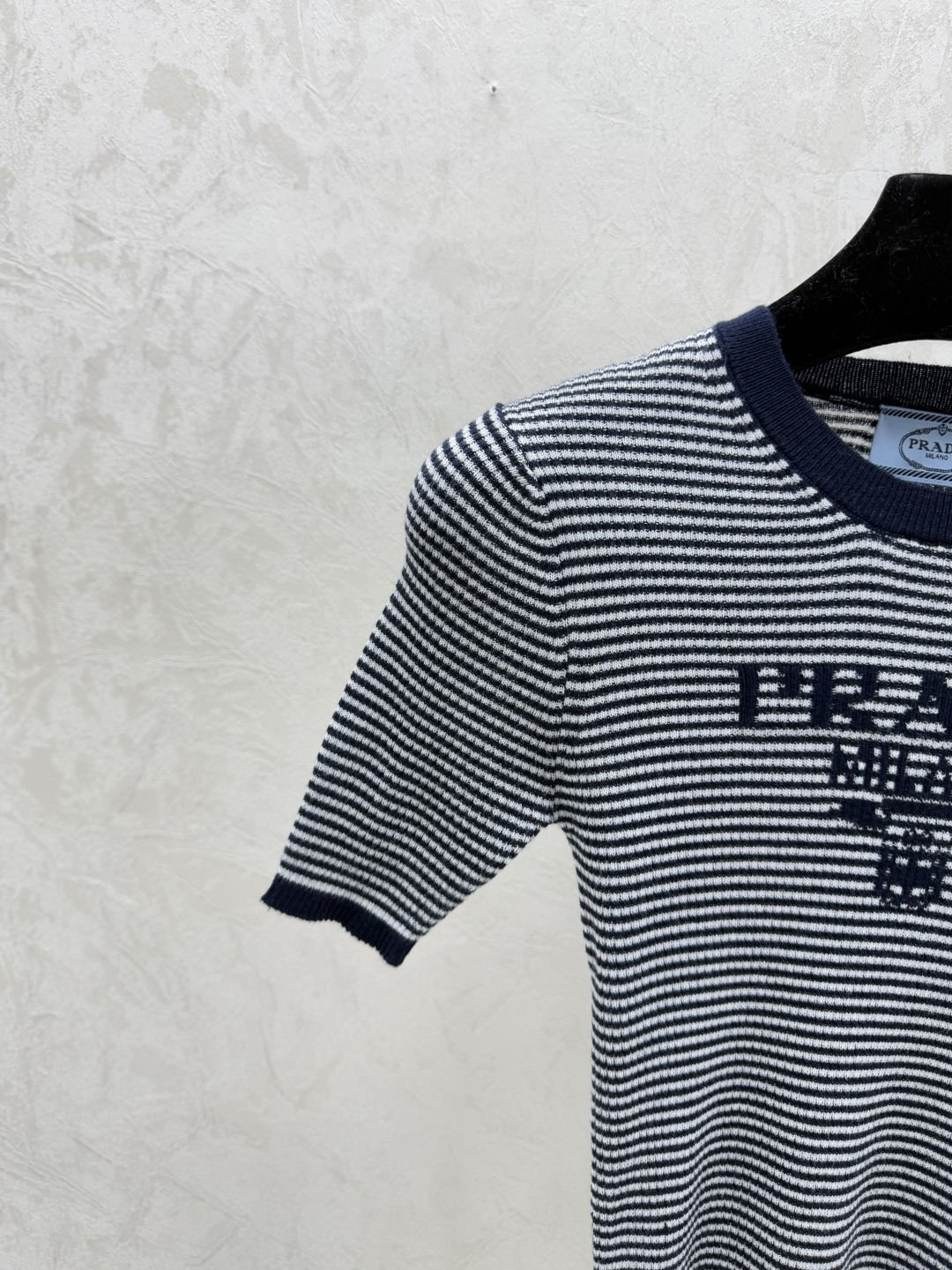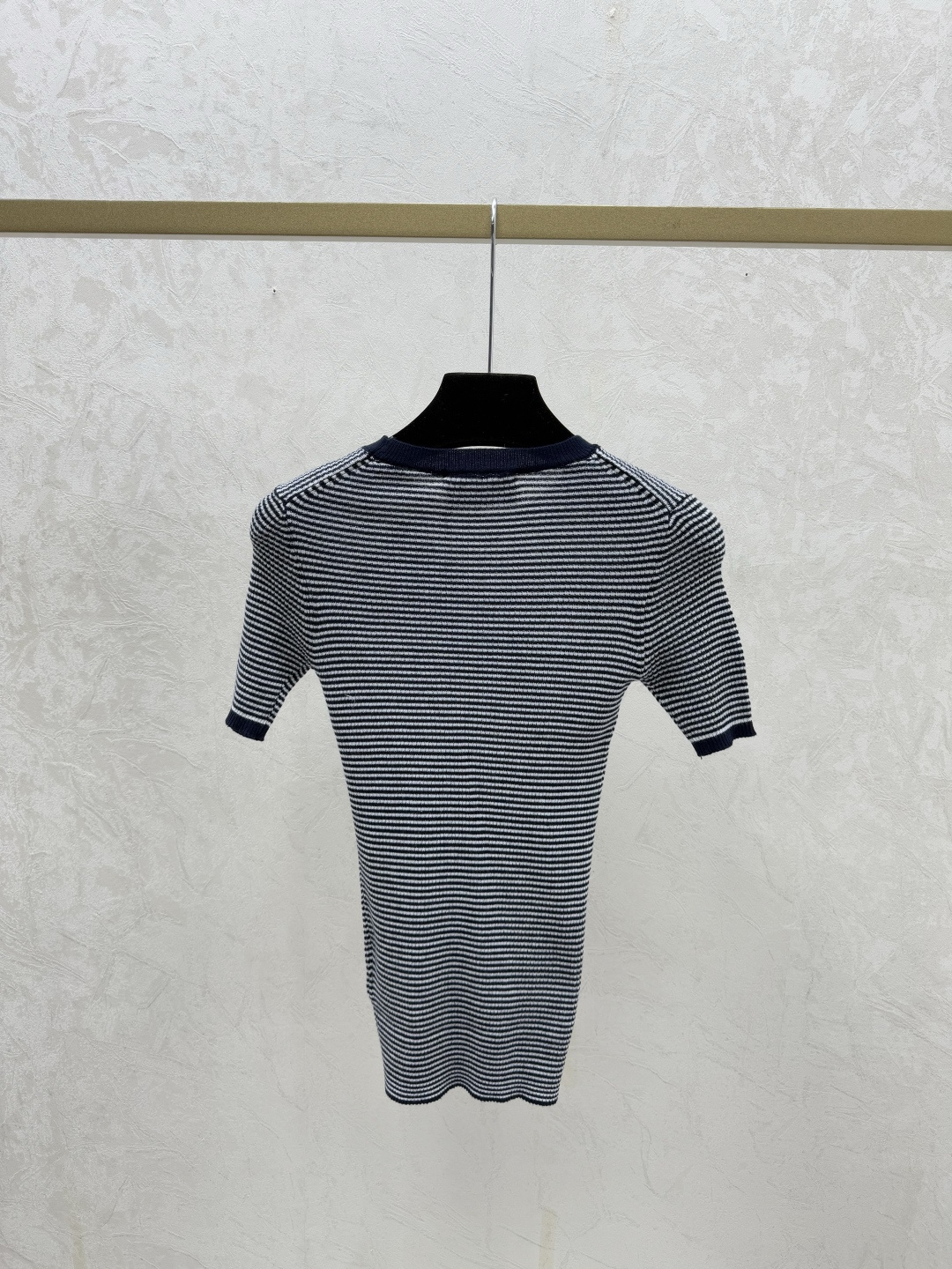 Details: Early spring new style, color-blocked striped letter round-neck knitted short-sleeved shirt in sapphire blue, available in sizes 36, 38, 40.