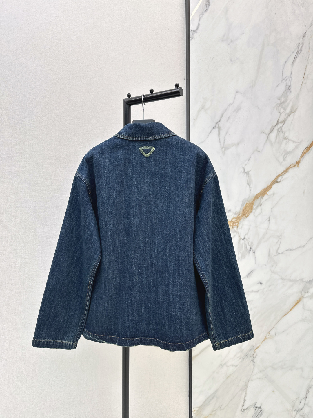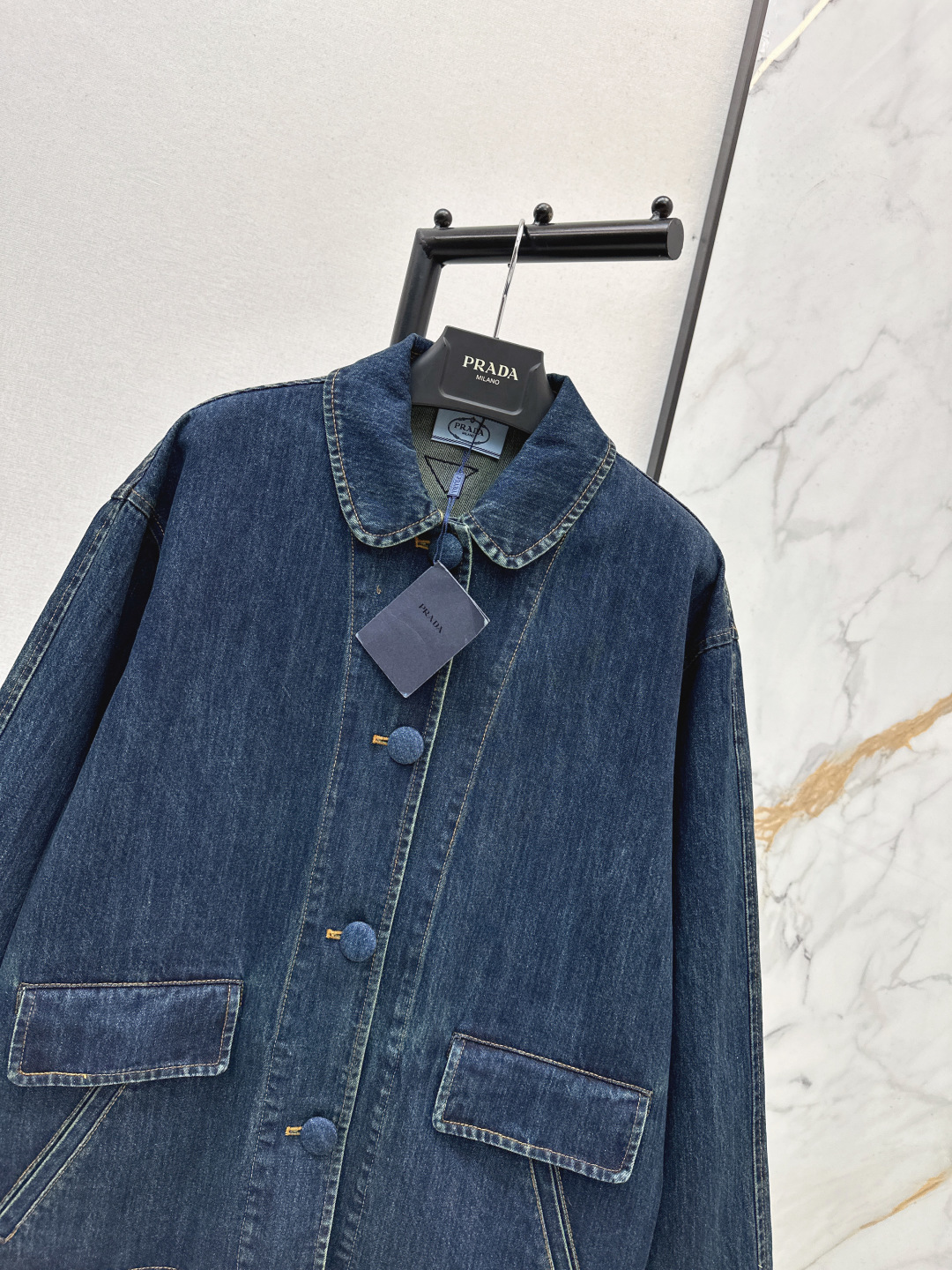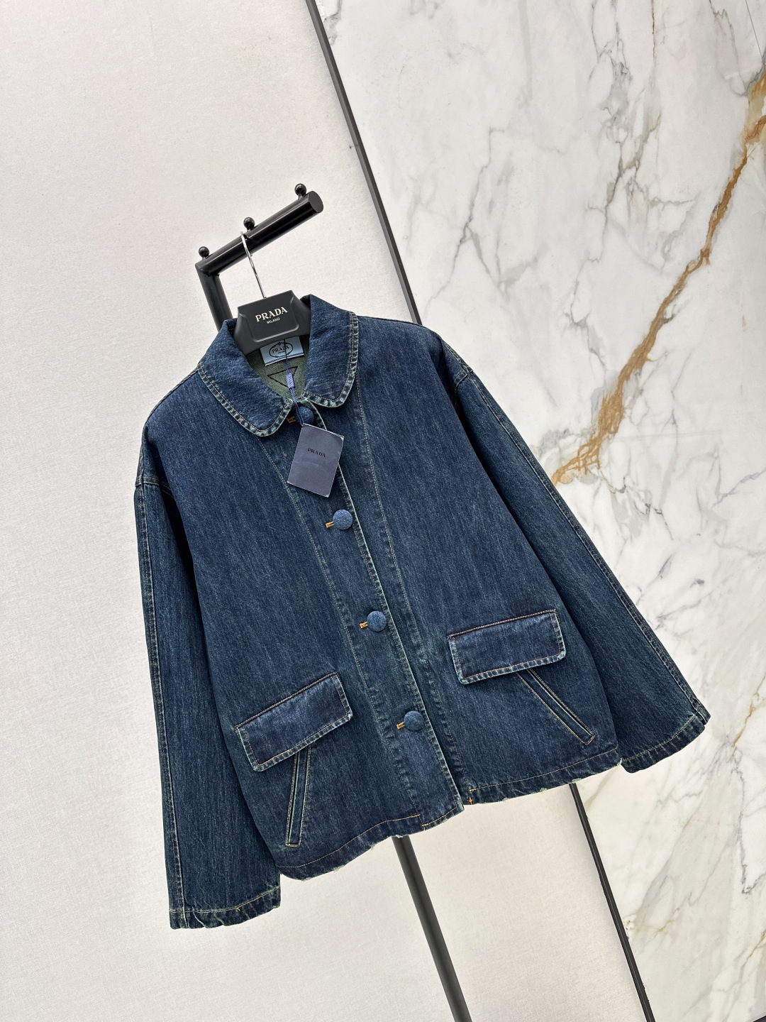 Details: Early spring denim jacket with doll collar, loose H - shaped fit and cloth buttons. One color, three sizes.