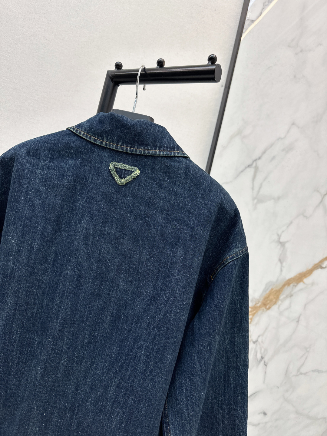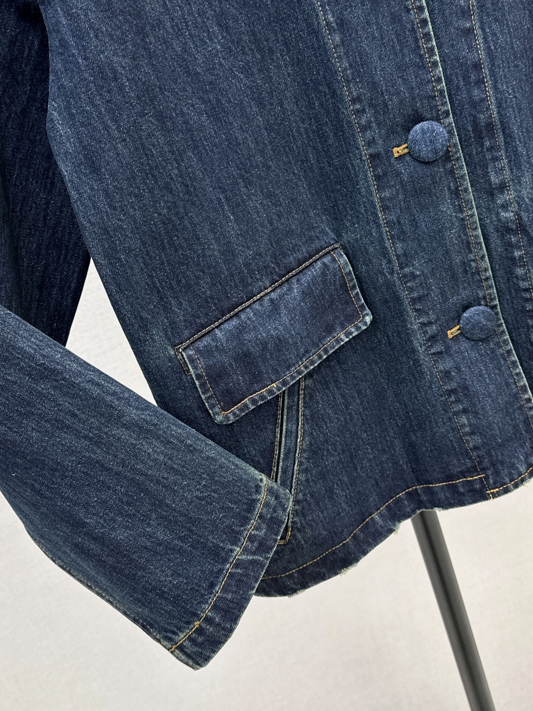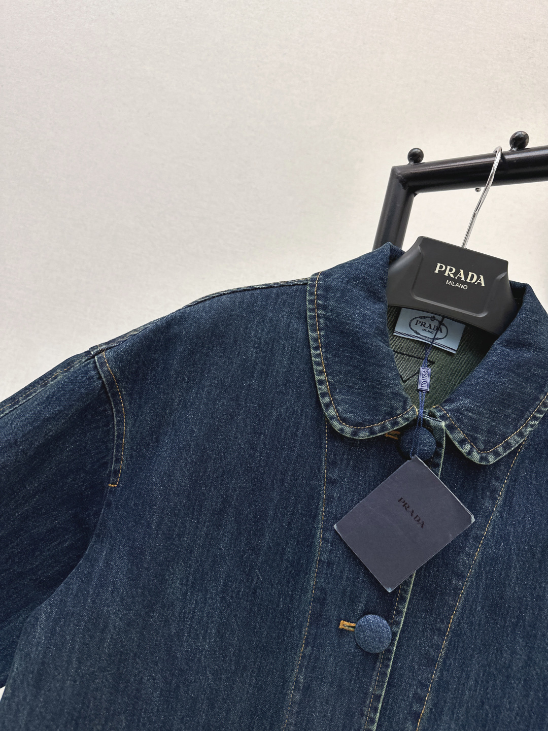 Details: Early spring denim jacket with doll collar, loose H - shaped fit and cloth buttons. One color, three sizes.