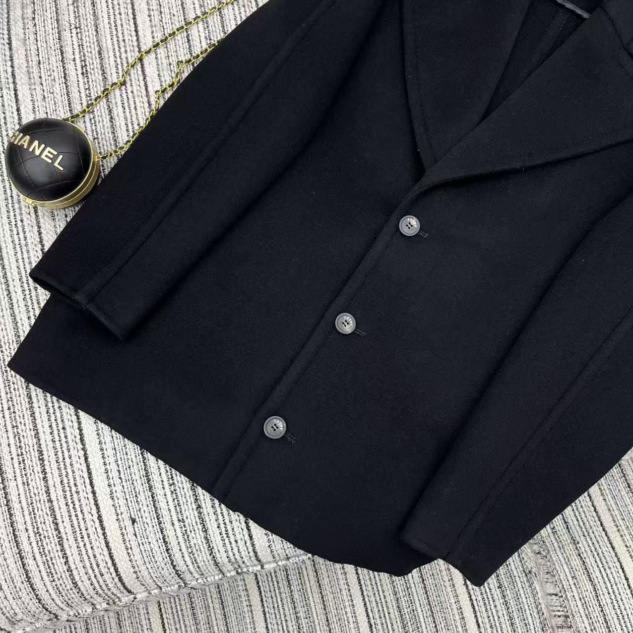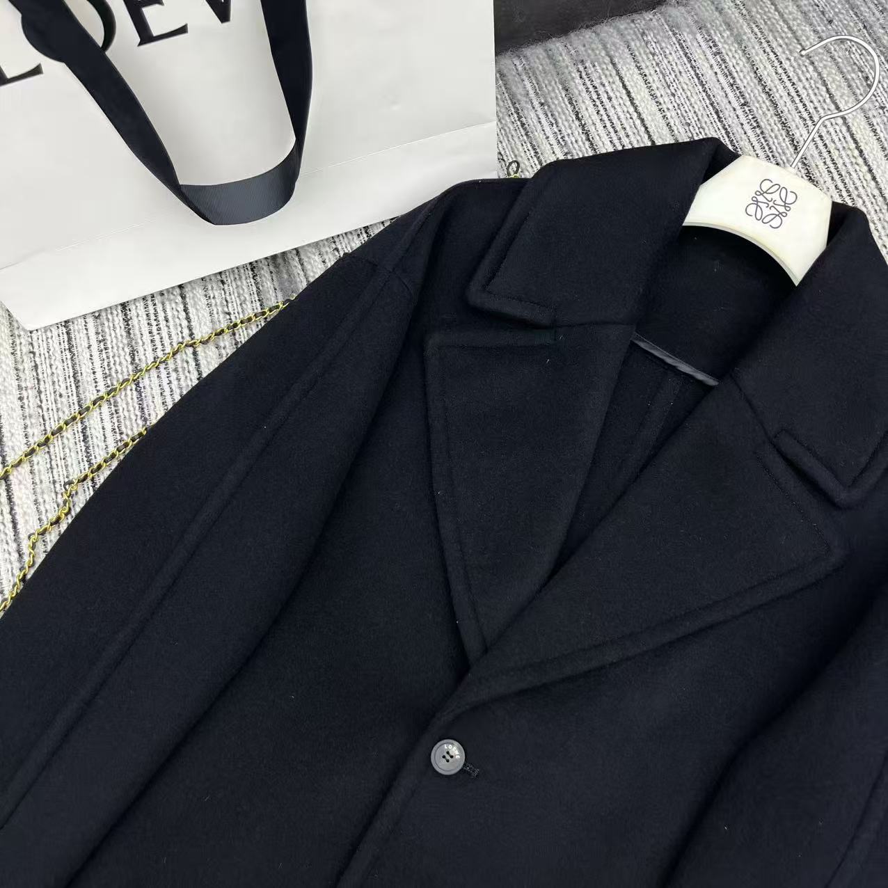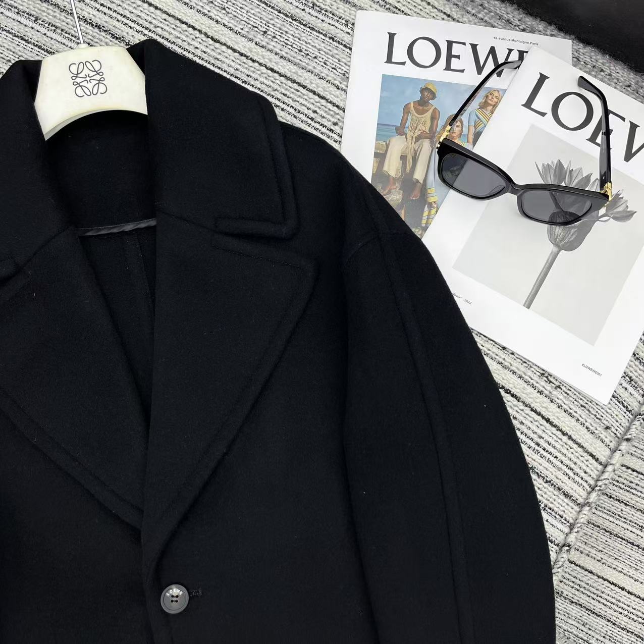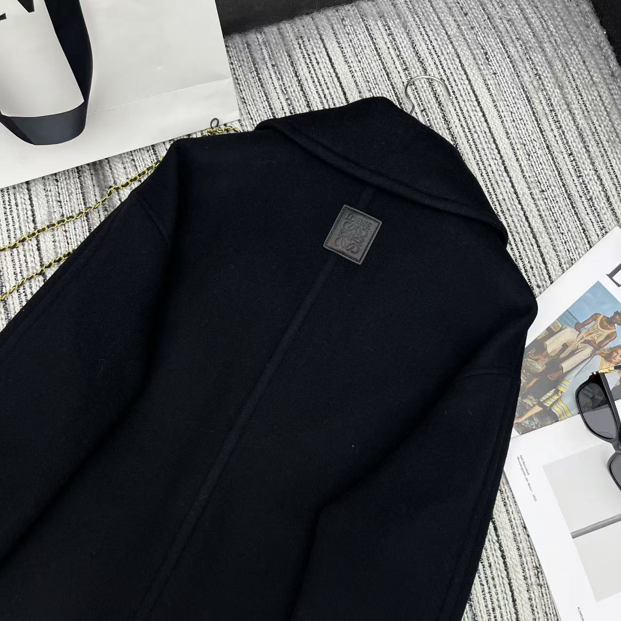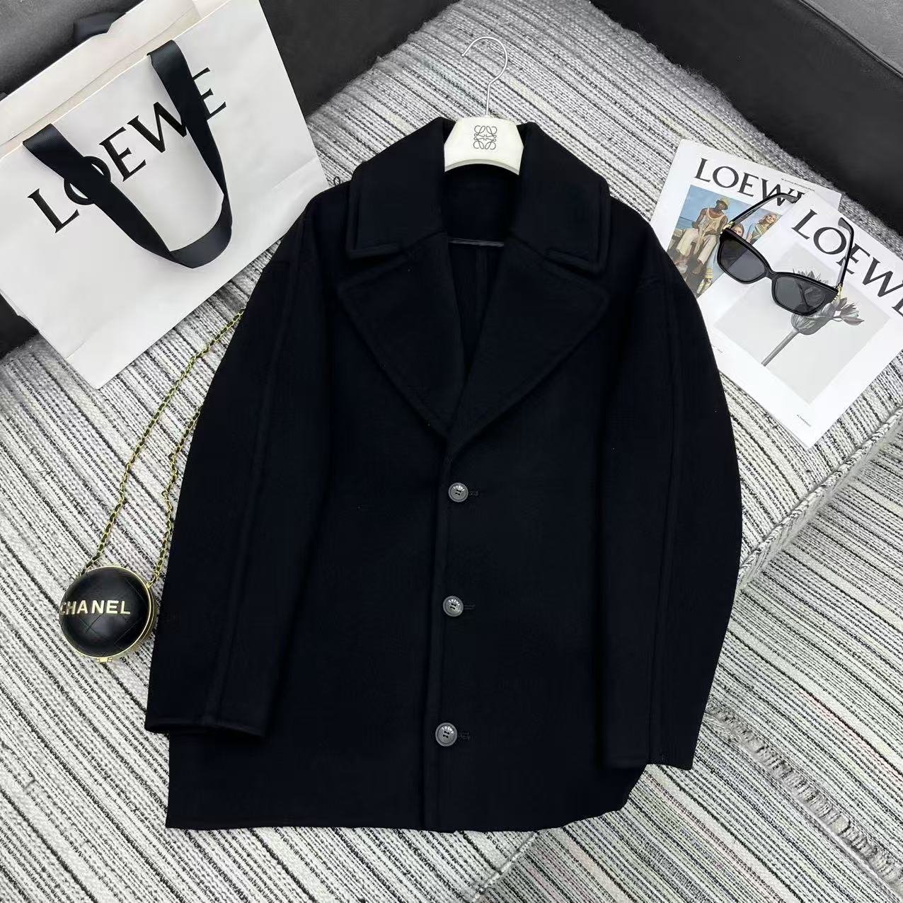 Details: Highly recommended early autumn and winter double-sided woolen overcoat with large lapel and logo embossed leather label, available in two colors and sizes SML