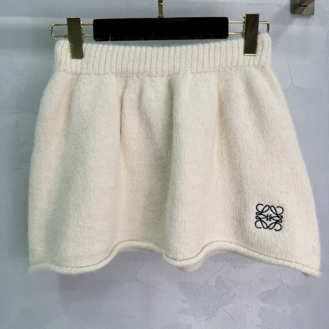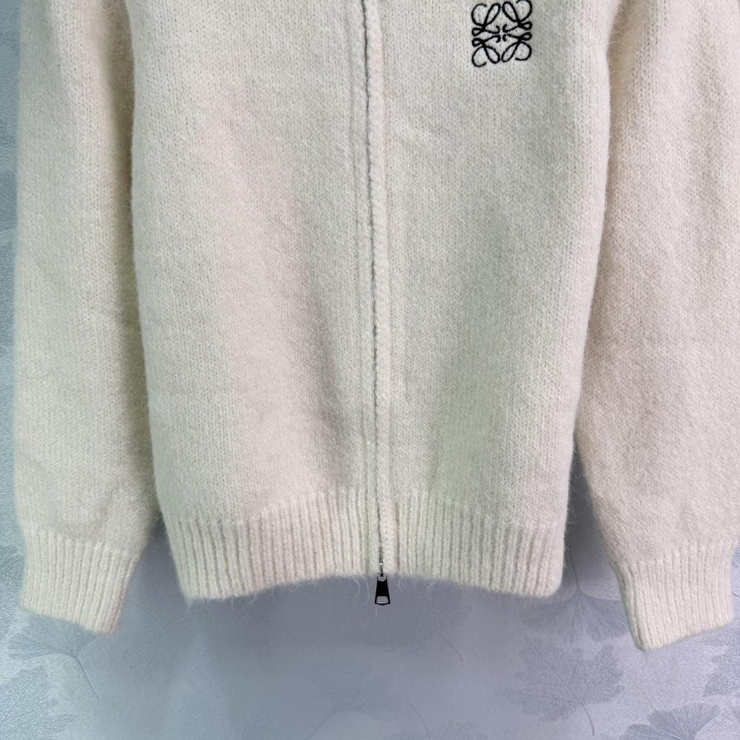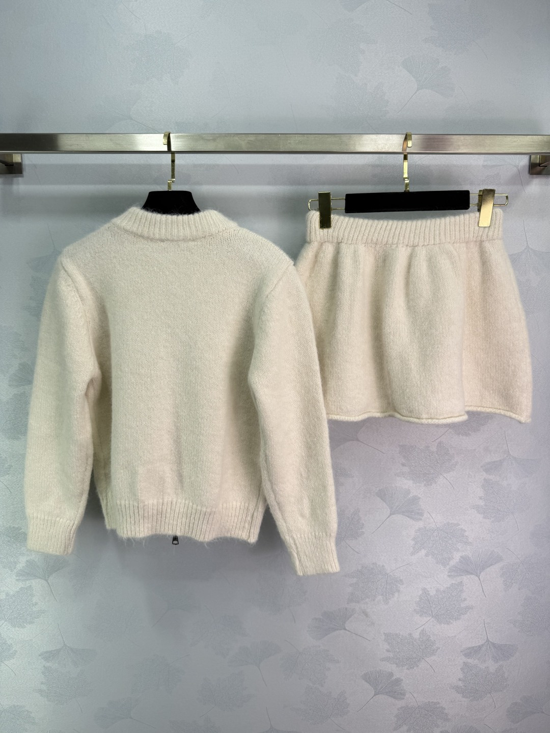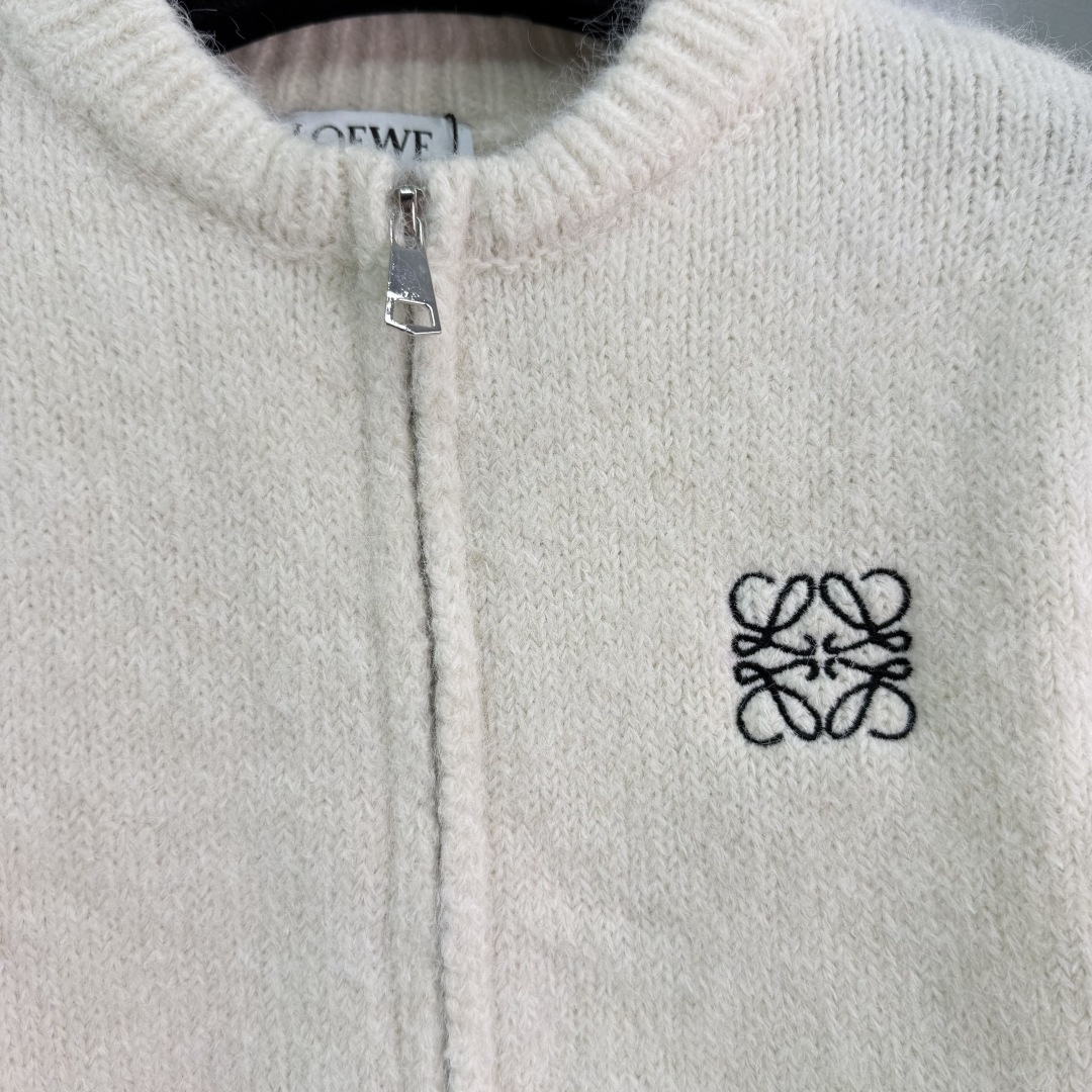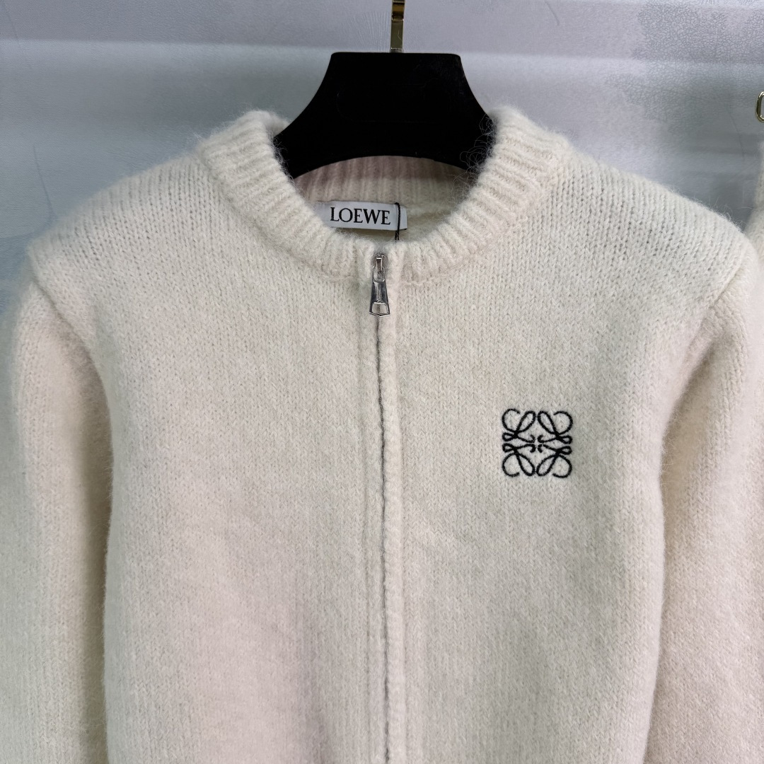 Details: Wool knit set in gray and off-white, zip-up cardigan and skirt, delicate logo embroidery, soft and comfortable for autumn and winter.